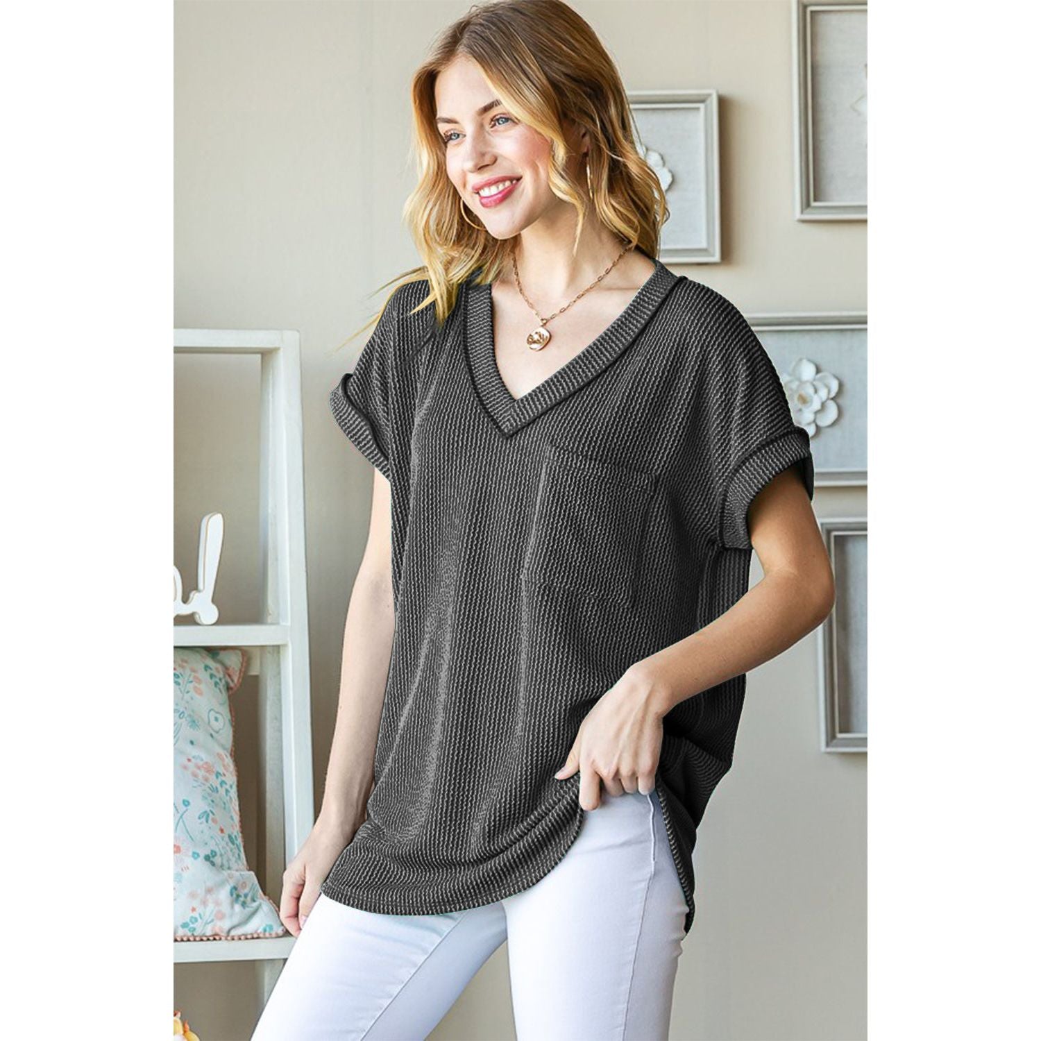 Heimish Full Size Front Pocket Short Sleeve Ribbed Top