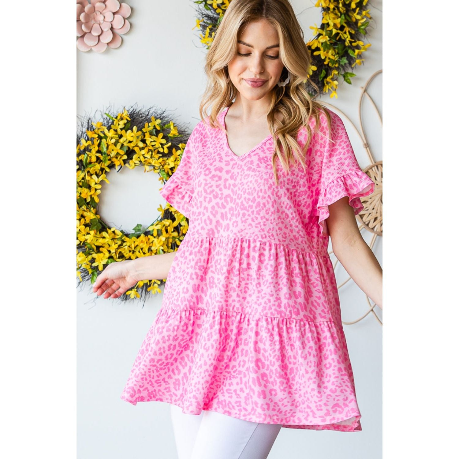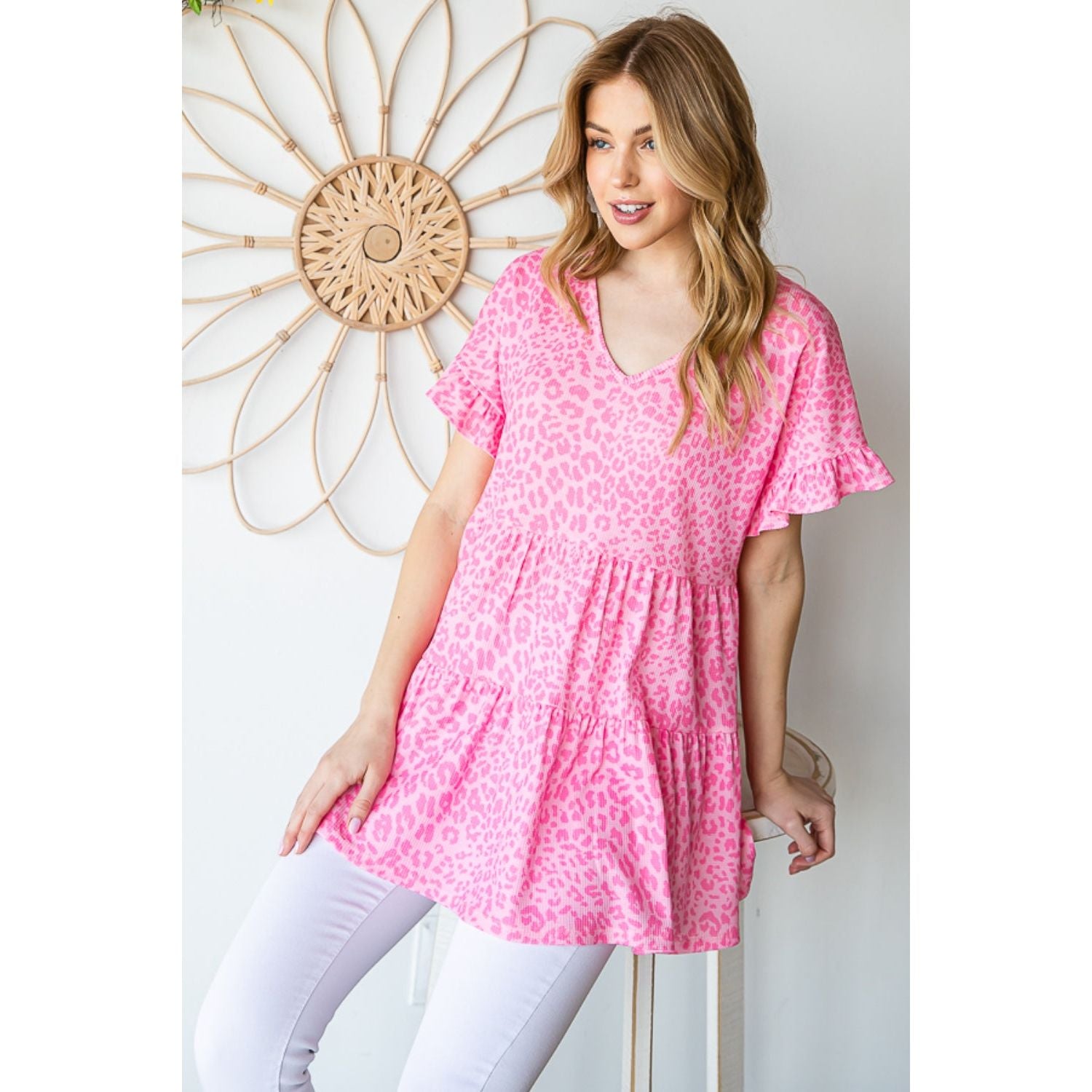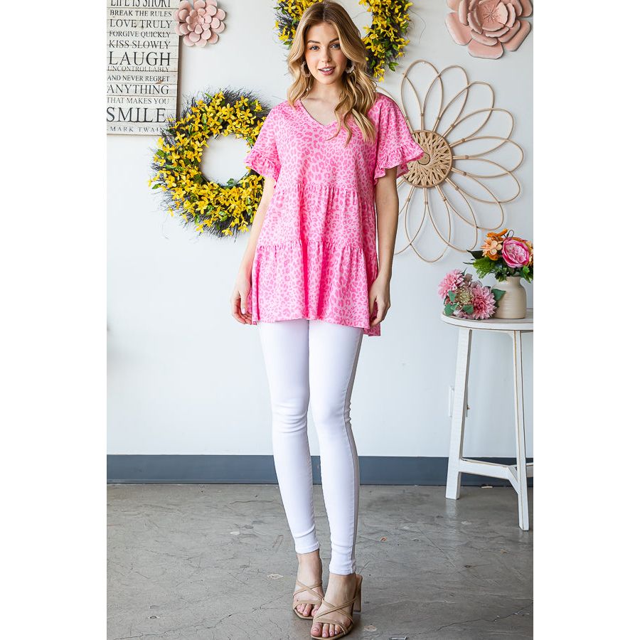 The Leopard Ruffle Trim Short Sleeve Top is a fierce and fashionable choice for any occasion. The leopard print adds a bold and trendy touch, while the ruffle trim adds a feminine and playful element. Pair it with jeans for a casual look or dress it up with a skirt for a night out.