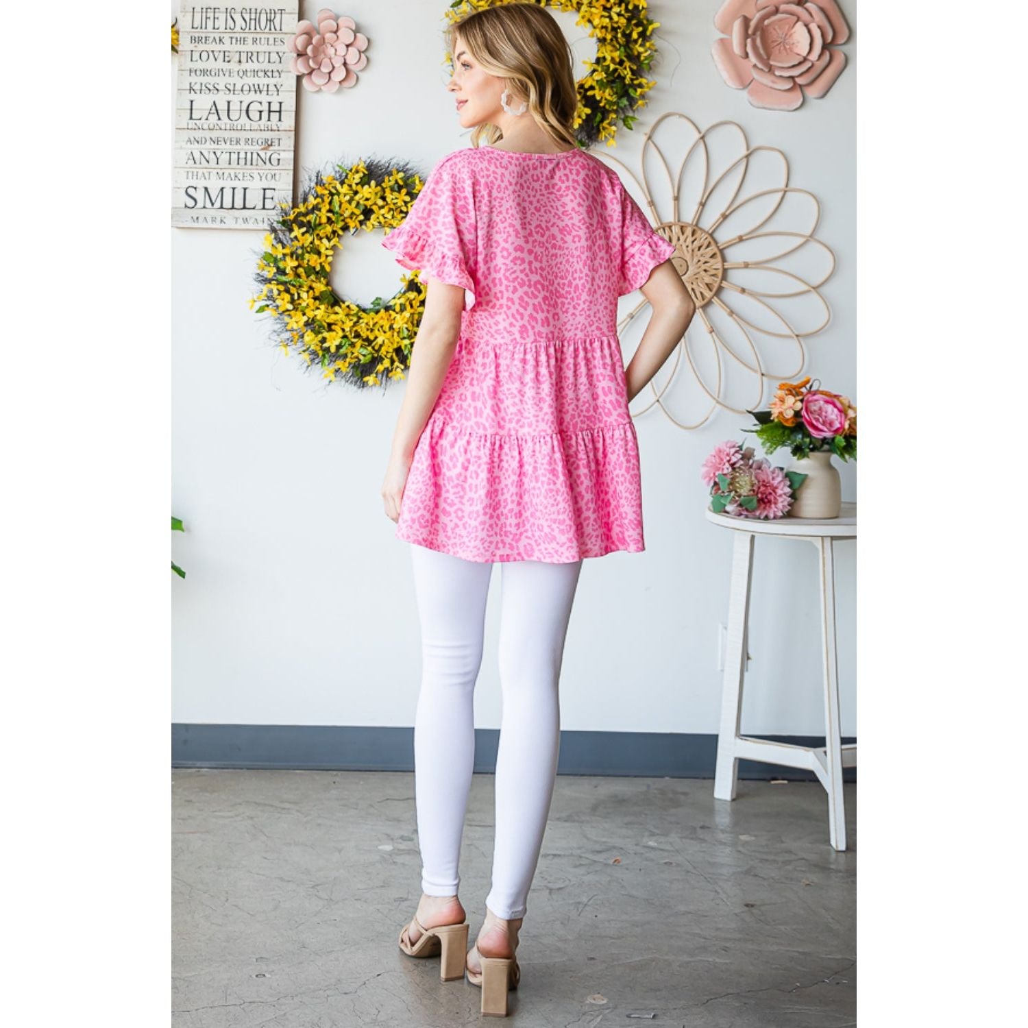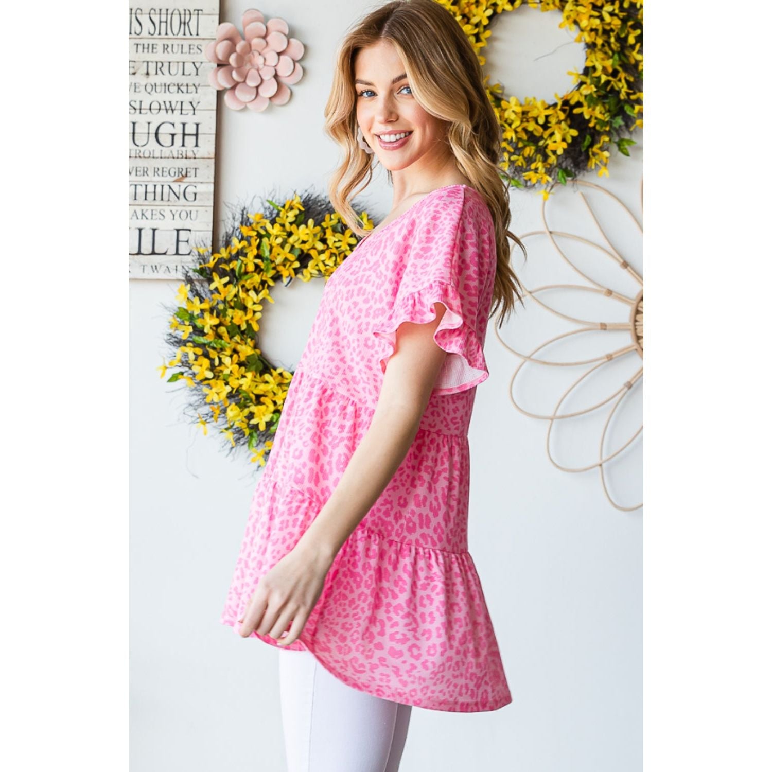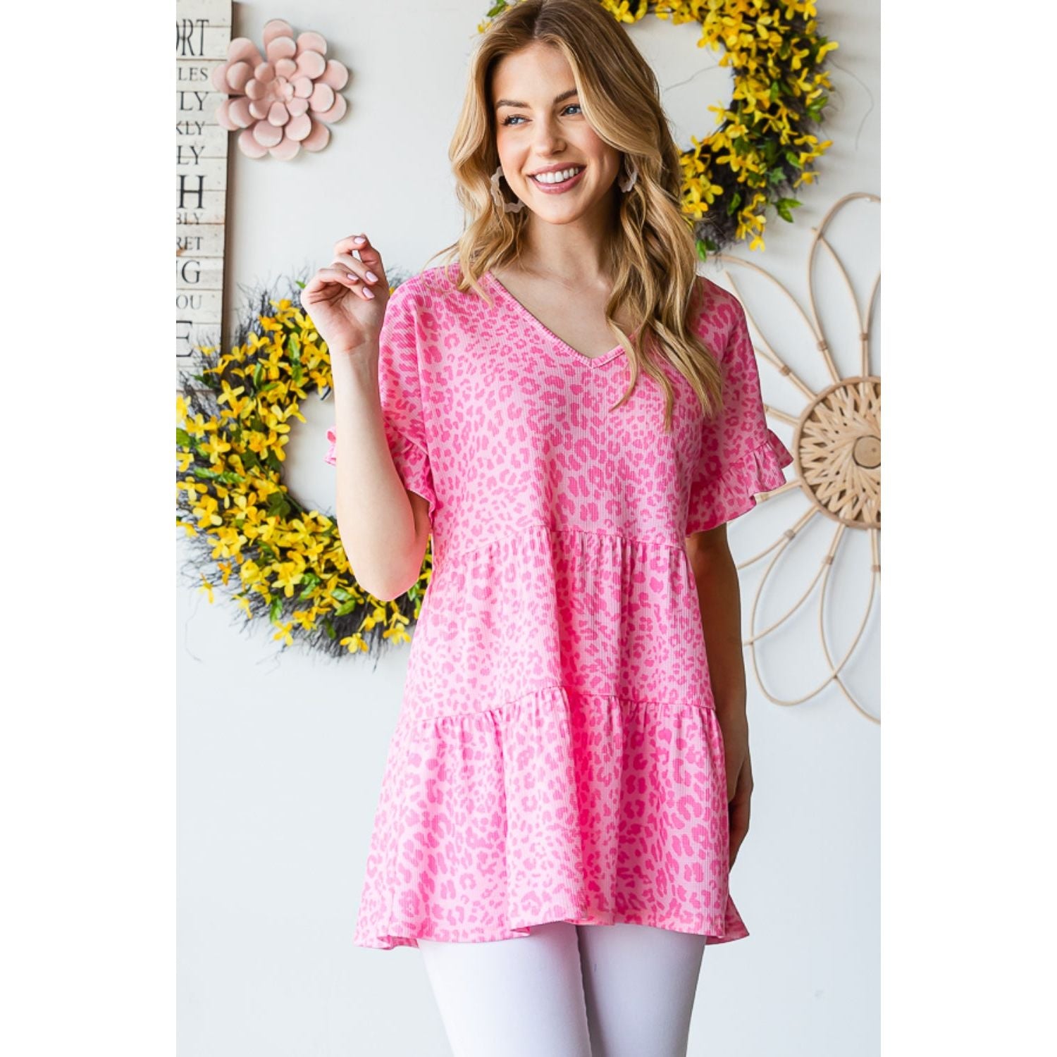 The Leopard Ruffle Trim Short Sleeve Top is a fierce and fashionable choice for any occasion. The leopard print adds a bold and trendy touch, while the ruffle trim adds a feminine and playful element. Pair it with jeans for a casual look or dress it up with a skirt for a night out.