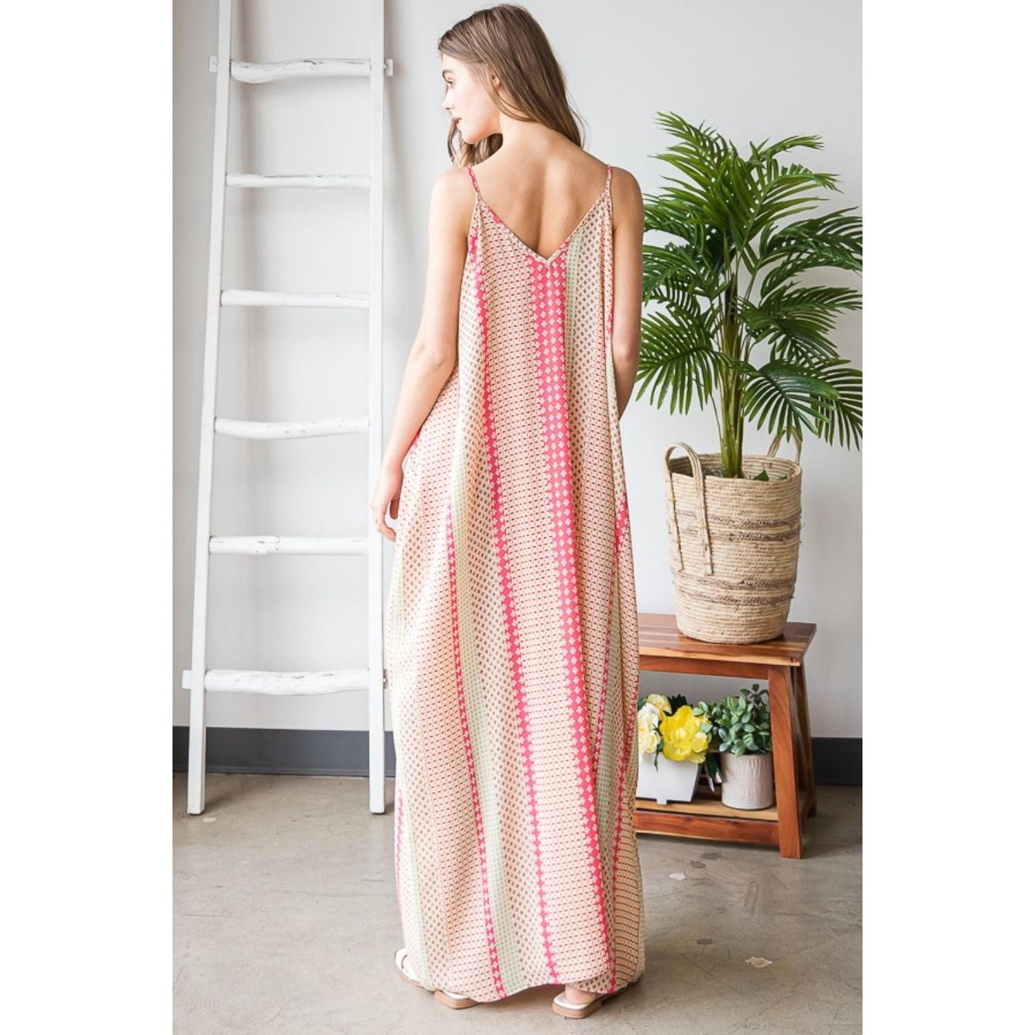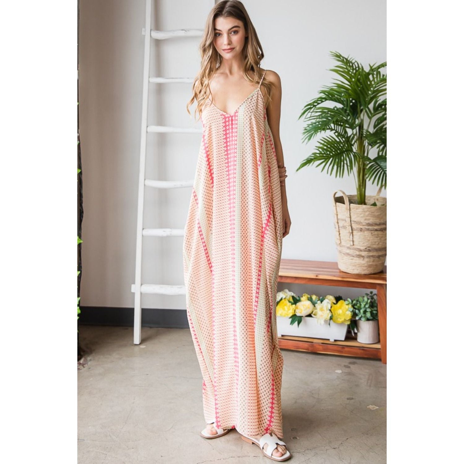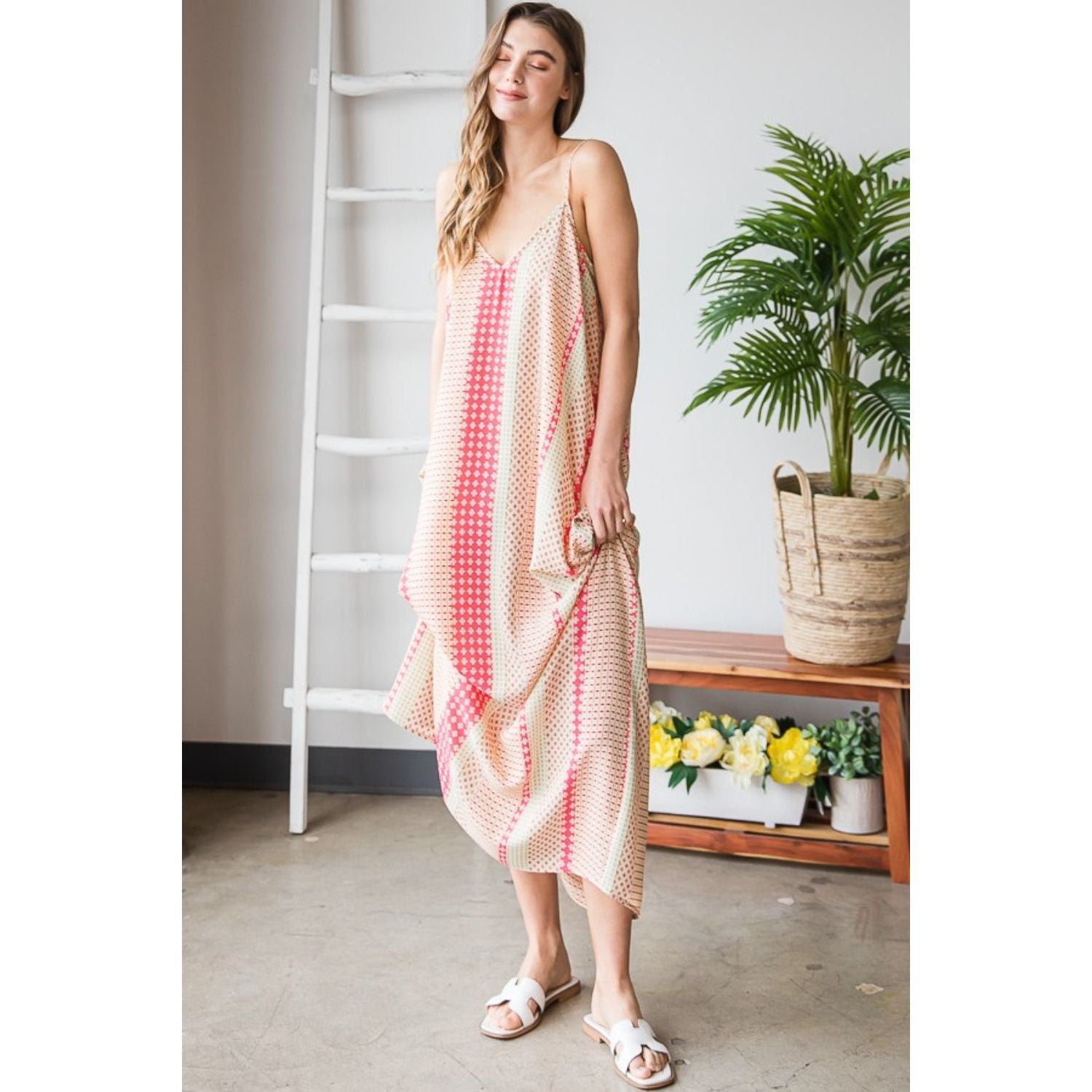 The Printed Maxi Cami Dress with Pockets is a stylish and practical choice for any occasion. Featuring a vibrant print, this dress adds a pop of color and personality to your wardrobe. The cami style and maxi length create a flowy and flattering silhouette that is perfect for warm weather. With the addition of pockets, this dress combines fashion and functionality for added convenience. Made from lightweight and comfortable fabric, it is ideal for all-day wear. Whether you're heading to a summer BBQ or a beach party, this printed maxi cami dress is a versatile option that will keep you looking chic and feeling comfortable.