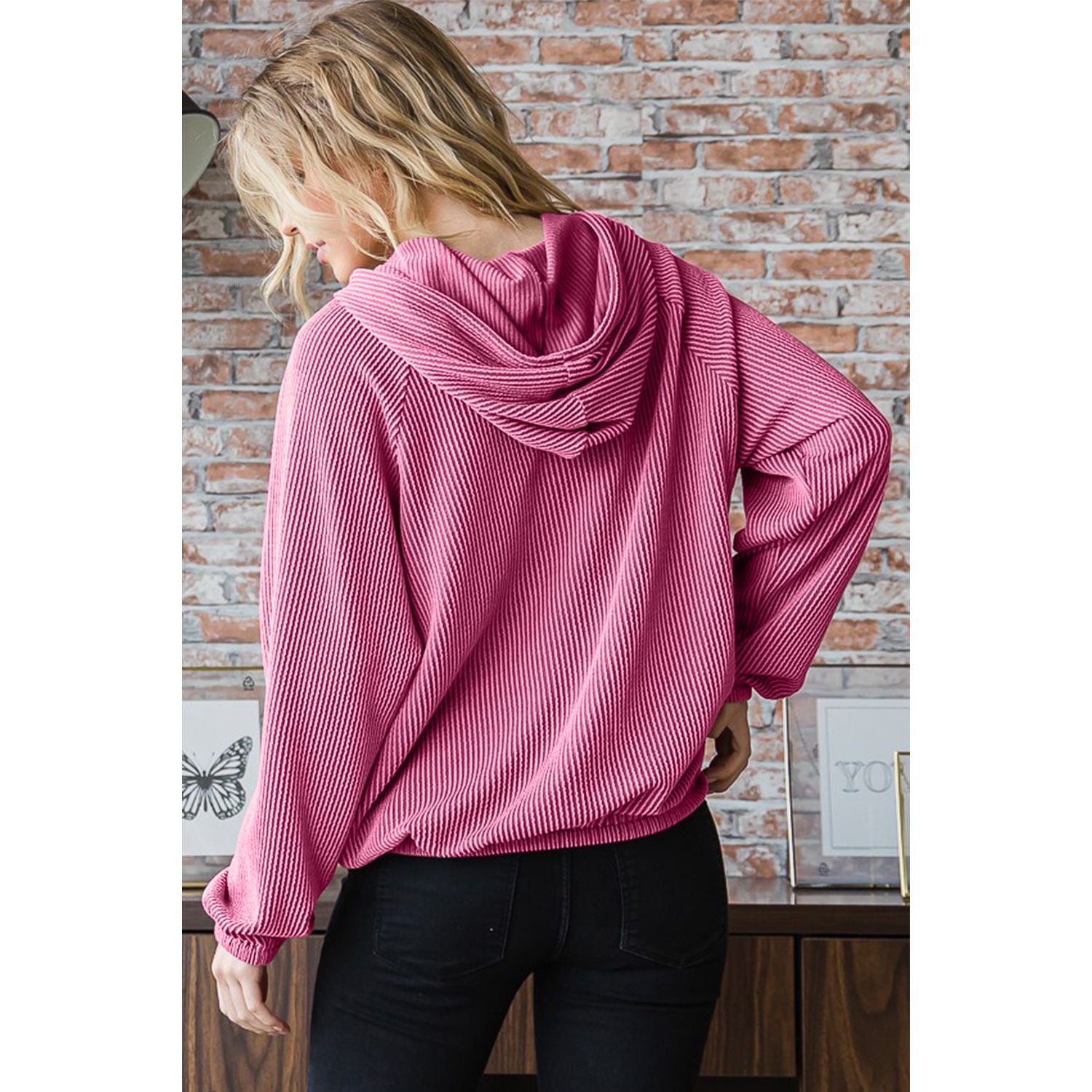 The Long Sleeve Drawstring Solid Urban Ribbed Hoodie is stylish and comfortable. With long sleeves and a drawstring hood, this hoodie exudes a laid-back urban vibe. The ribbed texture adds a touch of sophistication to the casual style. Completed with a kangaroo pocket and elastic band detail, this hoodie is both practical and trendy. This top is a versatile piece for everyday wear, perfect for cozy and fashionable outfits. Stay stylish and comfortable with this chic ribbed hoodie top featuring modern details.
