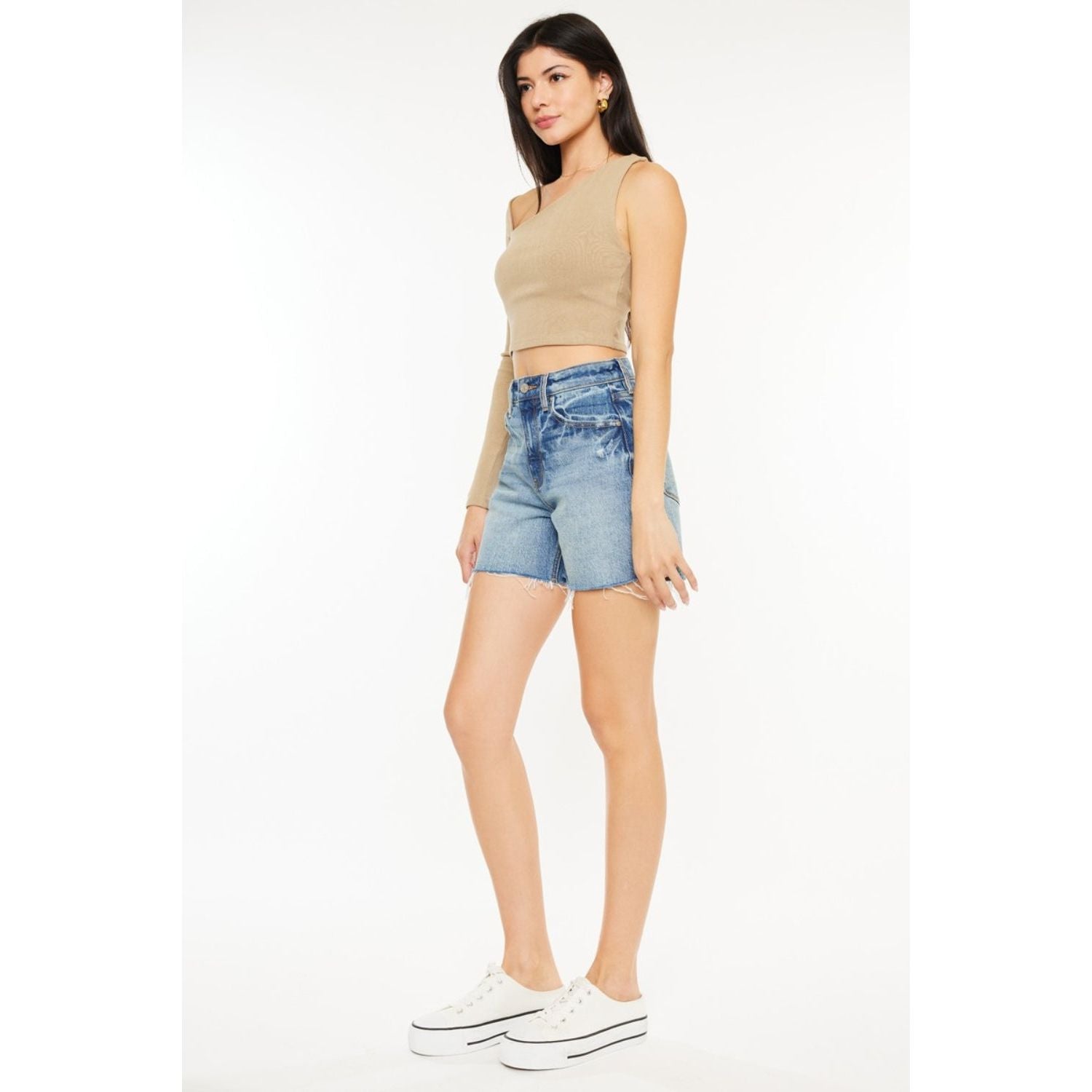 The raw hem high-rise denim shorts are simple and elegant, showing off a stylish casual vibe. The exposed edges add a touch of personality and style, making it suitable for trend lovers. Pair it with a simple top or a trendy jacket to create a variety of different styles. Whether you're out shopping or partying with friends, these shorts are the perfect choice to exude confidence and style.
