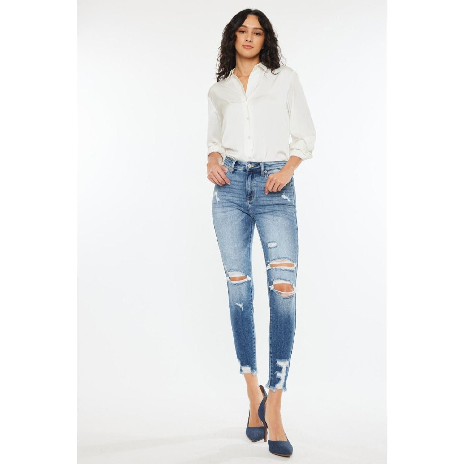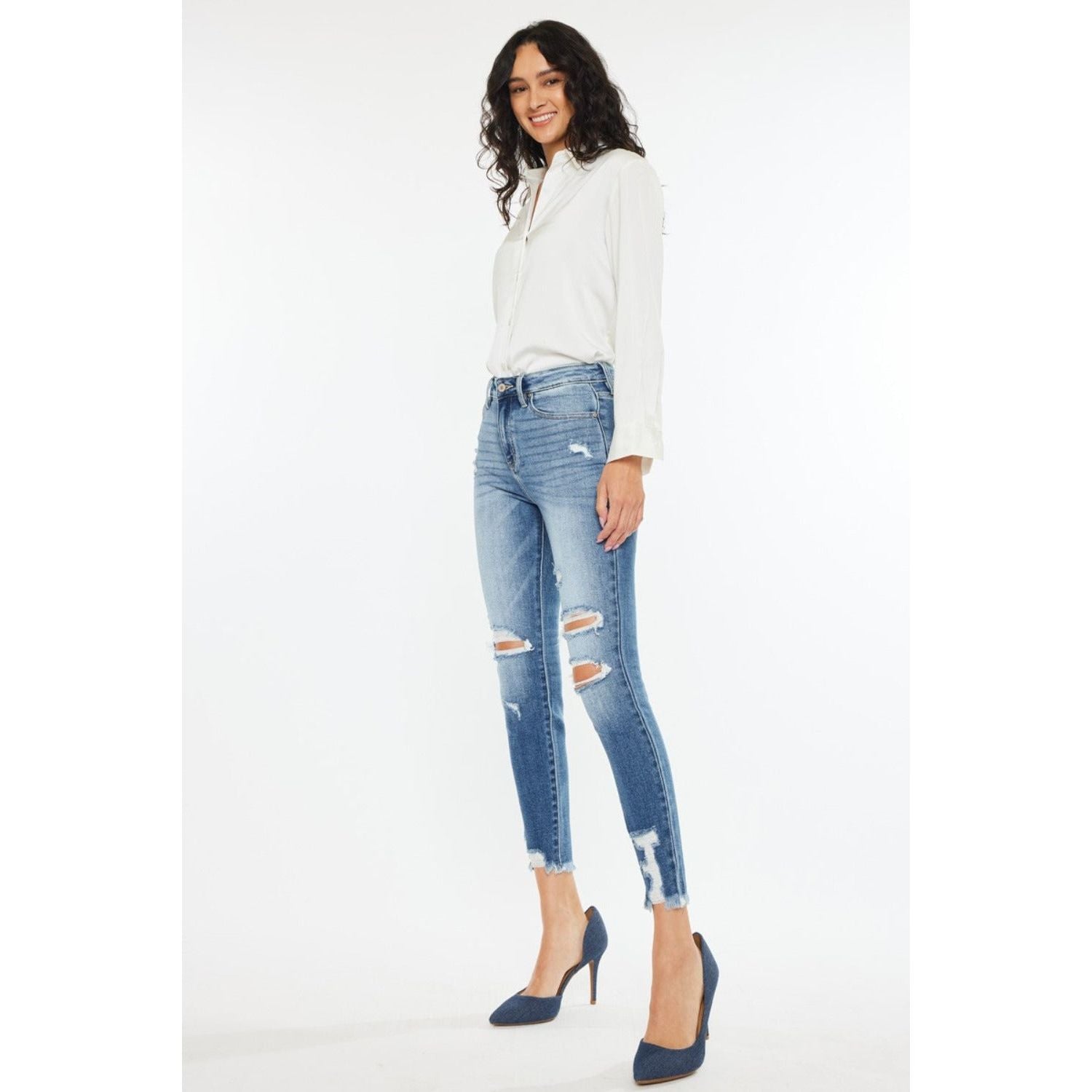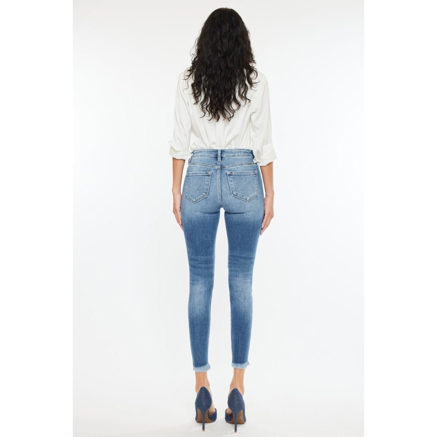 The High Rise Frayed Ankle Skinny Jeans in a medium wash is a trendy and versatile addition to your denim collection. Crafted with stretch denim, these jeans offer a comfortable and flattering fit that moves with you. The distressed detailing adds a touch of edgy style, while the fray hem gives them a modern and casual look. With a zip fly closure, these denim skinny jeans are easy to slip on and wear all day long. Perfect for pairing with your favorite tops and shoes, these jeans are a versatile staple that can be dressed up or down for various occasions. Stay on-trend and effortlessly stylish with these high-rise ankle skinny jeans.