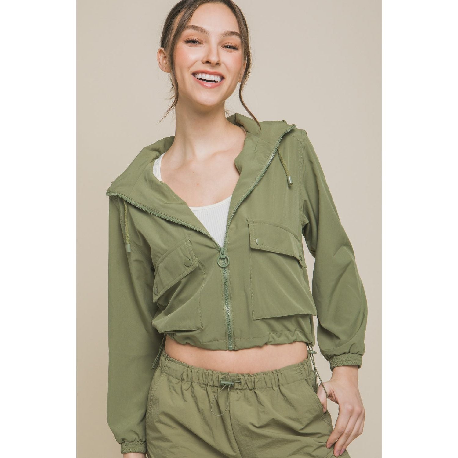 The drawstring hem hooded zip-up jacket combines style and functionality in a versatile outerwear piece. Featuring a hood and zip-up closure, this jacket offers added protection against the elements while adding a sporty touch to your look. The drawstring hem allows for an adjustable fit and adds a trendy, cinched detail to the jacket. Perfect for layering over outfits for a casual and cozy vibe, this jacket is a practical and stylish choice for everyday wear. Whether paired with jeans for a laid-back look or with leggings for a workout session, this jacket provides comfort and style. Elevate your wardrobe with the drawstring hem hooded zip-up jacket for a fashionable and functional addition to your closet.