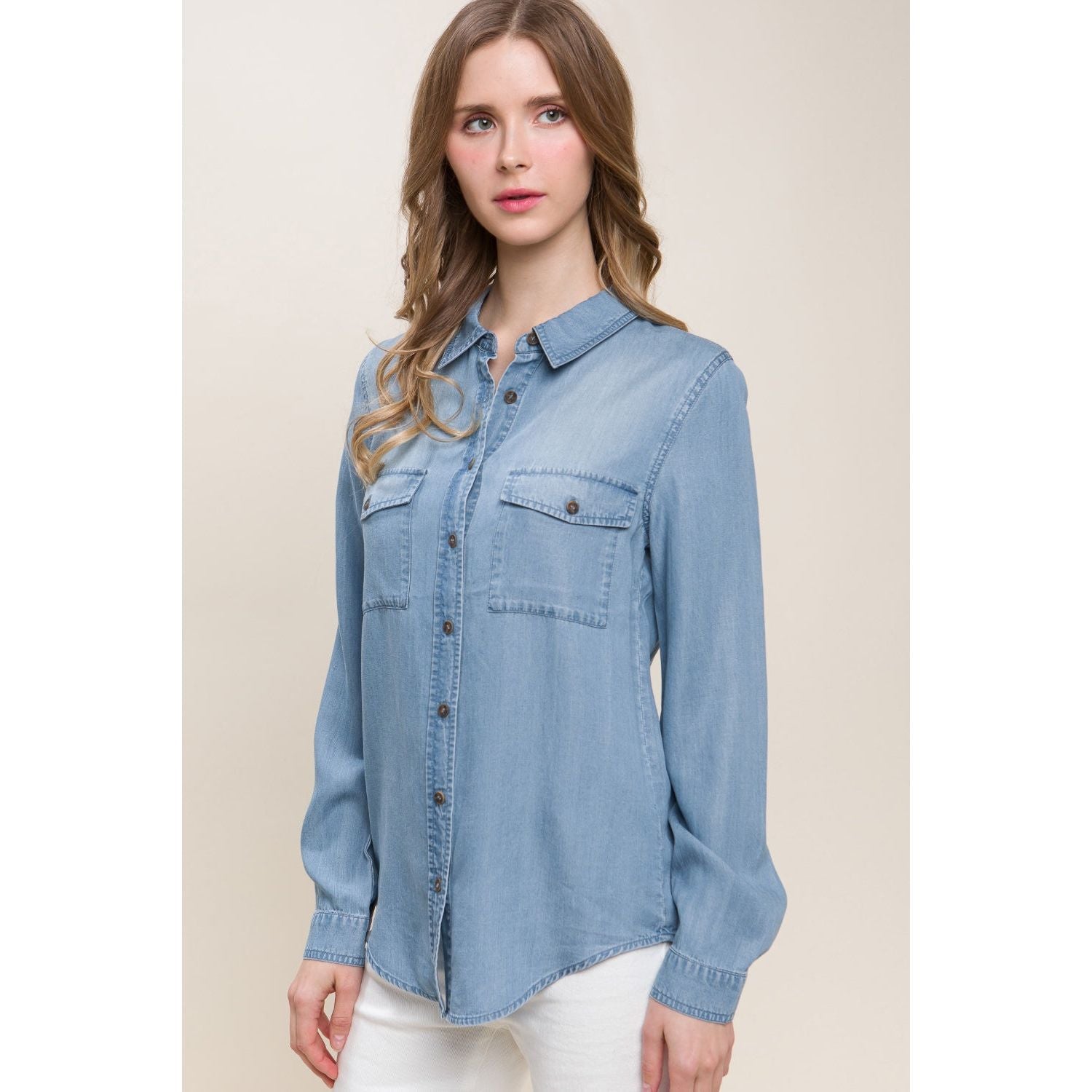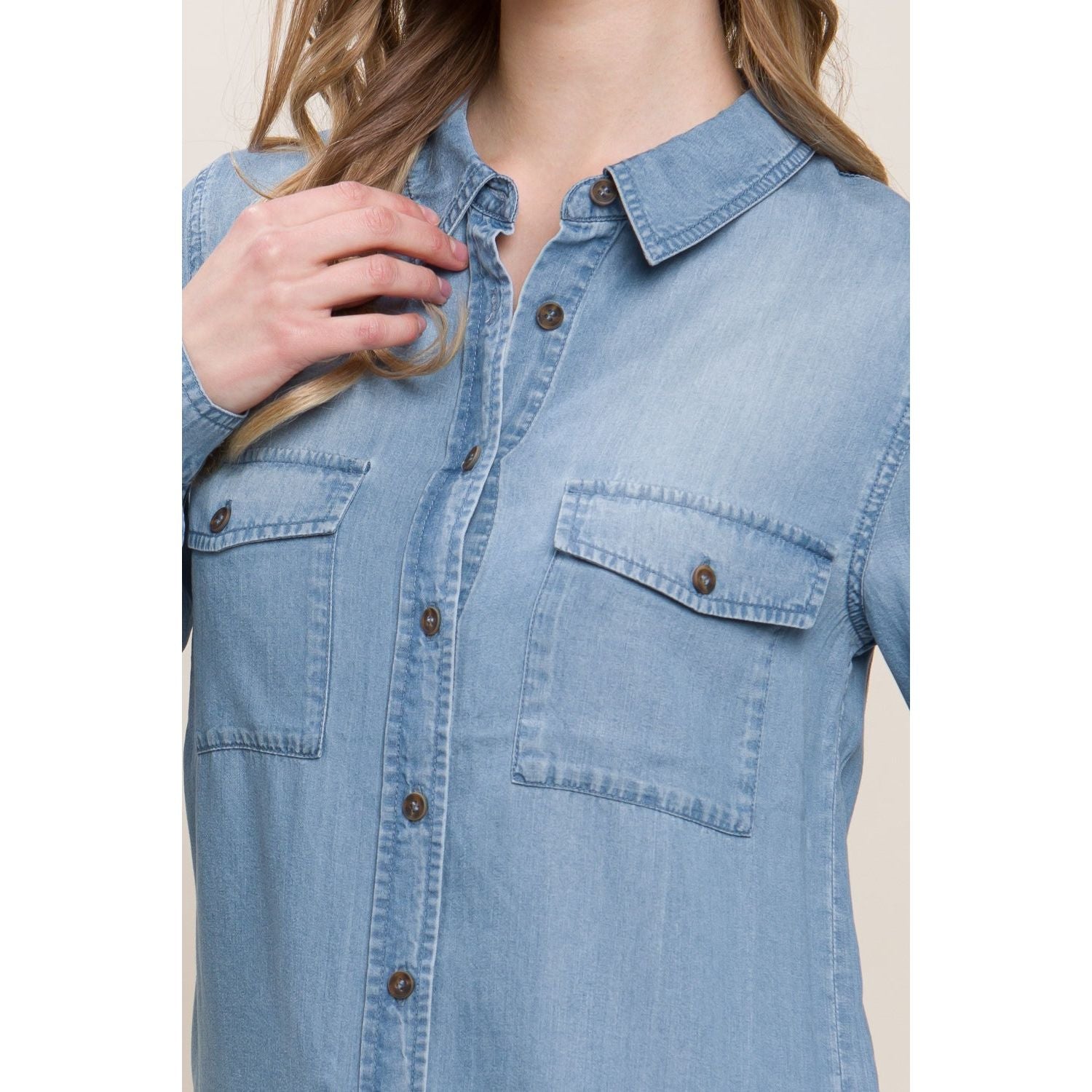 Love Tree Scooped Hem Button Up Denim Shirt
