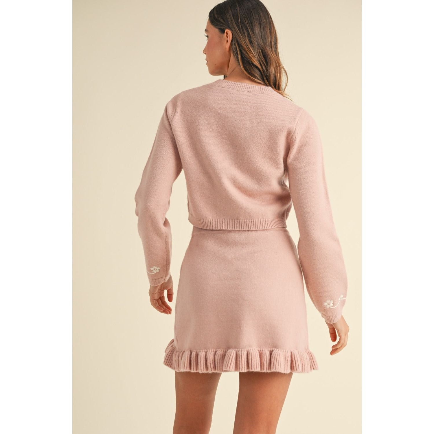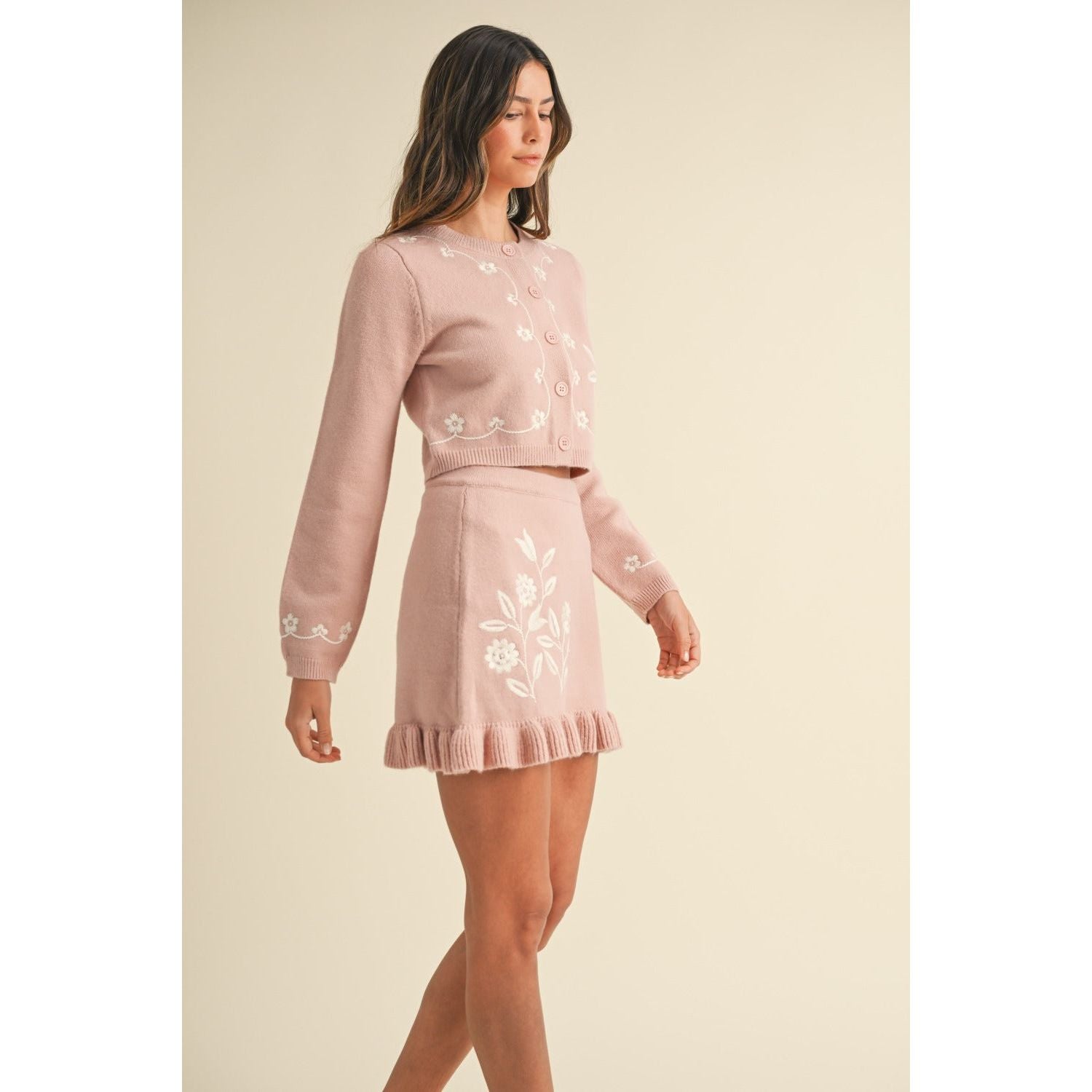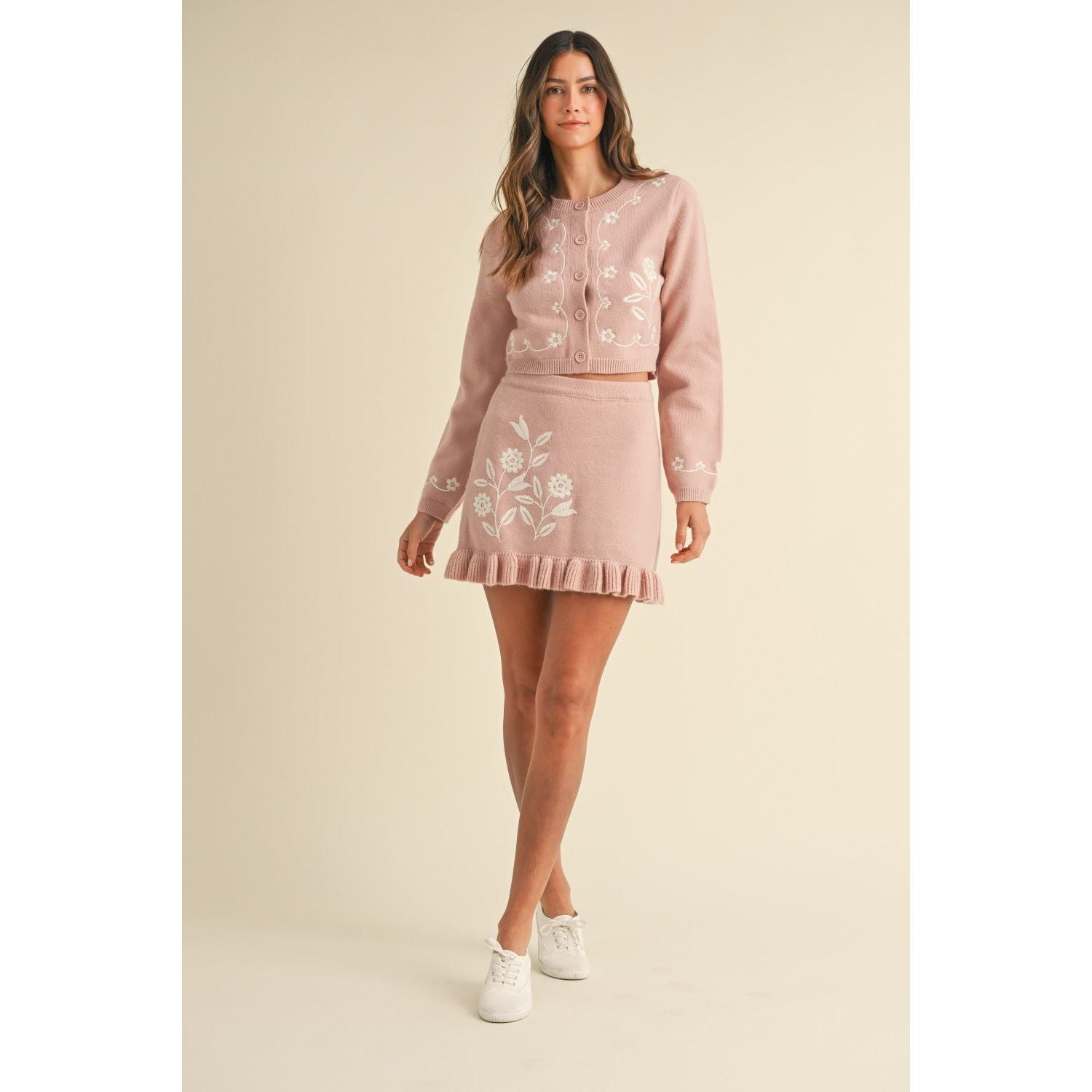 MABLE Floral Embroidered Crop Cardigan and Ruffled Mini Skirt Set