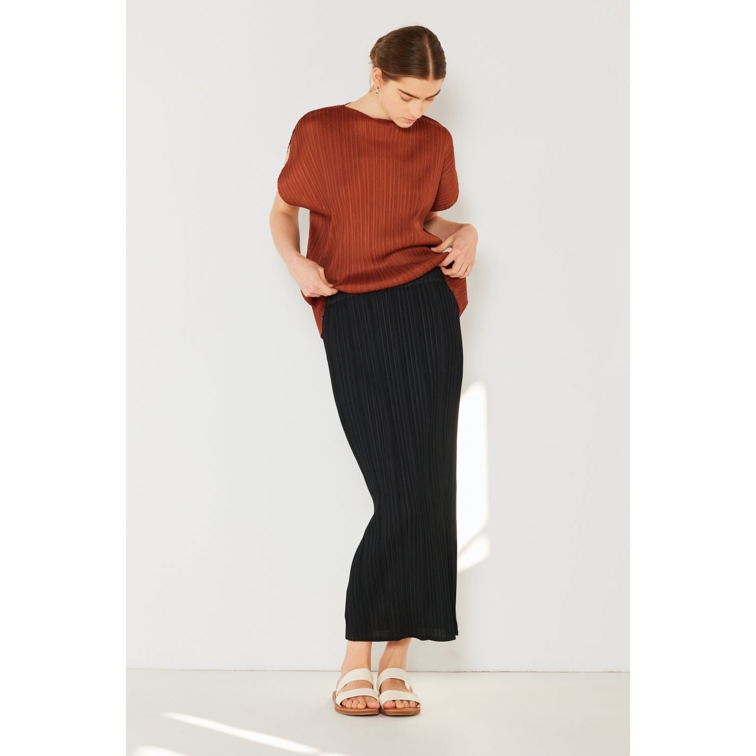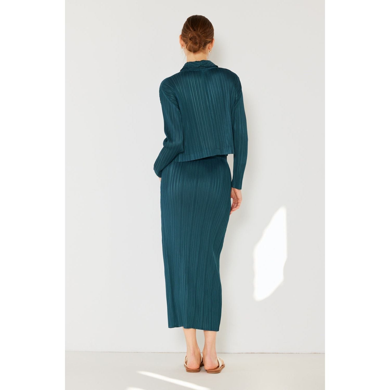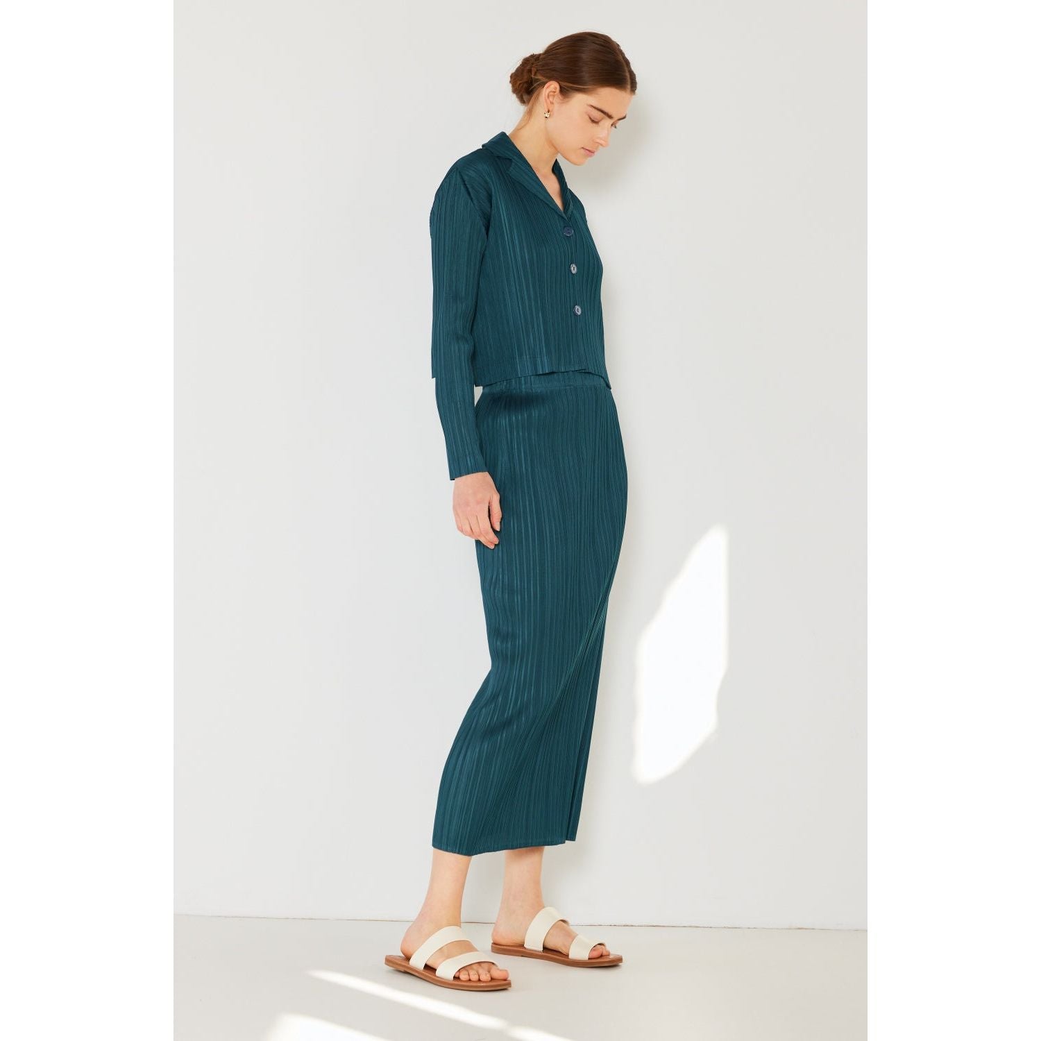 The pleated midi pencil skirt is a sophisticated and sleek option for a classic and polished look. The pleats add texture and dimension to the timeless pencil skirt silhouette. With a midi length, this skirt offers a contemporary and versatile style that can be dressed up or down. The pencil cut creates a flattering and tailored fit that accentuates the figure. This skirt is perfect for both professional settings and special occasions, offering a versatile and chic option for various outings. Overall, the pleated midi pencil skirt is a wardrobe staple that combines elegance, sophistication, and versatility seamlessly.