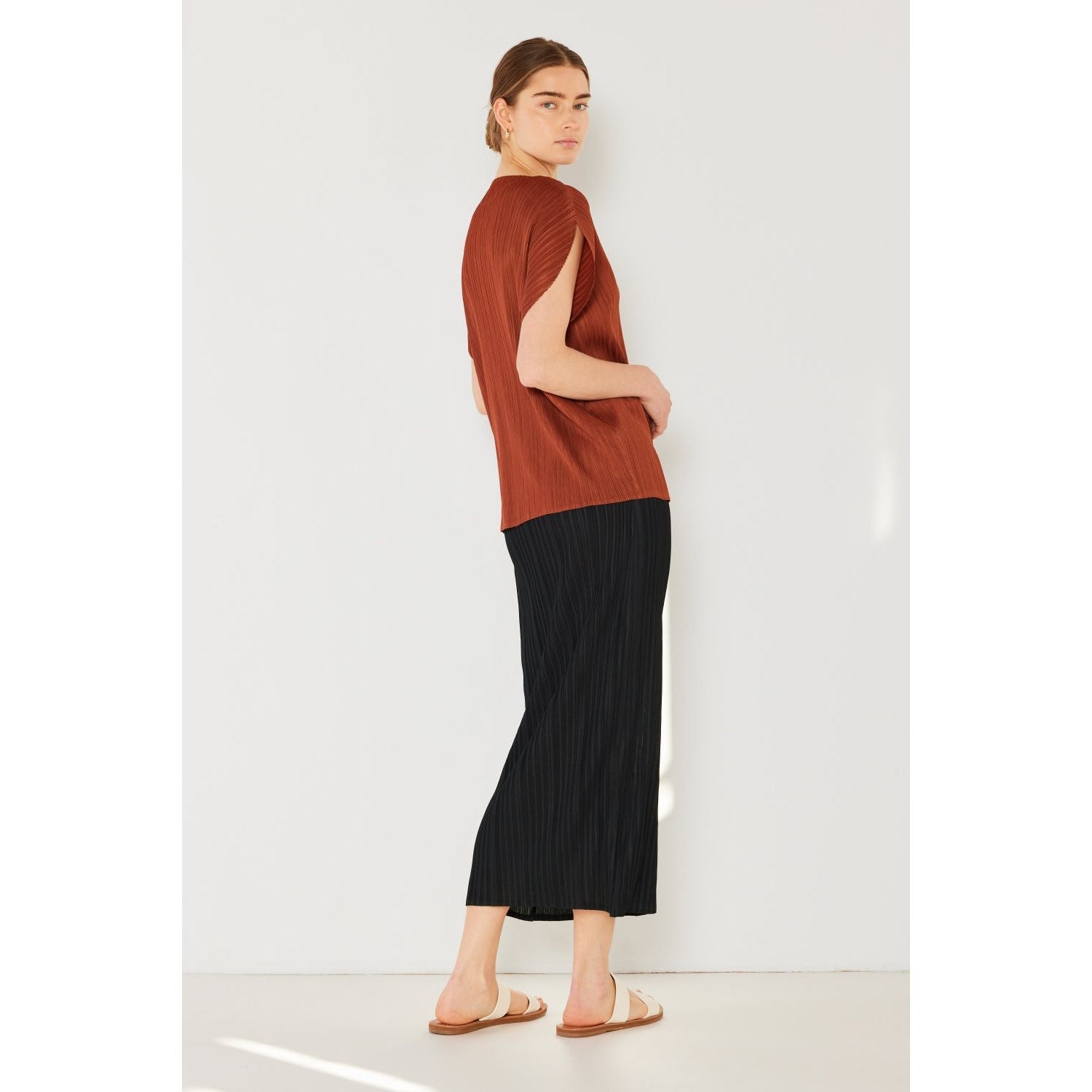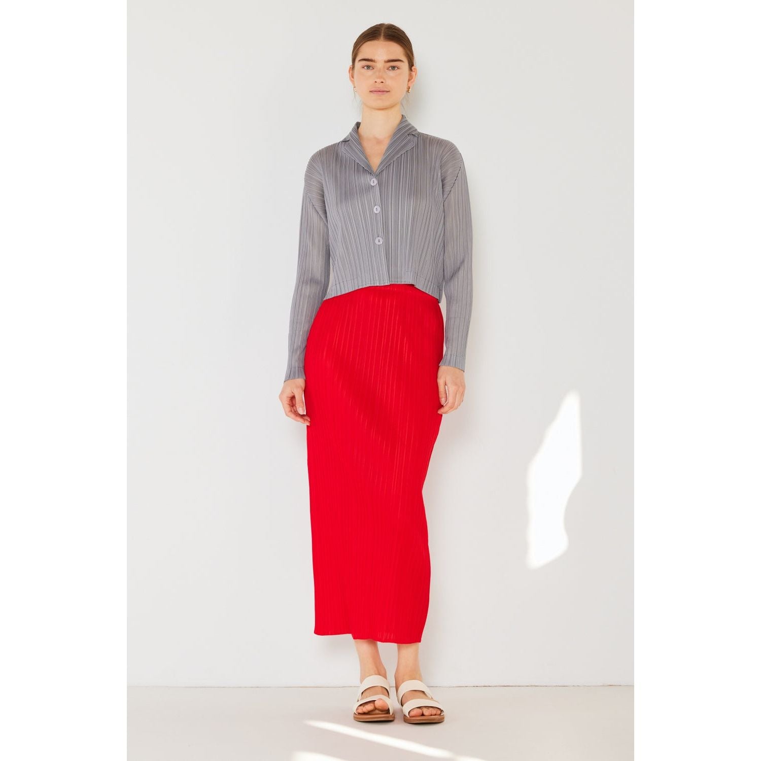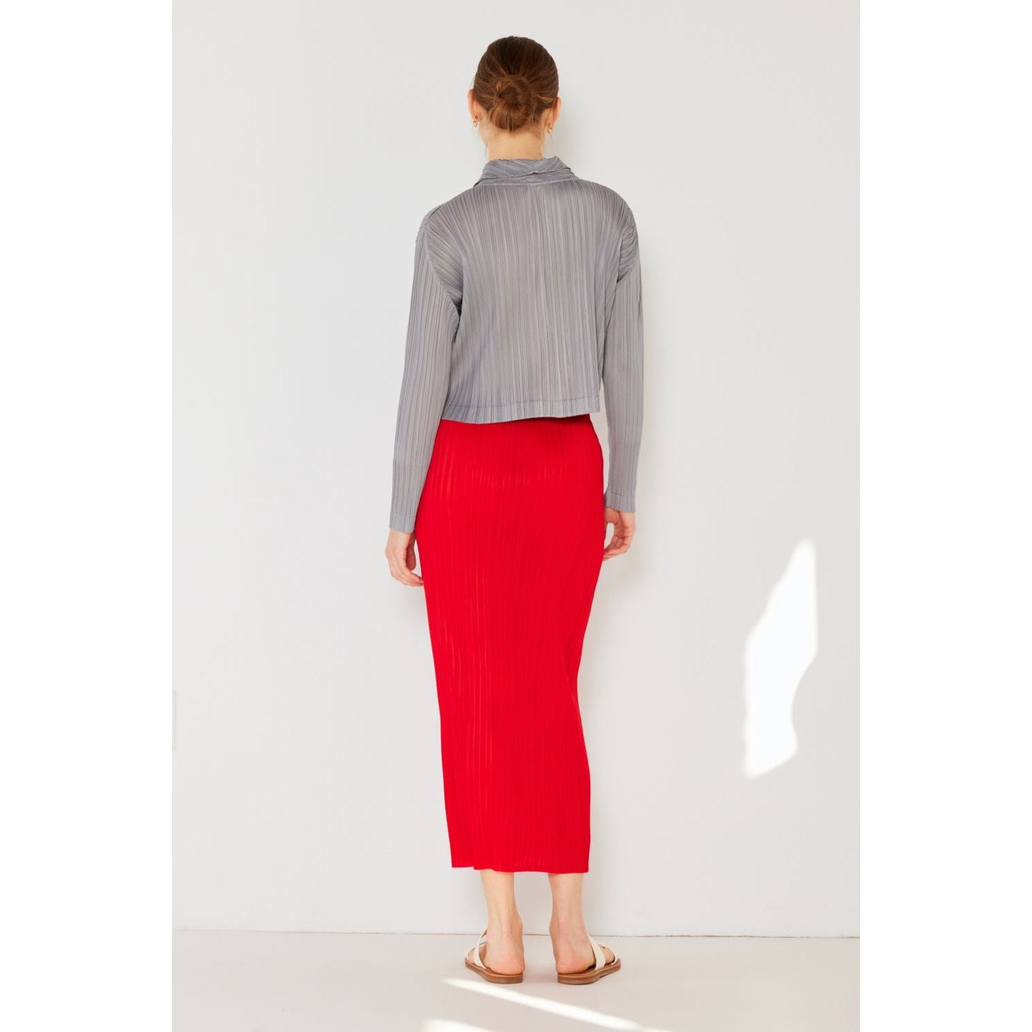 The pleated midi pencil skirt is a sophisticated and sleek option for a classic and polished look. The pleats add texture and dimension to the timeless pencil skirt silhouette. With a midi length, this skirt offers a contemporary and versatile style that can be dressed up or down. The pencil cut creates a flattering and tailored fit that accentuates the figure. This skirt is perfect for both professional settings and special occasions, offering a versatile and chic option for various outings. Overall, the pleated midi pencil skirt is a wardrobe staple that combines elegance, sophistication, and versatility seamlessly.