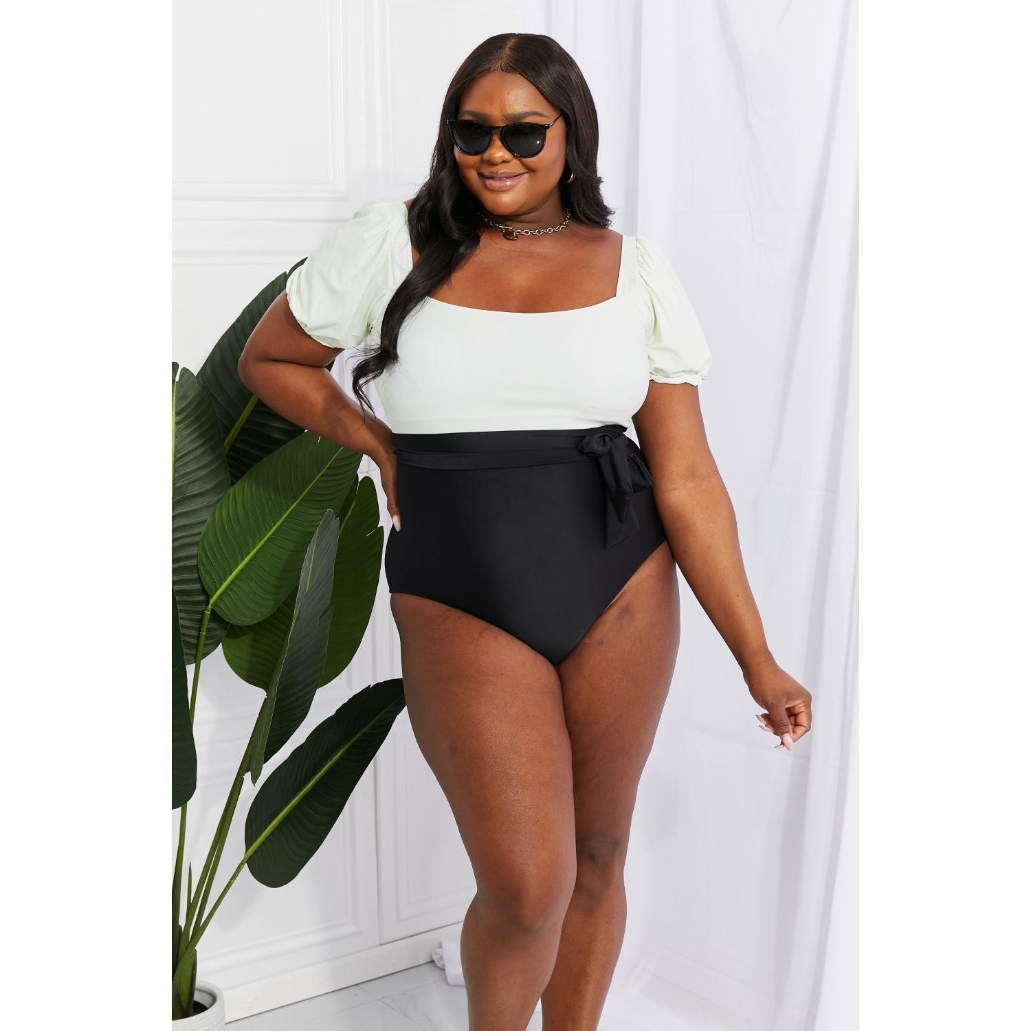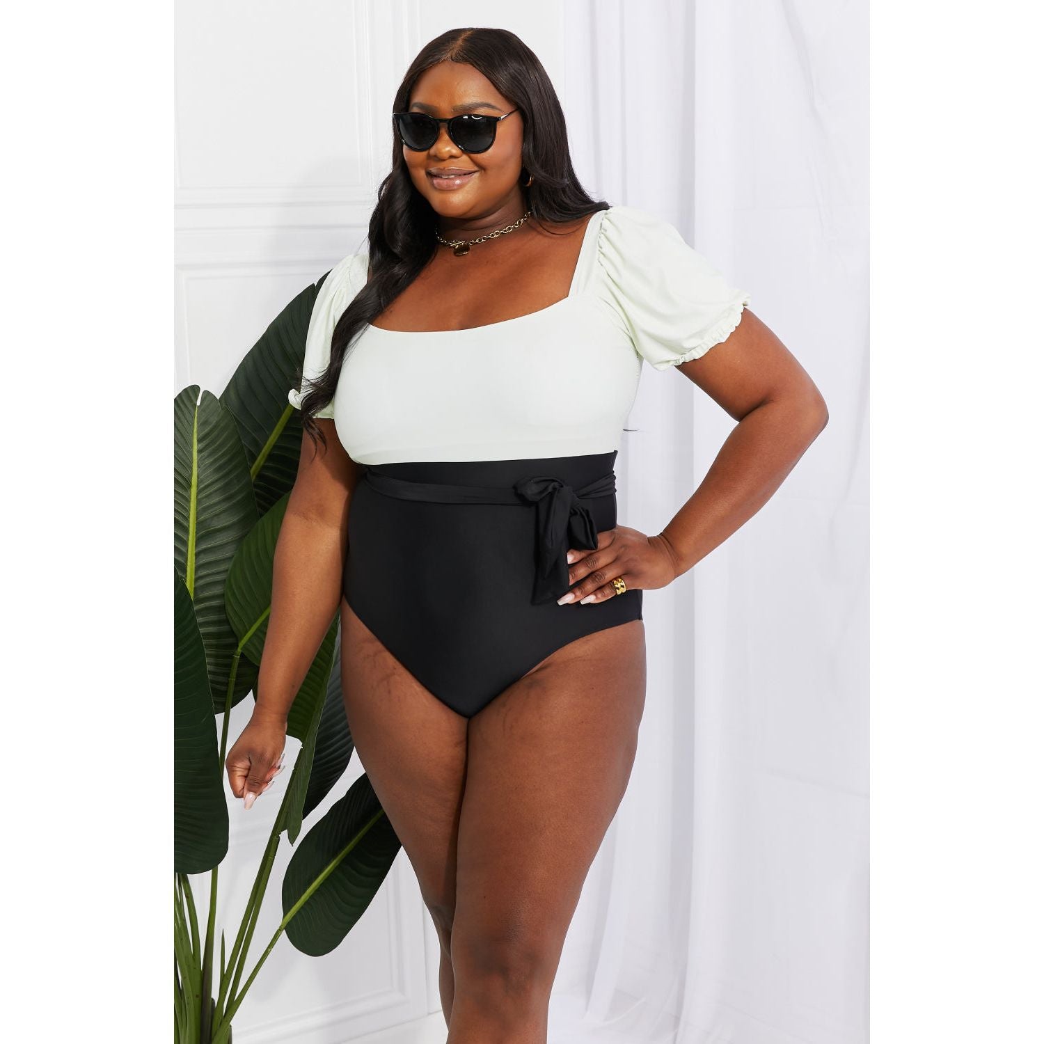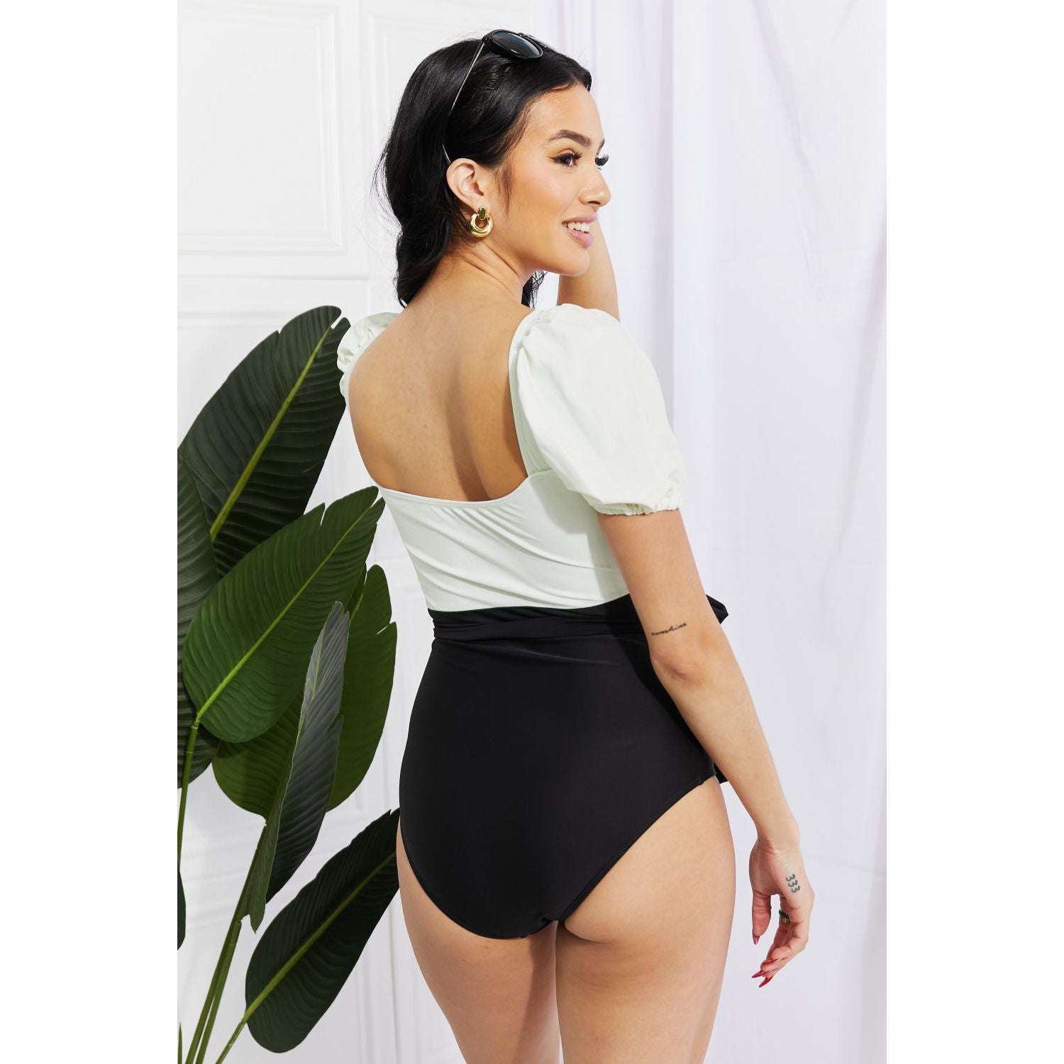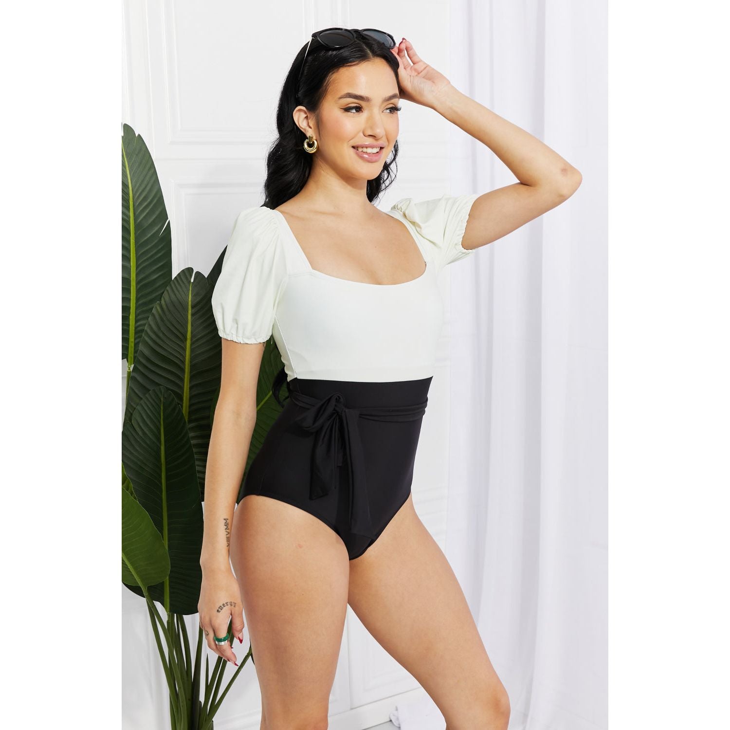 Marina West Swim Salty Air Puff Sleeve One-Piece in Cream/Black