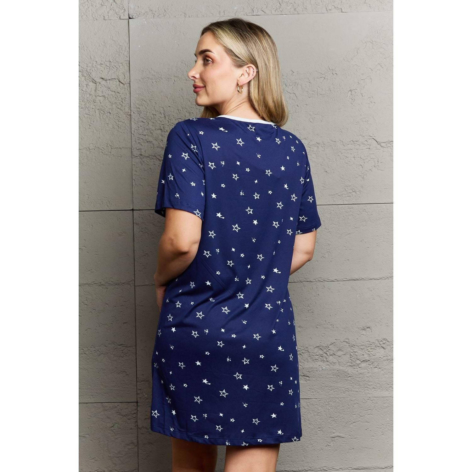 The perfect blend of relaxation and elegance for your bedtime routine. Crafted with care and attention to detail, this sleepwear dress is designed to provide you with a luxurious sleep experience like no other. Made from high-quality, soft, and breathable fabric, our sleepwear dress ensures maximum comfort throughout the night. The button-down design allows for easy wearing and removal, making it convenient for lounging or getting ready for bed. The short sleeves provide just the right amount of coverage, keeping you cool and comfortable during warmer nights. The sleepwear dress features a relaxed and loose fit, allowing for freedom of movement as you sleep or relax around the house. The length falls at a modest level, providing both comfort and an elegant look. Whether you're reading a book, watching your favorite show, or simply unwinding after a long day, this dress will make you feel effortlessly stylish. The thoughtful design details of our sleepwear dress add a touch of sophistication. The collar and lapel give a classic and refined look, while the front pocket adds a practical element for keeping small essentials within reach. The dress is available in a range of colors and patterns, allowing you to choose the one that best suits your personal style and preferences.