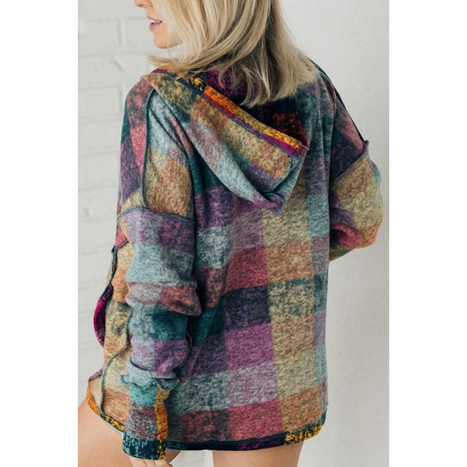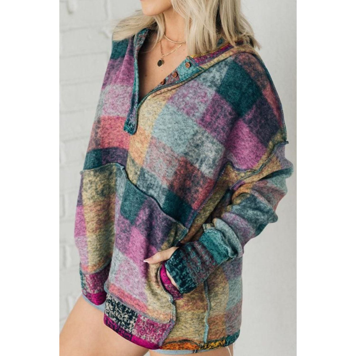 Multicolor Brushed Plaid Buttoned Pullover Oversized Hoodie