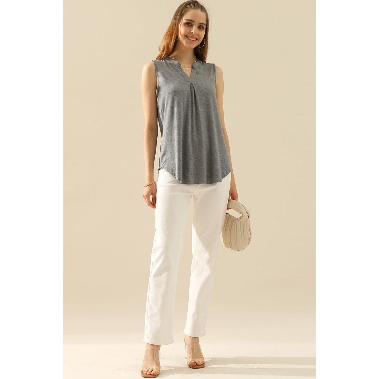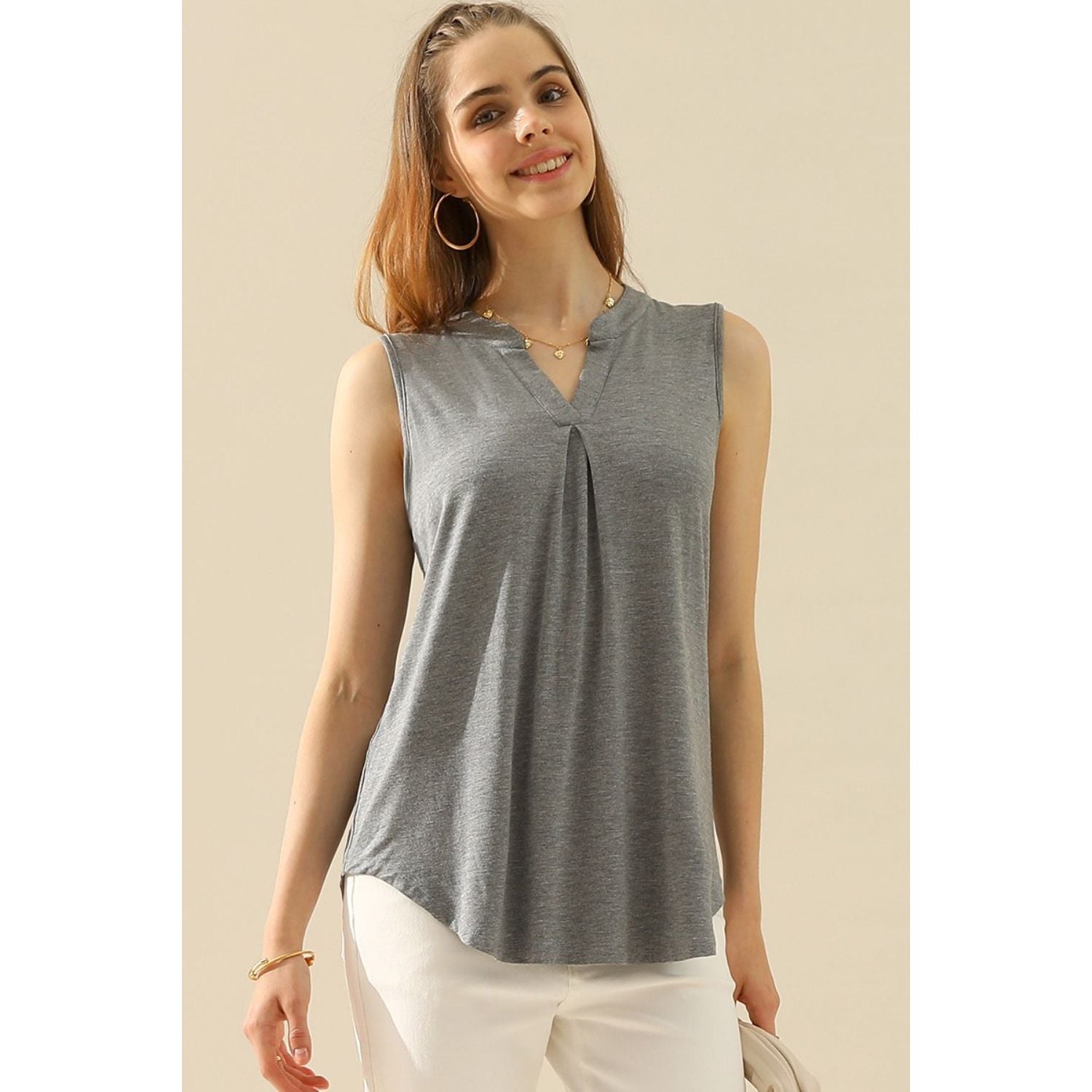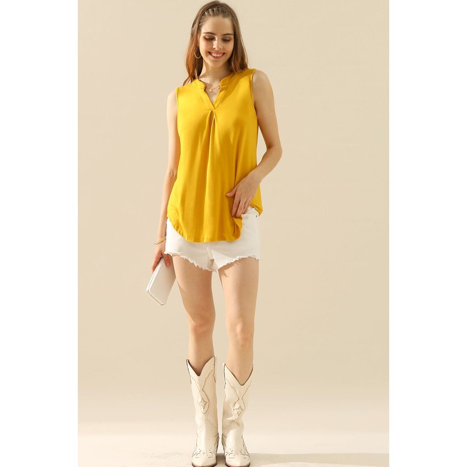 Introducing our chic and stylish Notched Sleeveless Top, perfect for any occasion. Crafted with precision and attention to detail, this top features a unique notched neckline that adds a touch of allure. Its sleeveless design provides ultimate comfort, while the high-quality fabric ensures durability. Pair it with your favorite bottoms and accessories for a trendy and sophisticated look. Available in a variety of colors, our Notched Sleeveless Top is a must-have addition to your wardrobe.