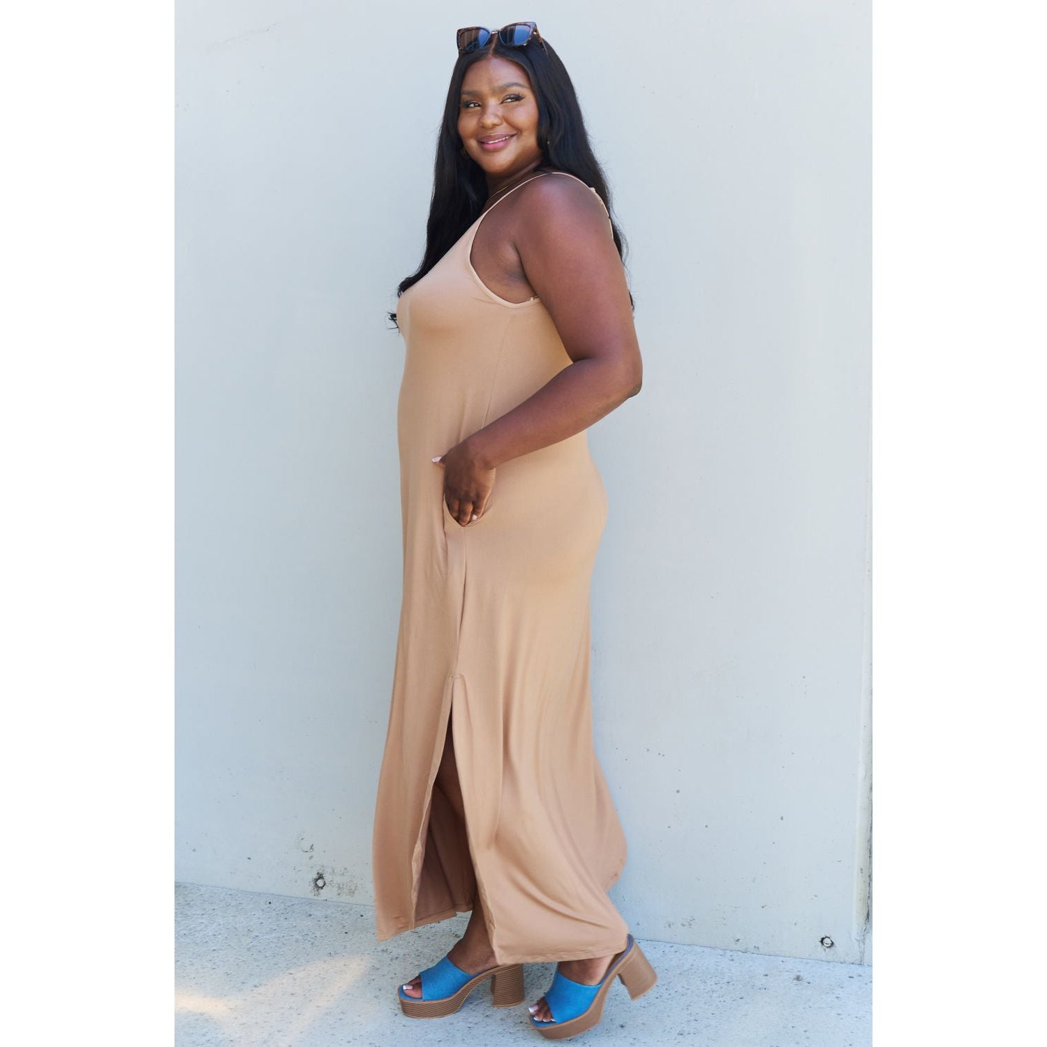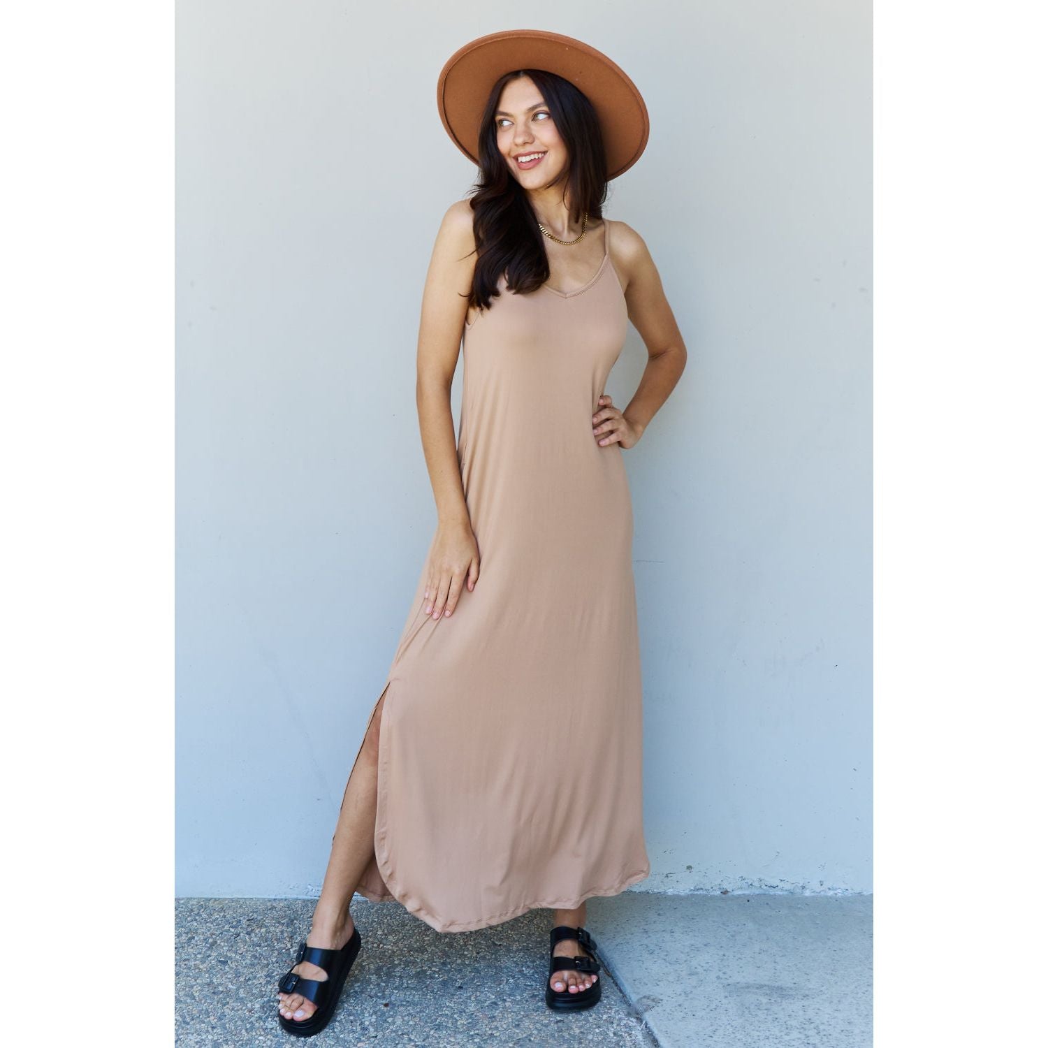 Ninexis Good Energy Full Size Cami Side Slit Maxi Dress in Camel