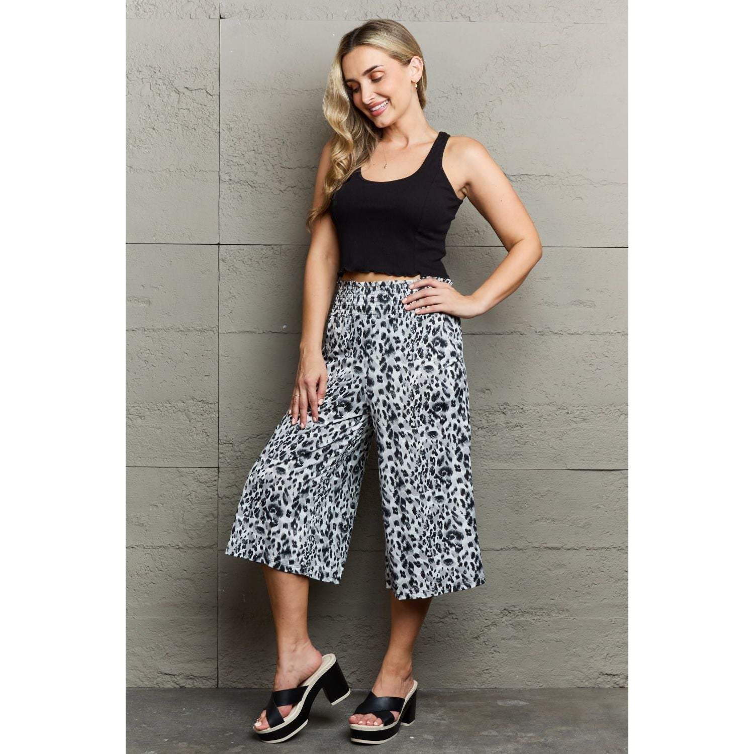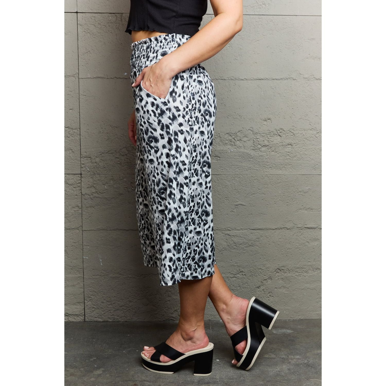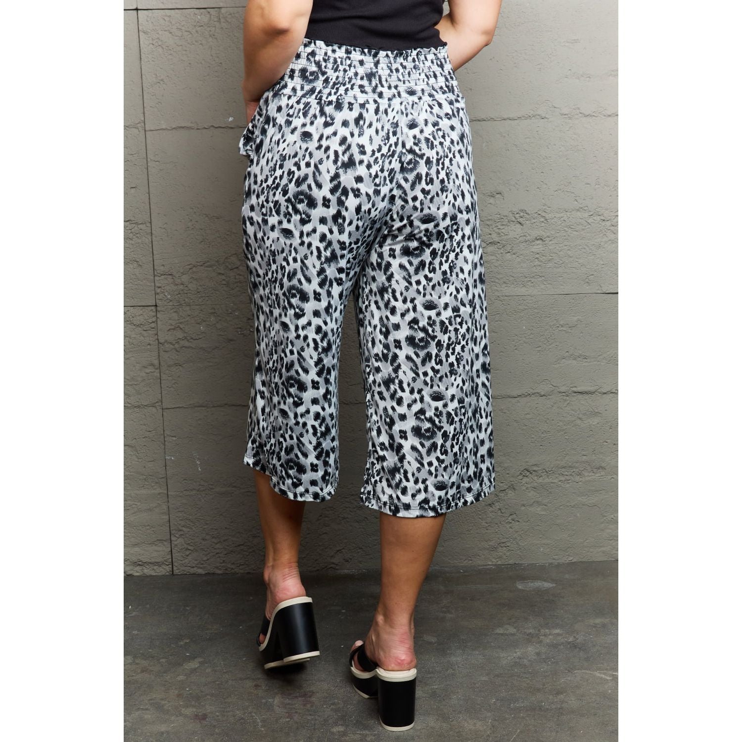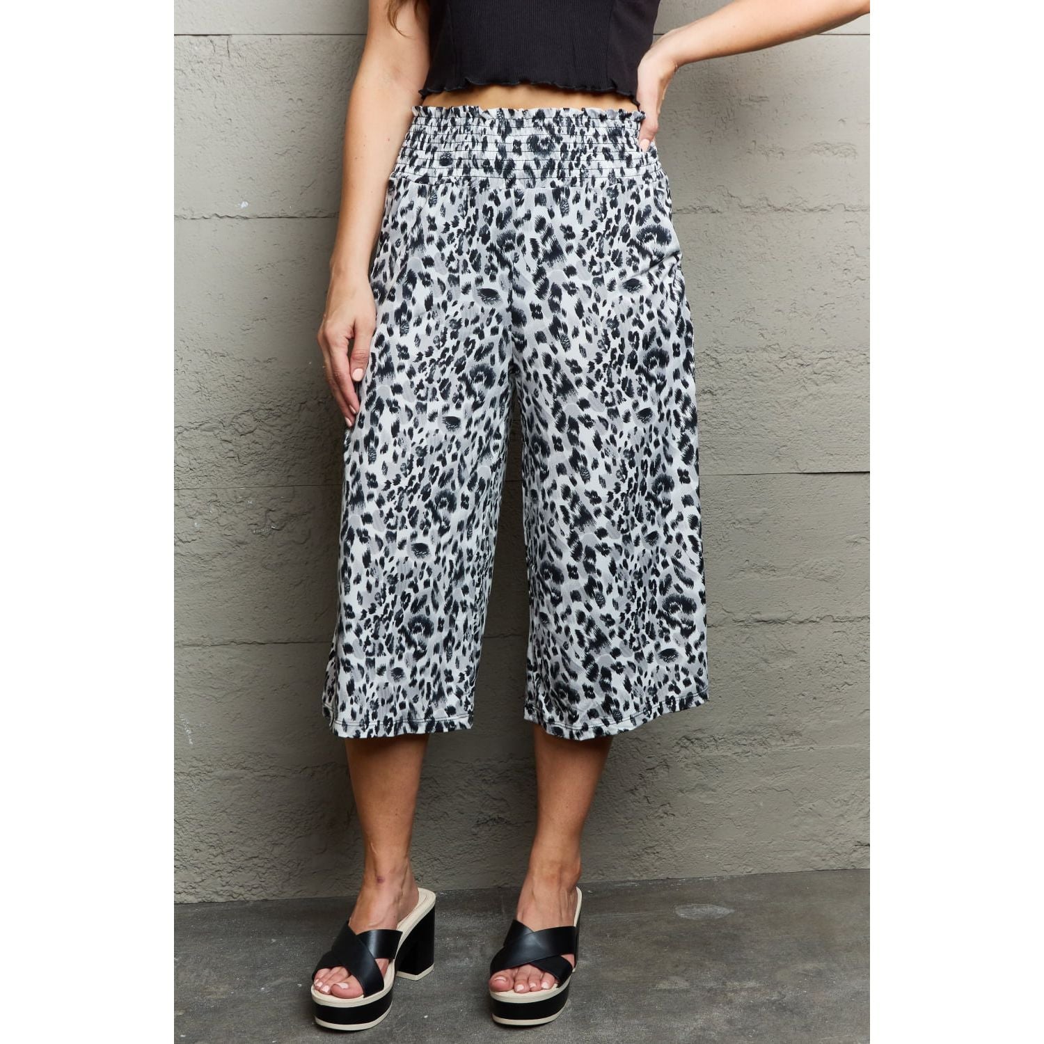 The pants are chic pants with leopard patterns. They have a high waist, a flattering silhouette, and a flowy wide-leg design for a stylish and comfortable fit. Pockets add a practical element to the pants, allowing you to store small essentials. The length of the pants is cropped, making them perfect for showcasing your favorite shoes or a more casual and relaxed look. These pants are a trendy and fashionable choice for any occasion.