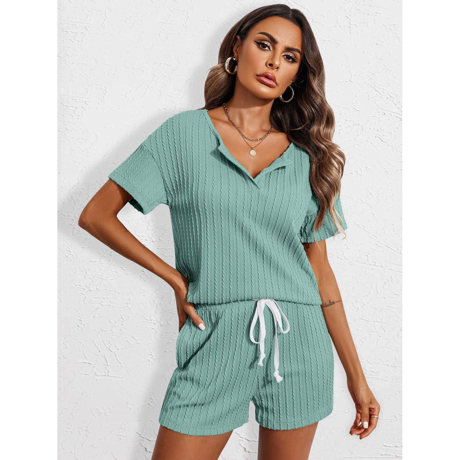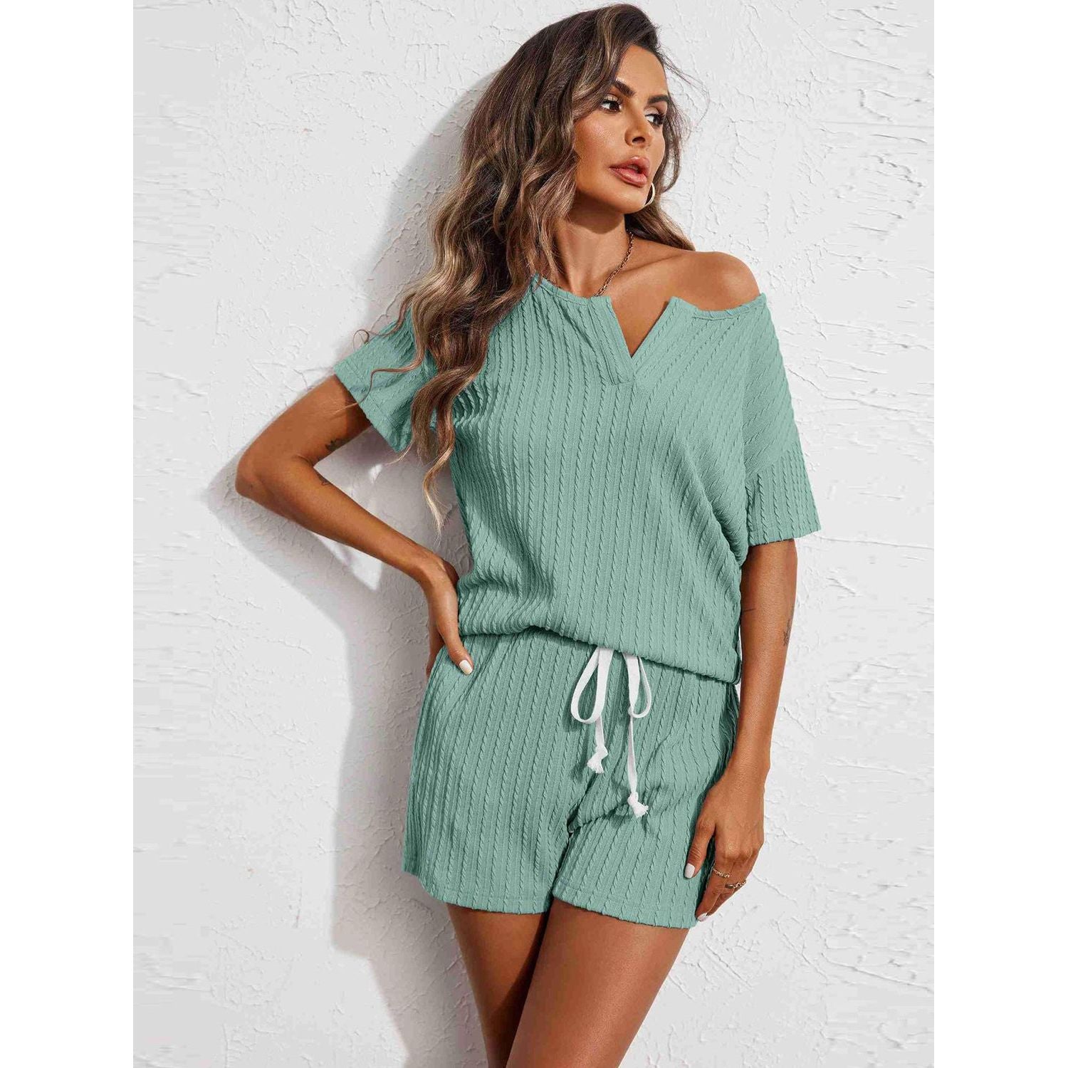 Notched Short Sleeve Top and Shorts Set