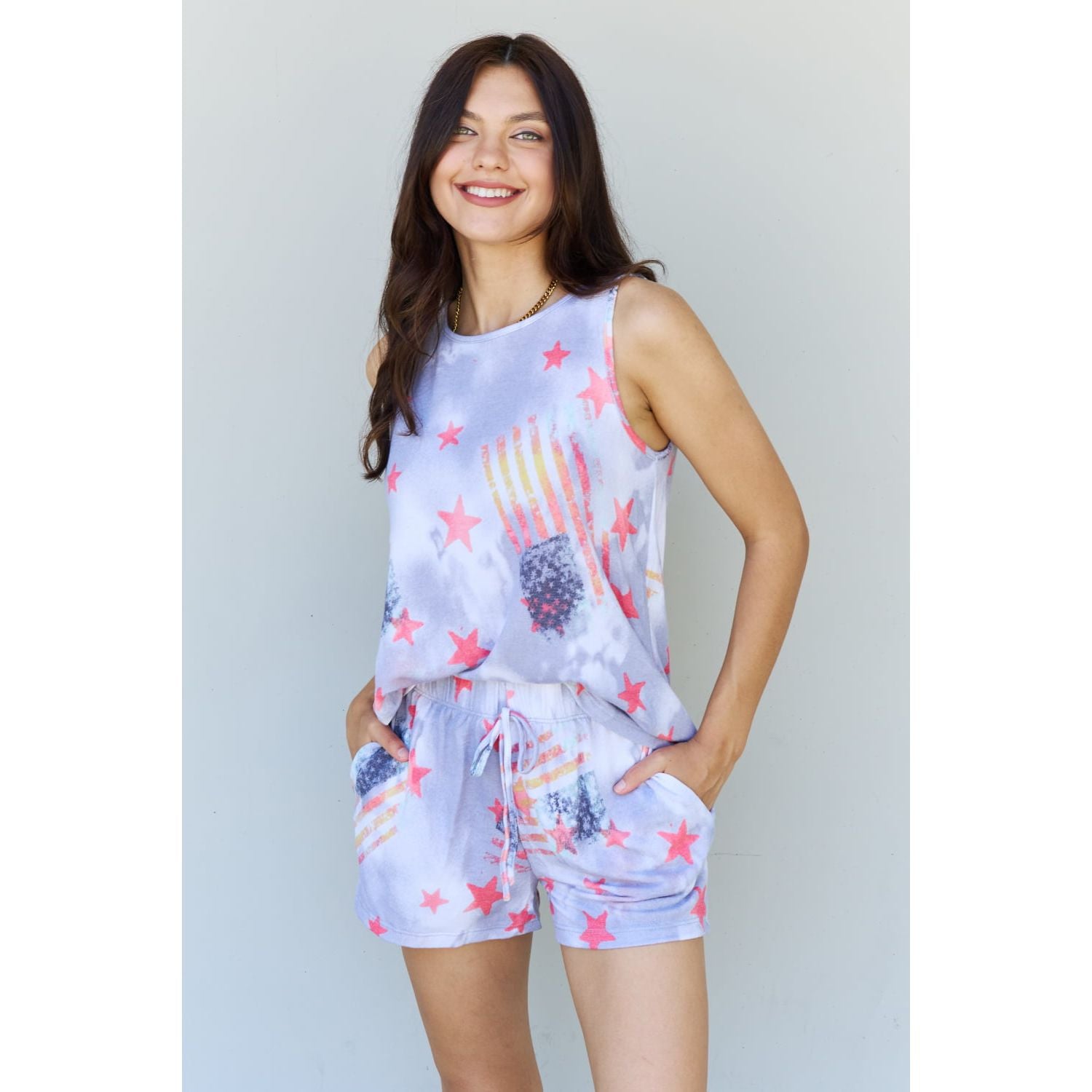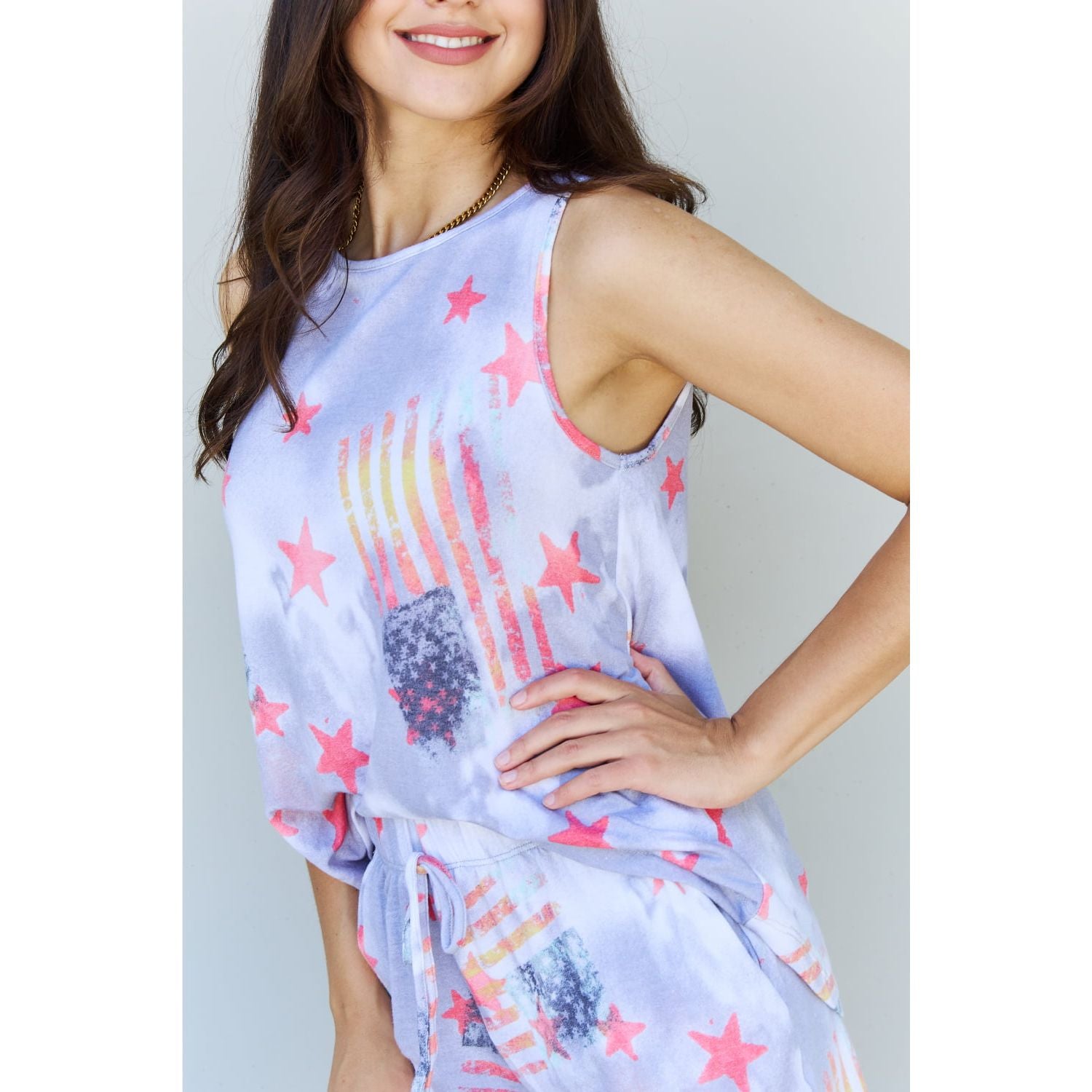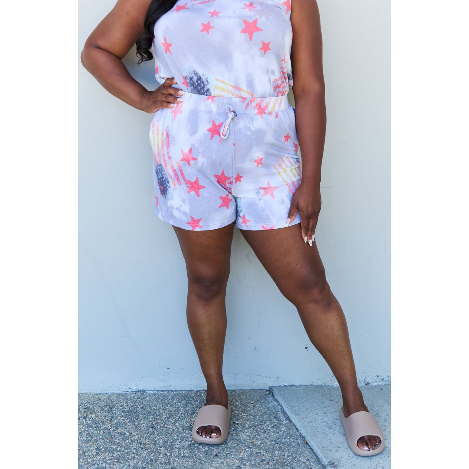 The perfect combination of comfort and style for your lounging needs. Crafted with care and designed for relaxation, this set is bound to become your go-to choice for ultimate comfort. The set includes a sleeveless top and matching shorts, both made from premium quality French terry fabric. The soft and breathable material ensures a luxurious feel against your skin, allowing you to unwind and lounge in absolute comfort. The tie-dye star print adds a touch of playfulness and uniqueness to the set. Each piece is meticulously tie-dyed, creating a stunning pattern of vibrant colors that will make you stand out from the crowd. The star motif adds a whimsical touch, adding an element of fun to your loungewear collection. The sleeveless top is designed for ease of movement and features a relaxed fit. It allows you to move freely without any restrictions, making it ideal for lounging around the house or running errands. The shorts are equally comfortable and come with an adjustable drawstring waist, allowing you to customize the fit according to your preference.