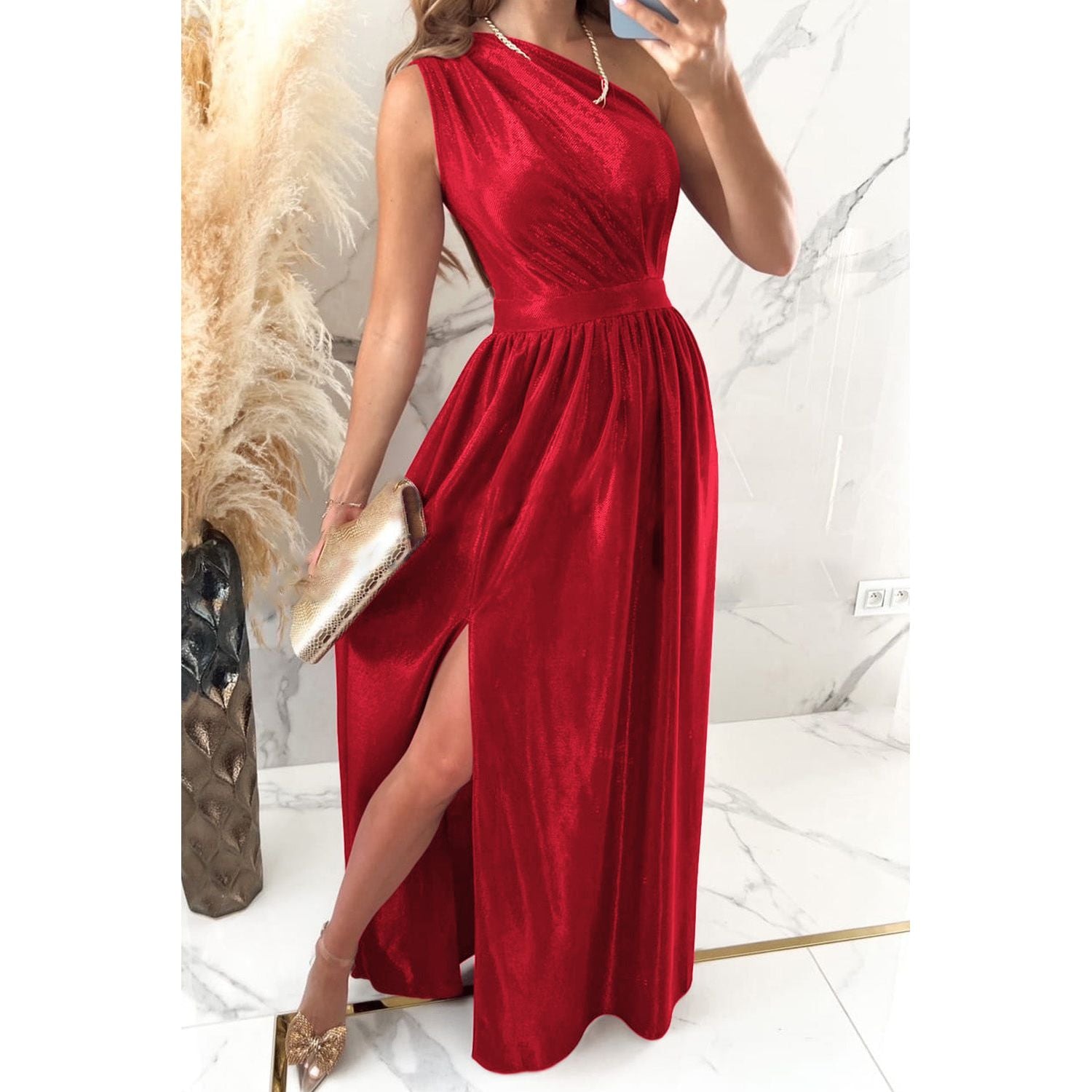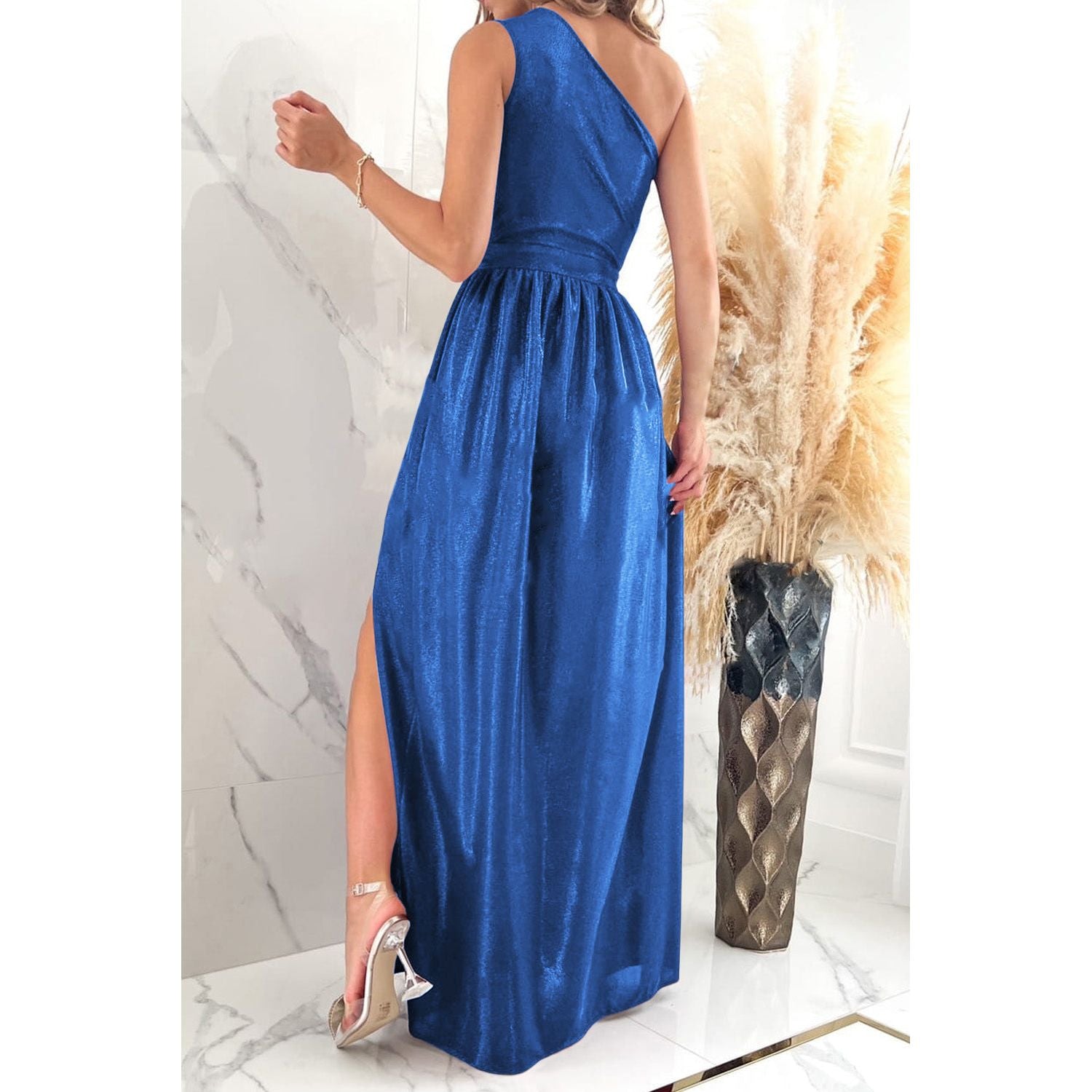 One Shoulder Slit Ruched Maxi Dress