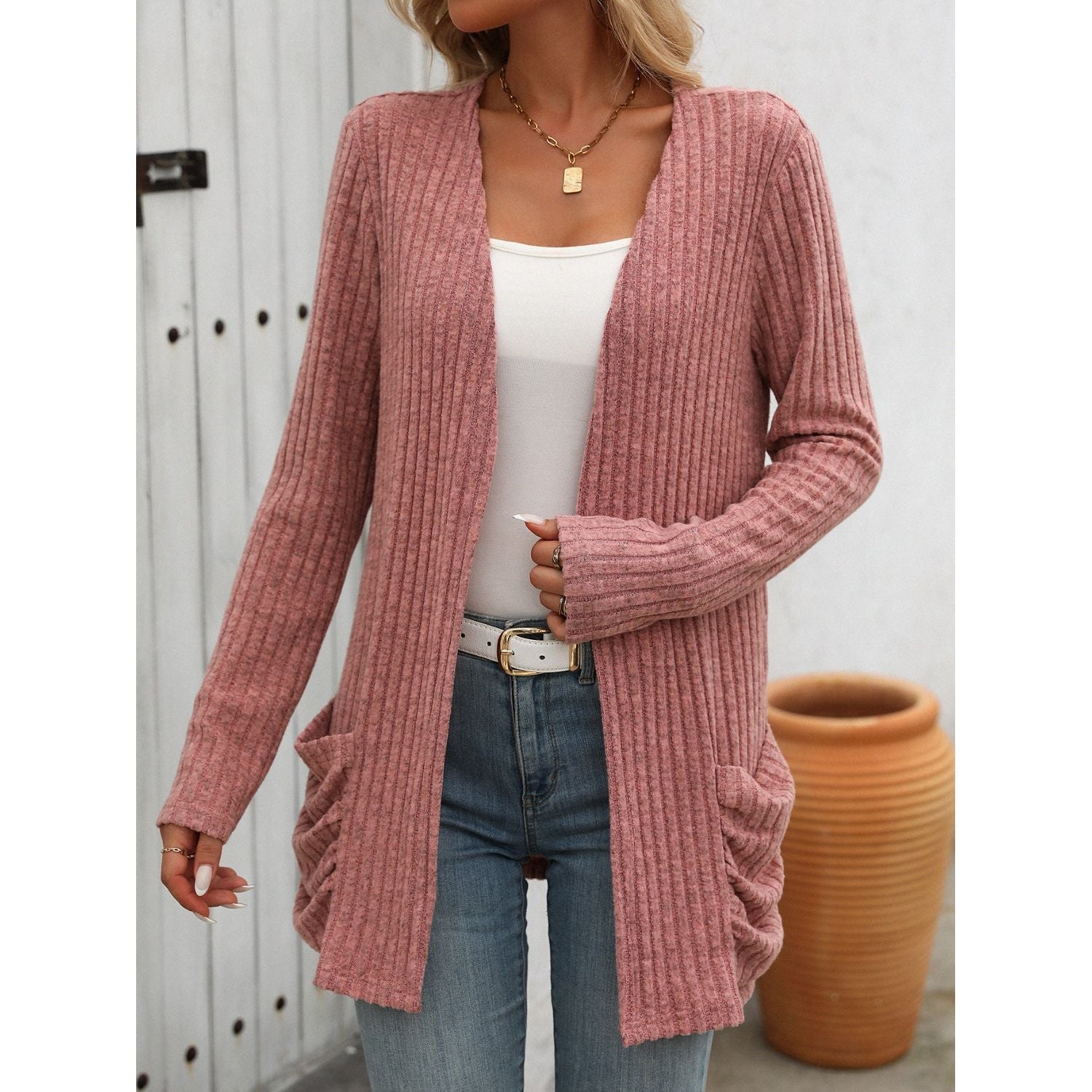 Open Front Long Sleeve Ribbed Cardigan