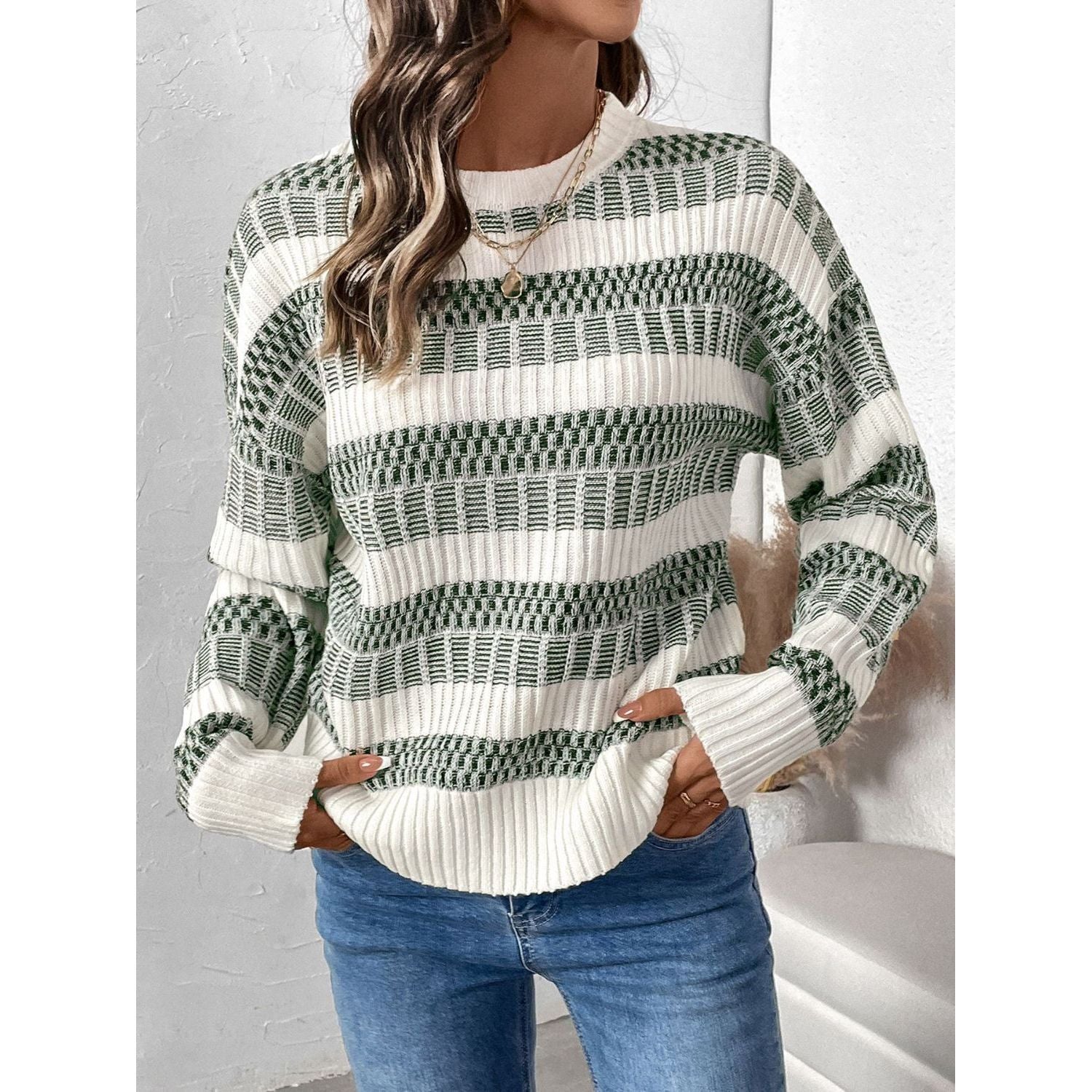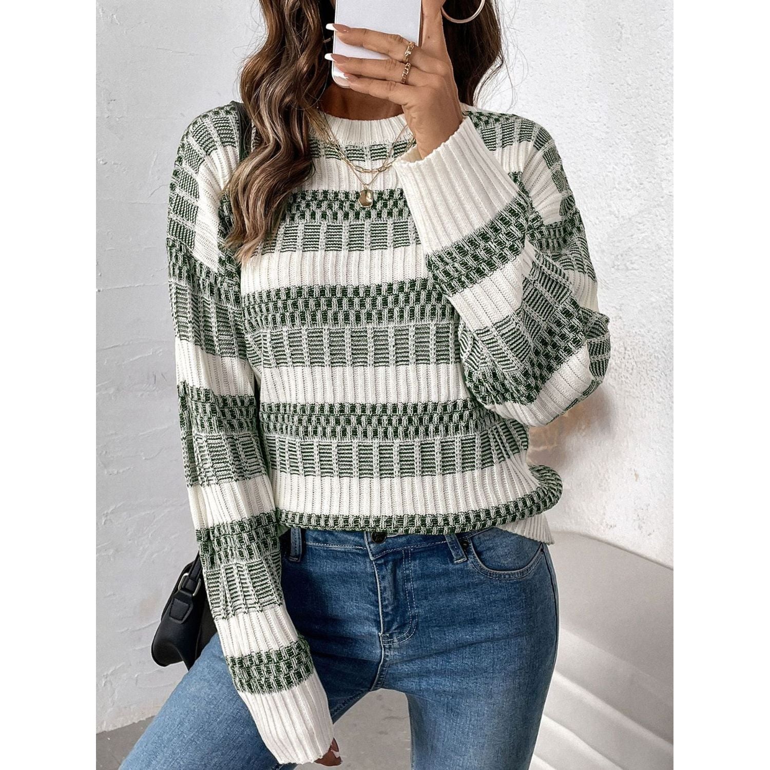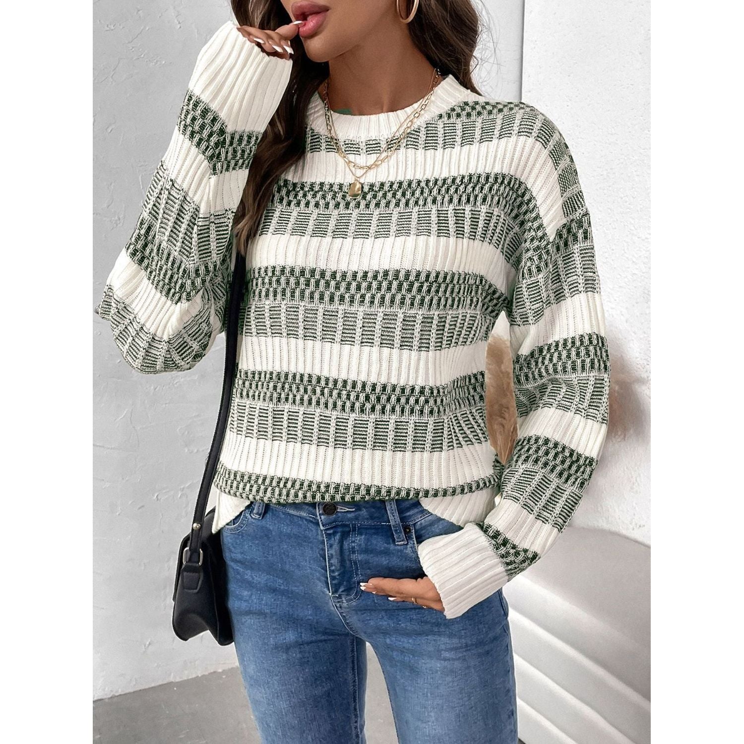Perfee Contrast Round Neck Long Sleeve Sweater