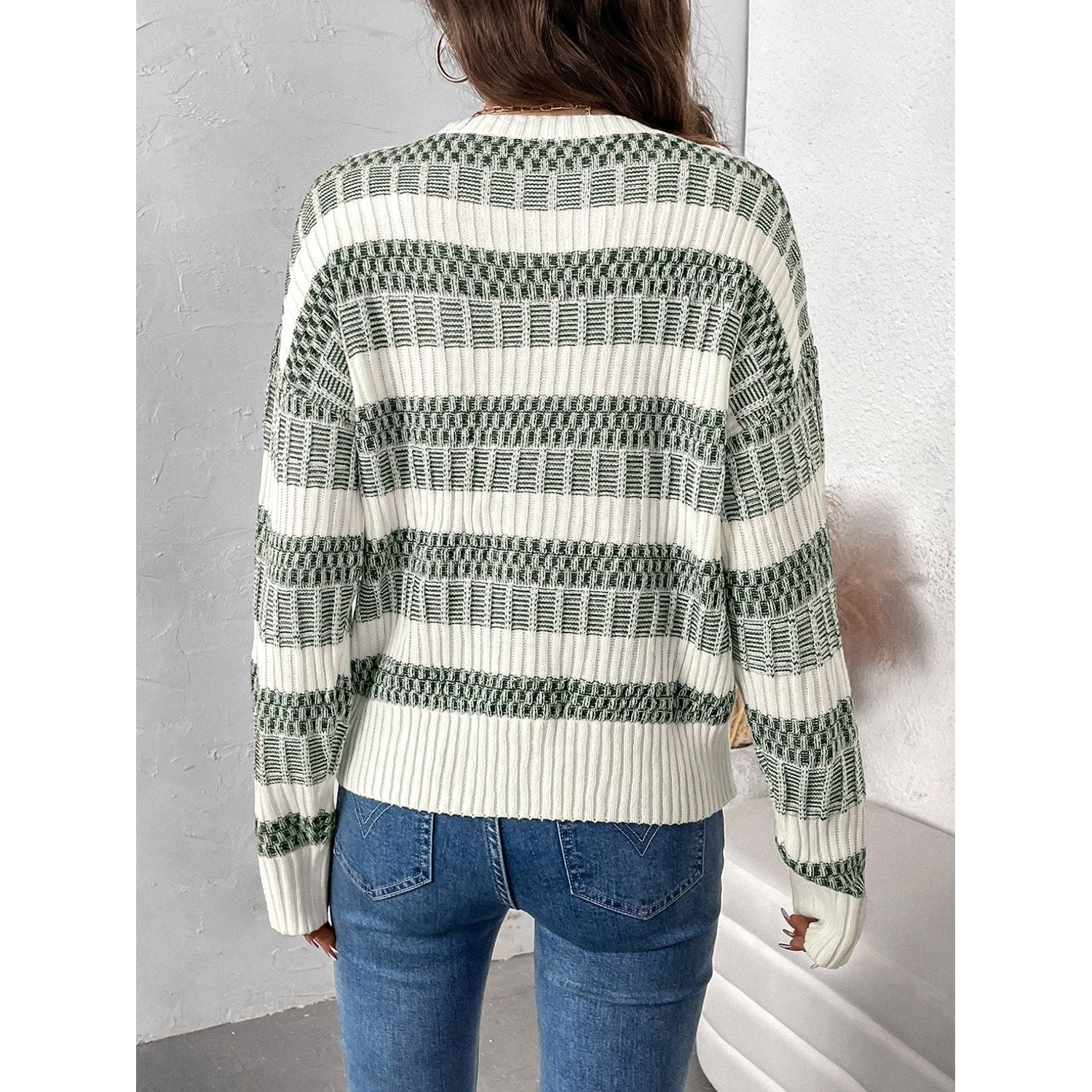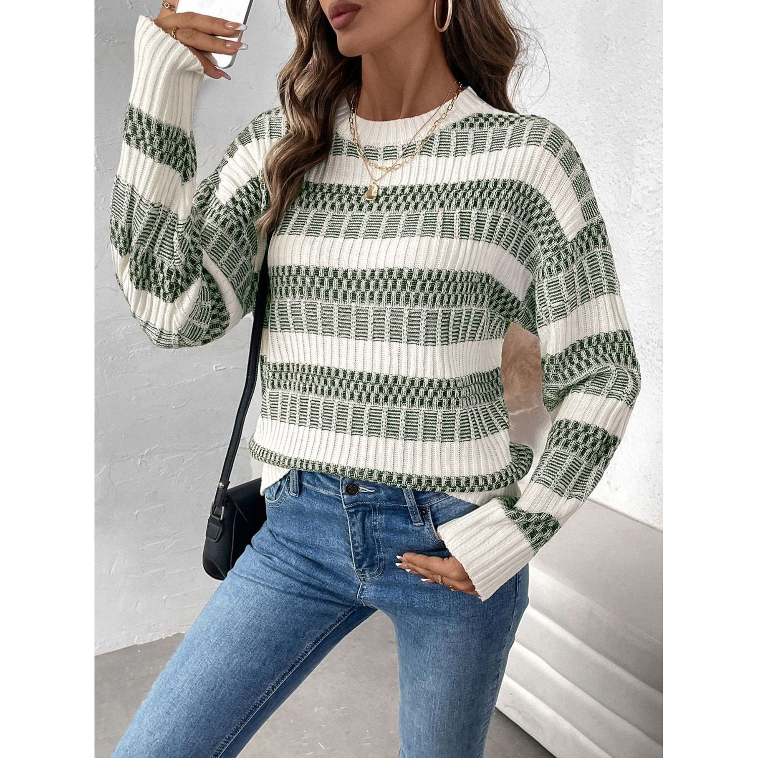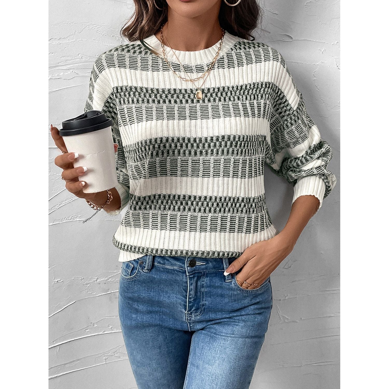 Perfee Contrast Round Neck Long Sleeve Sweater