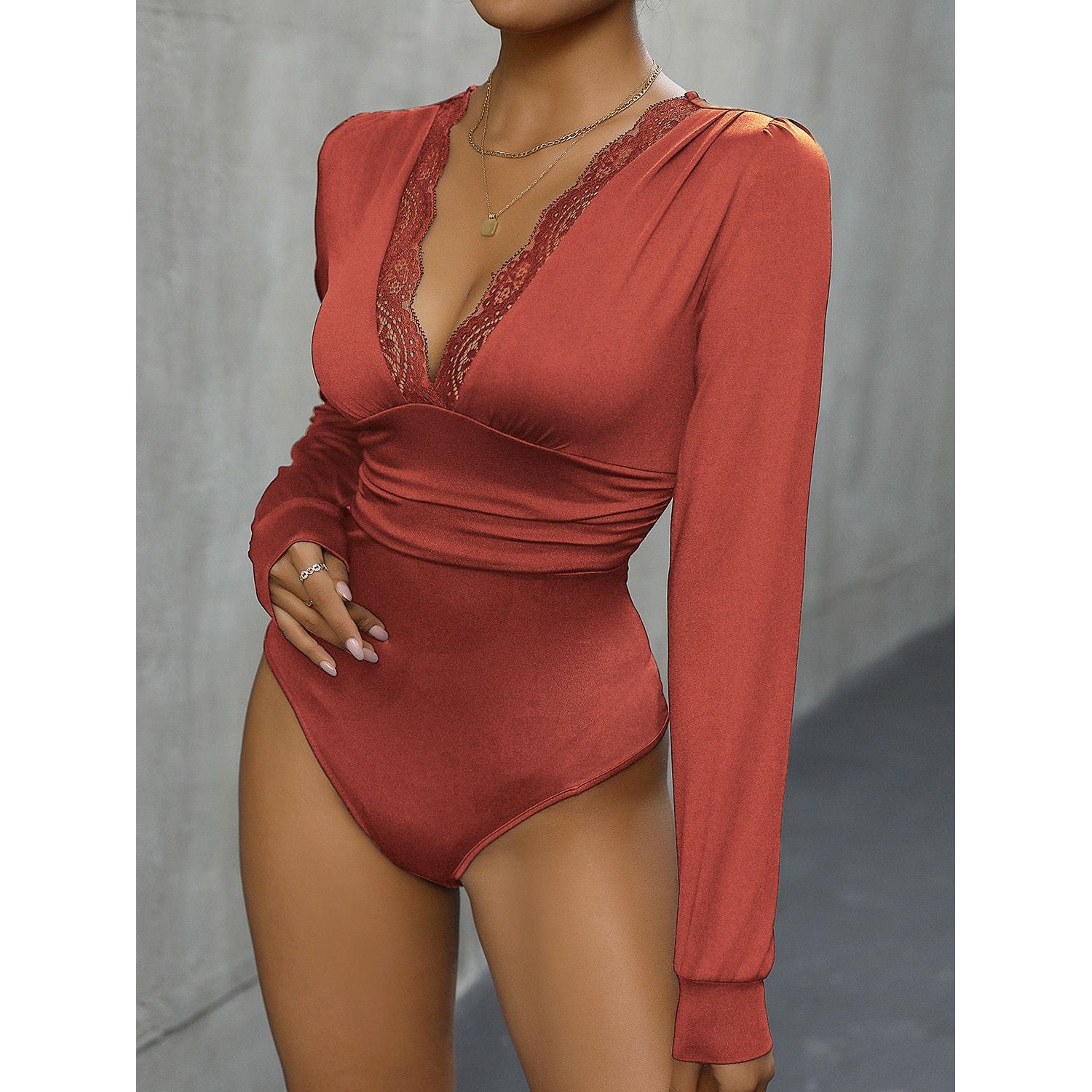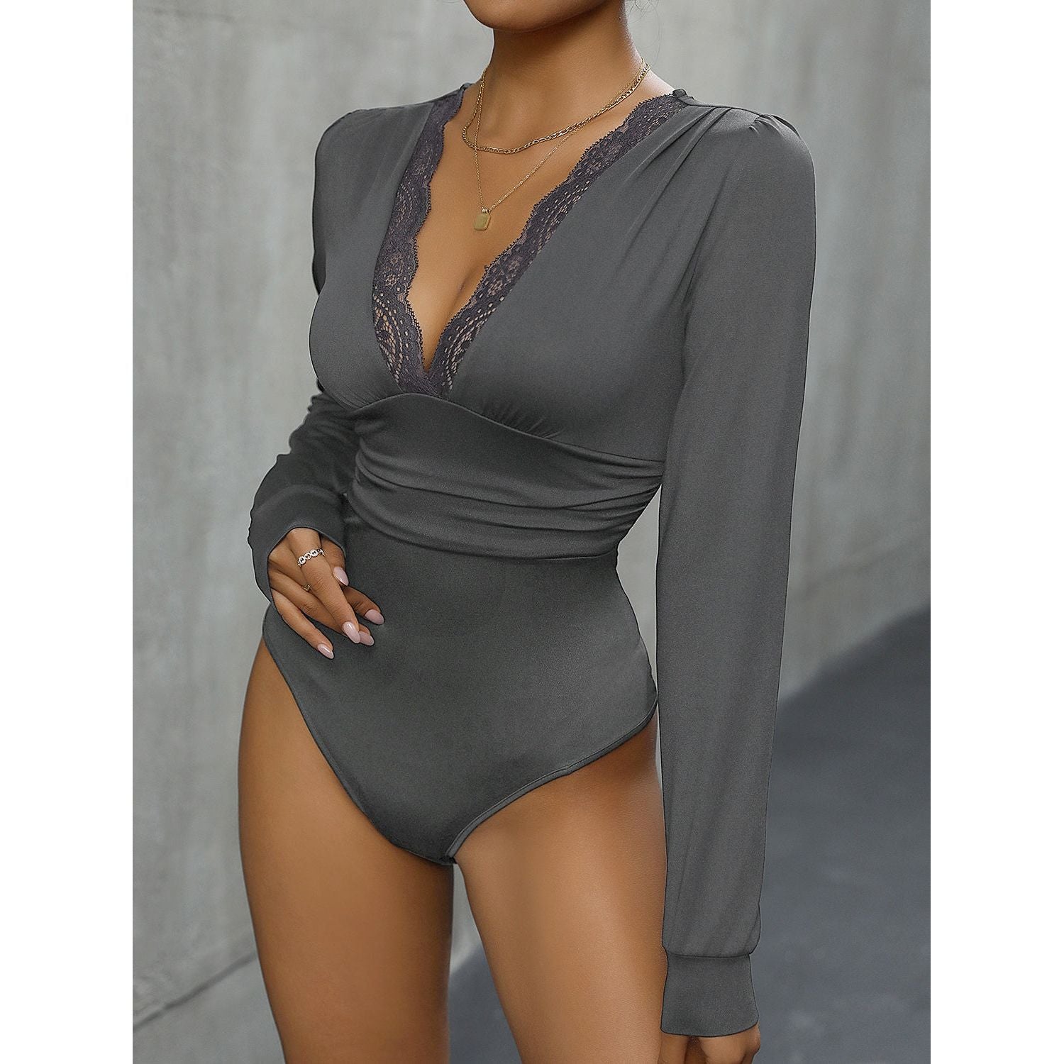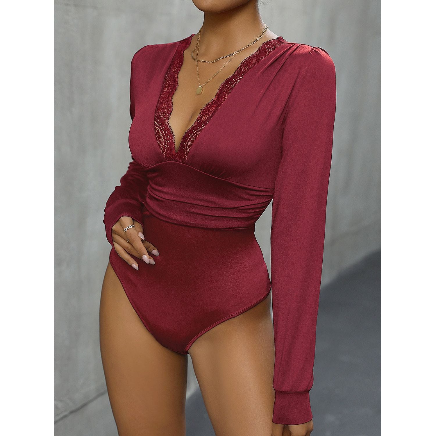 Perfee Lace Detail Plunge Long Sleeve Bodysuit