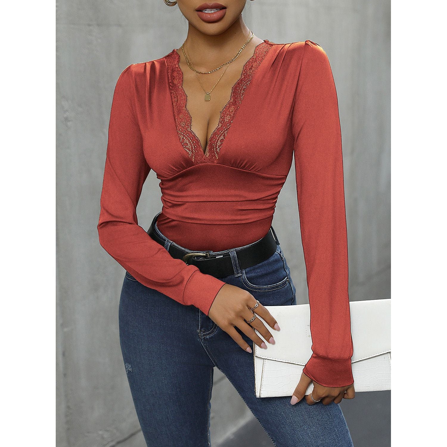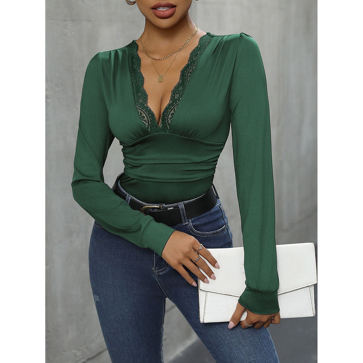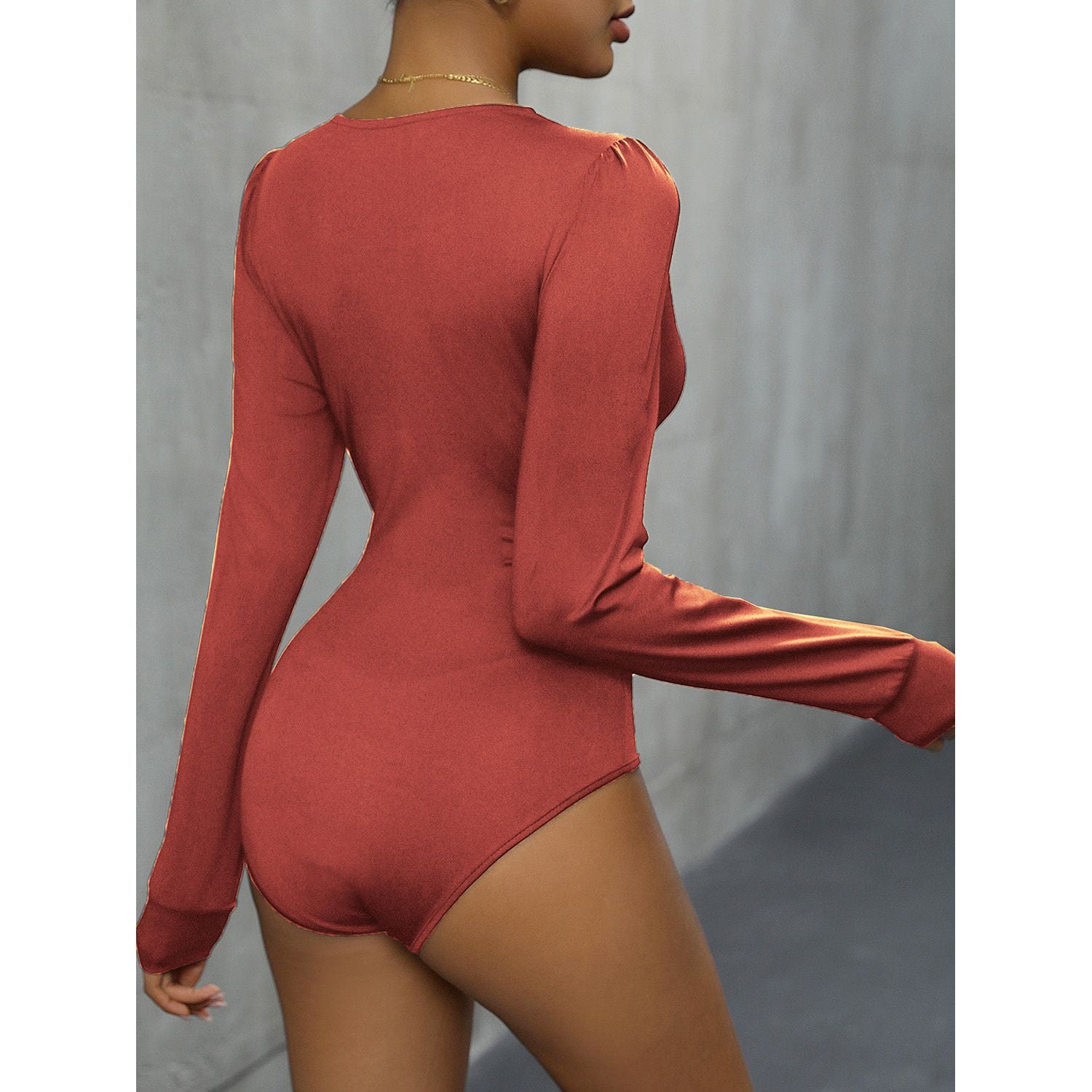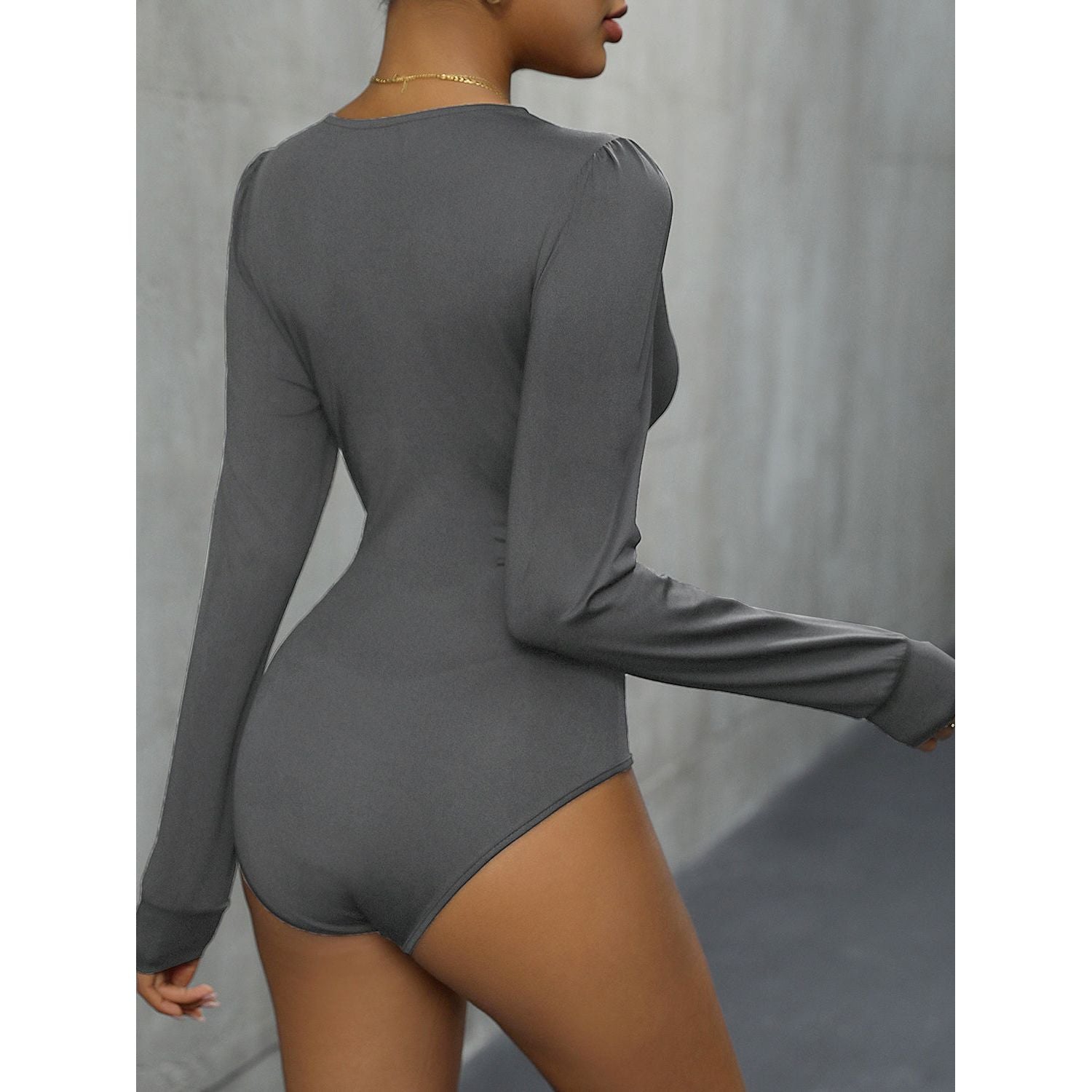 Perfee Lace Detail Plunge Long Sleeve Bodysuit