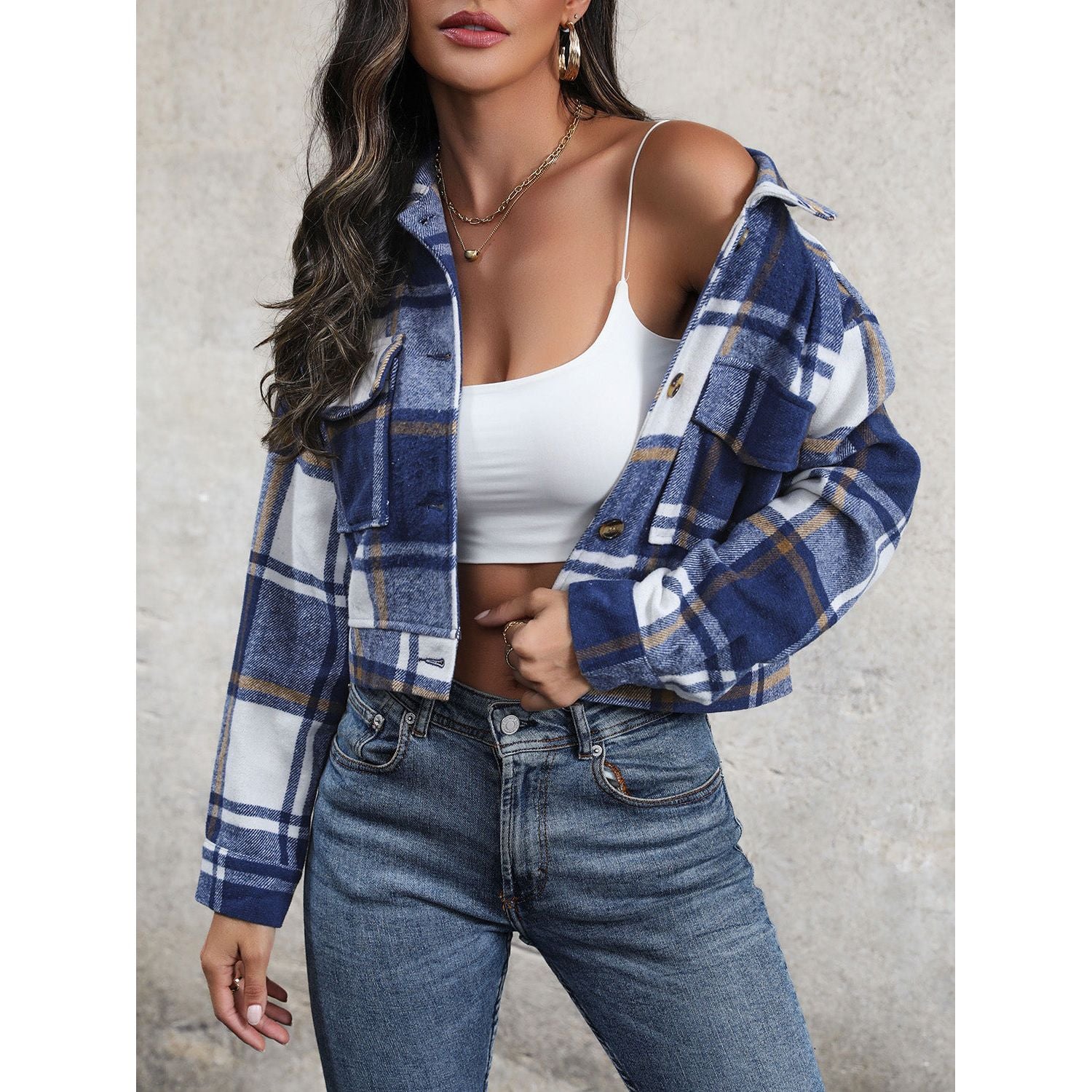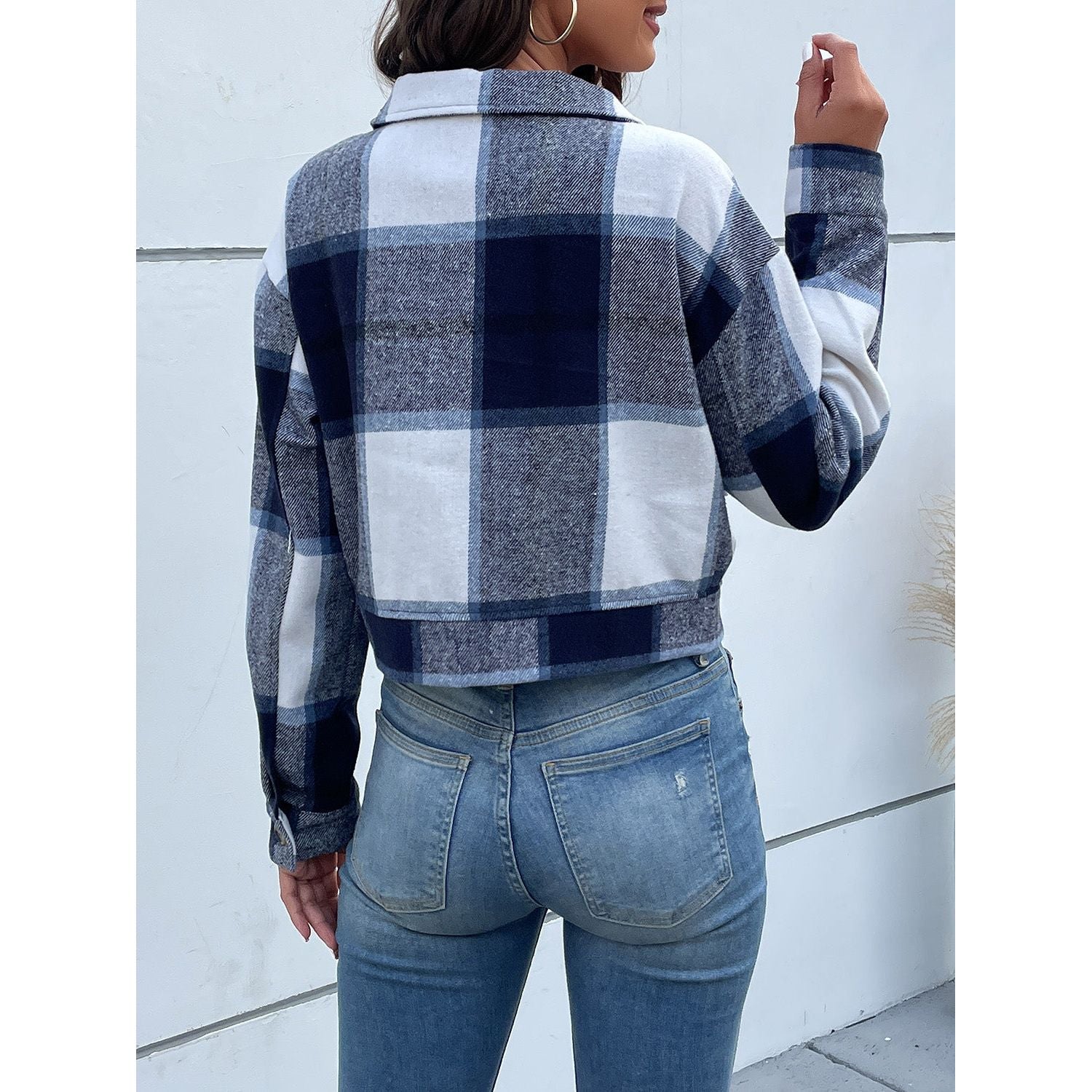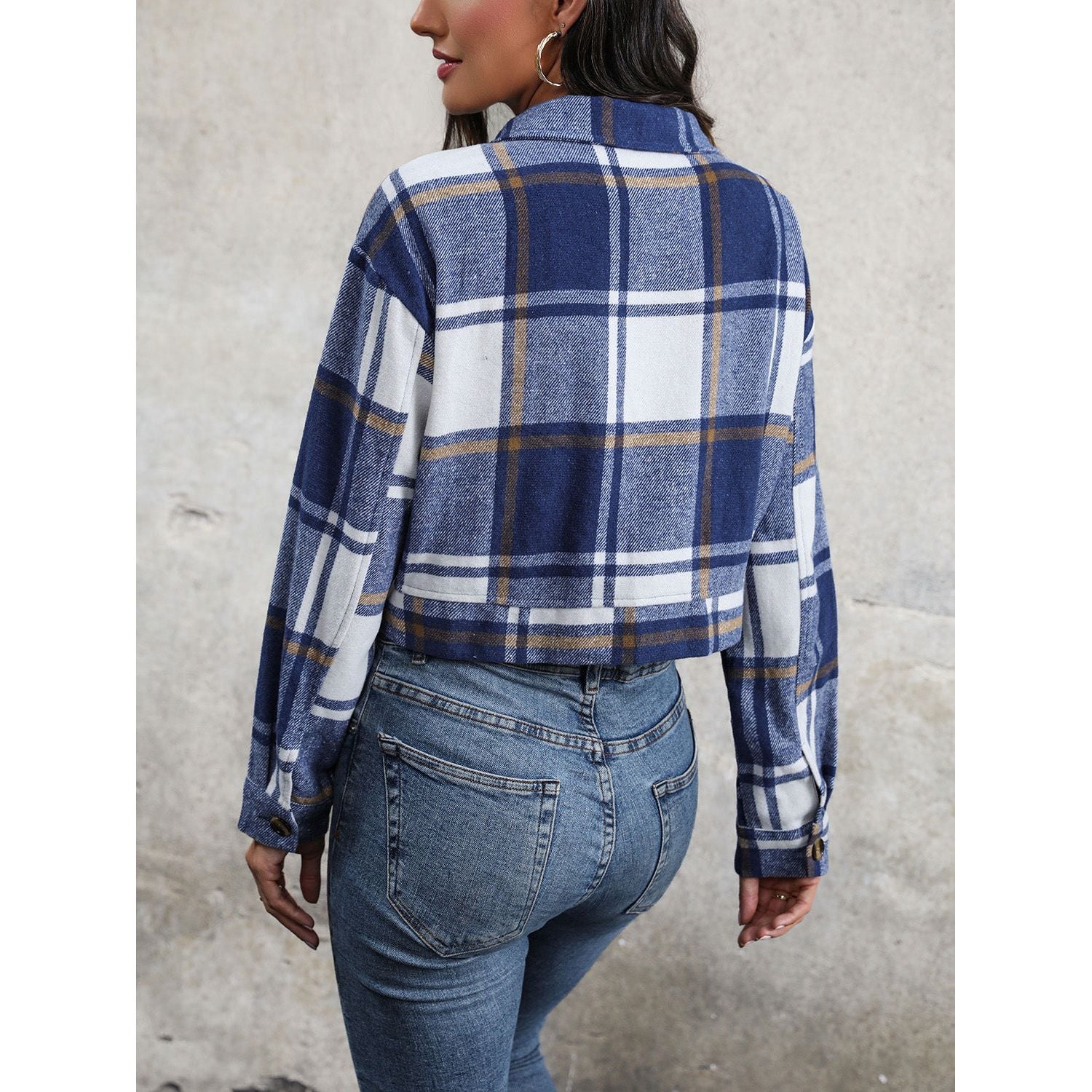 Perfee Plaid Button Up Drop Shoulder Cropped Jacket