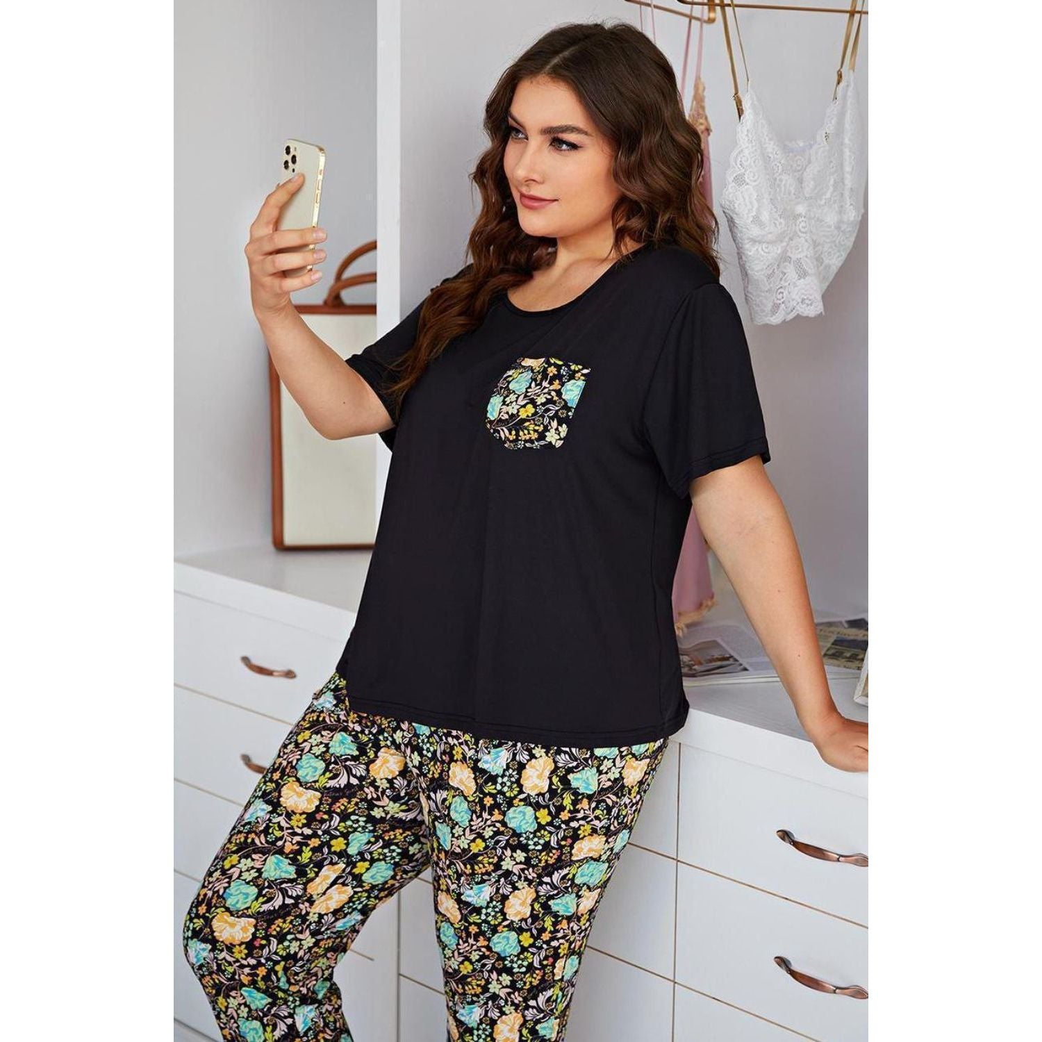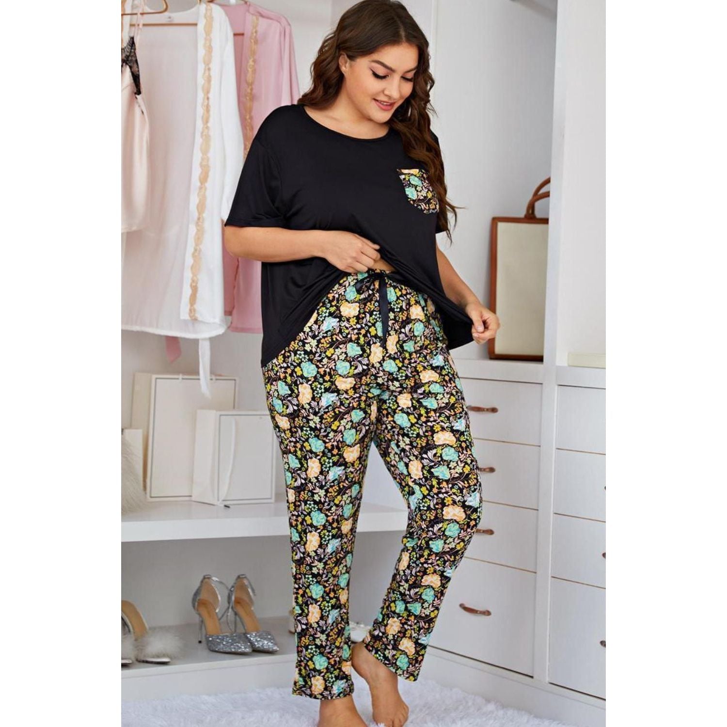 Plus Size Contrast Round Neck Tee and Floral Pants Lounge Set