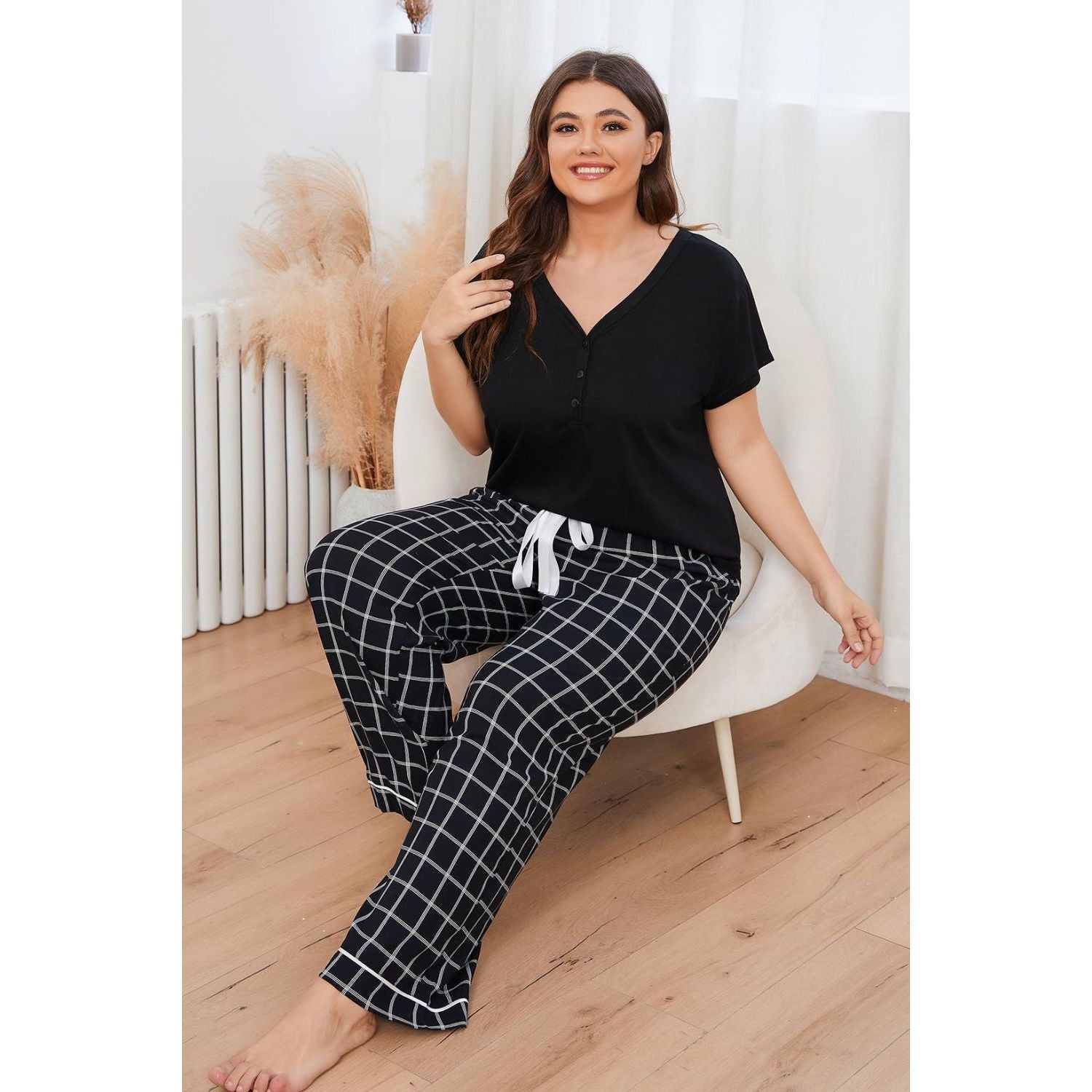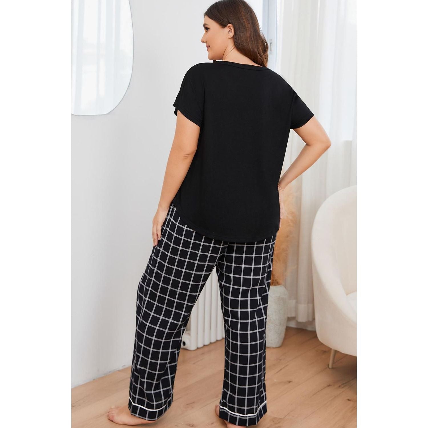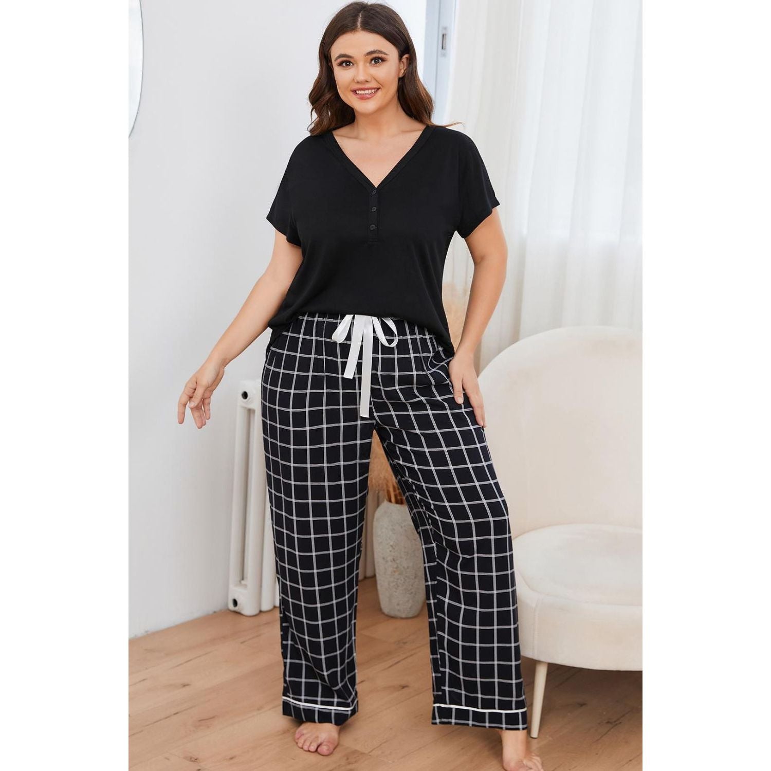 Plus Size V-Neck Top and Plaid Pants Lounge Set