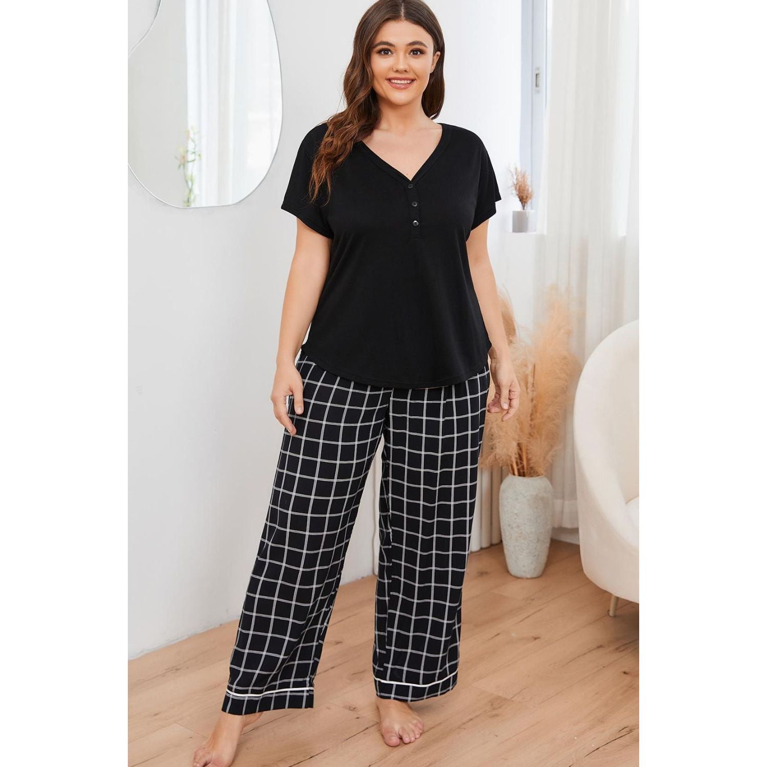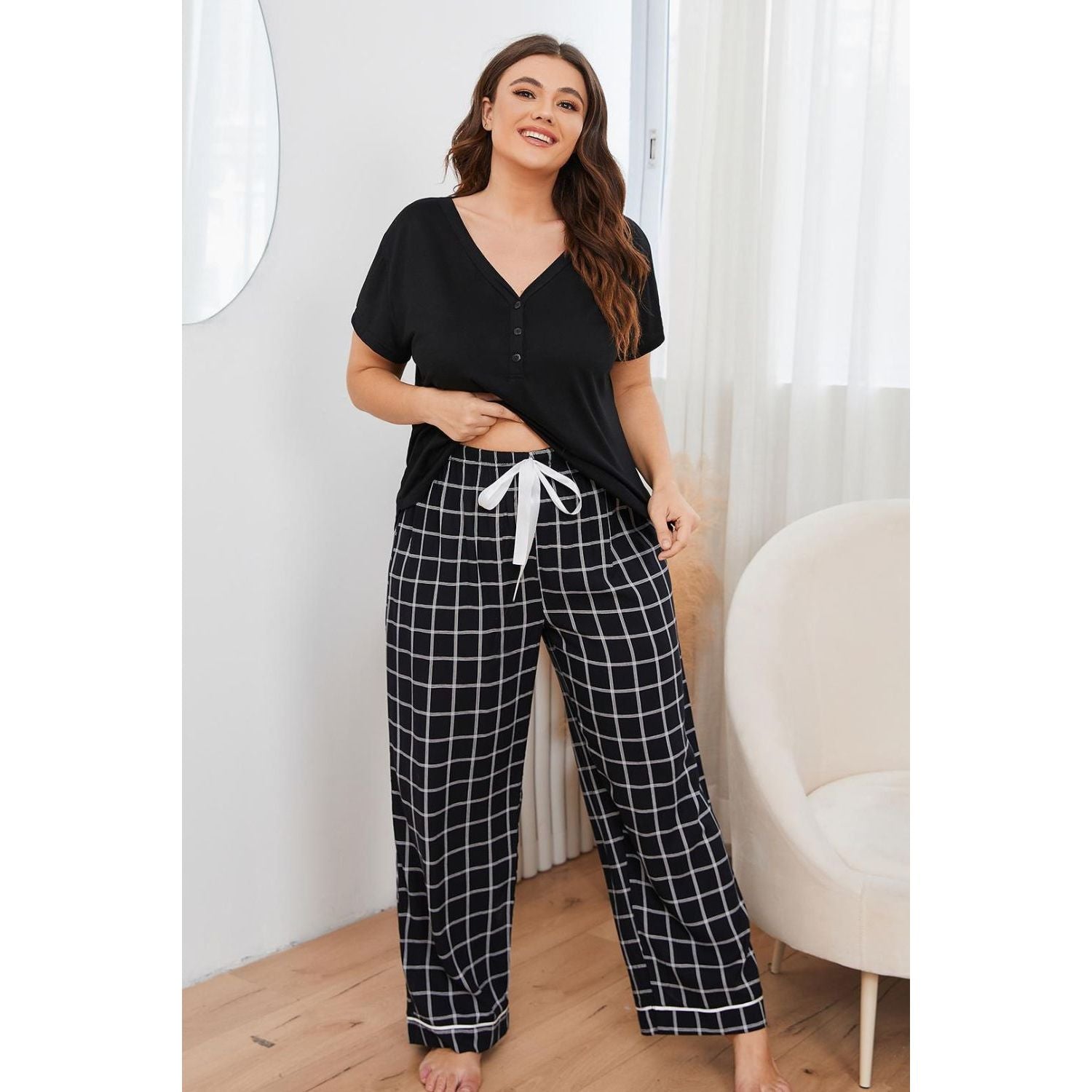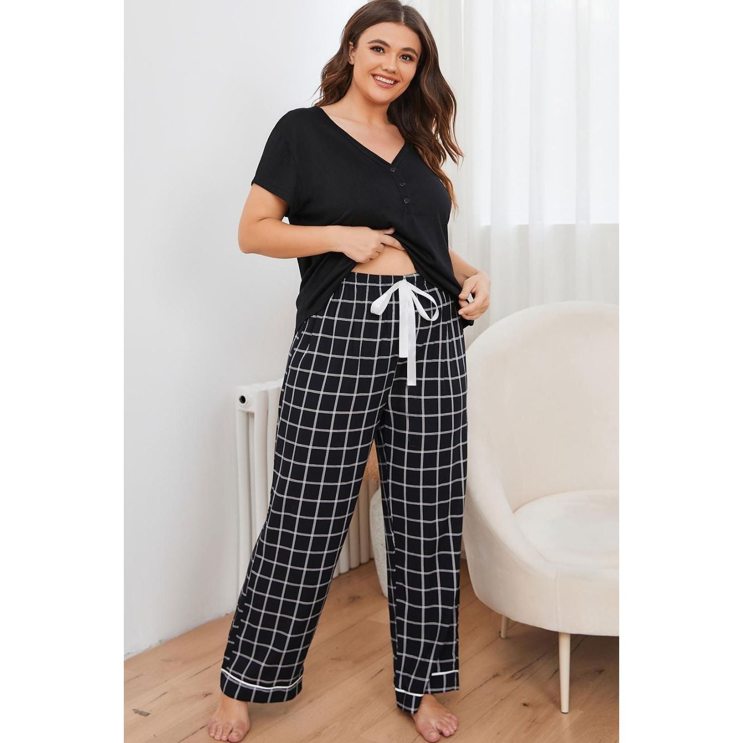 Plus Size V-Neck Top and Plaid Pants Lounge Set