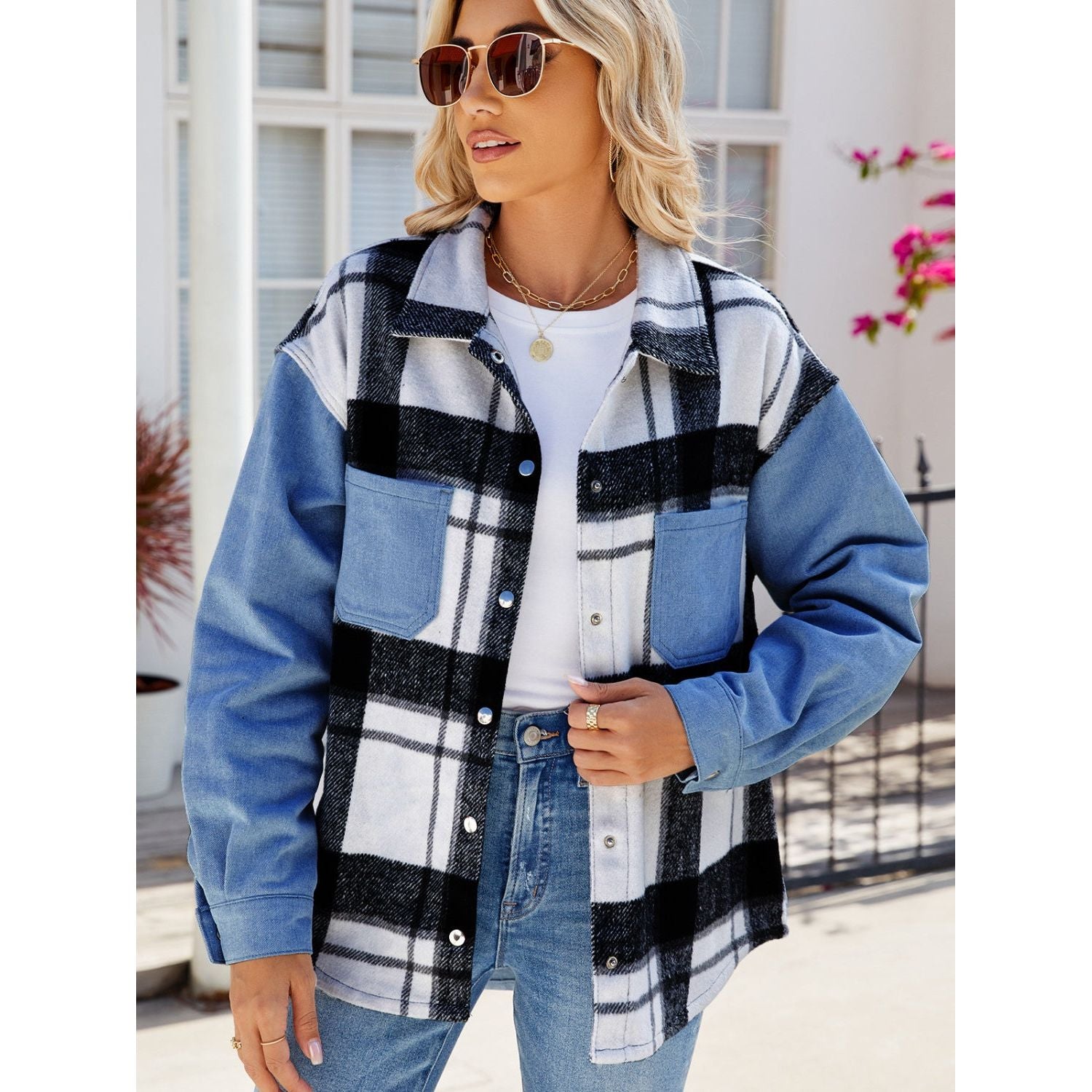 Pocketed Plaid Snap Down Denim Jacket