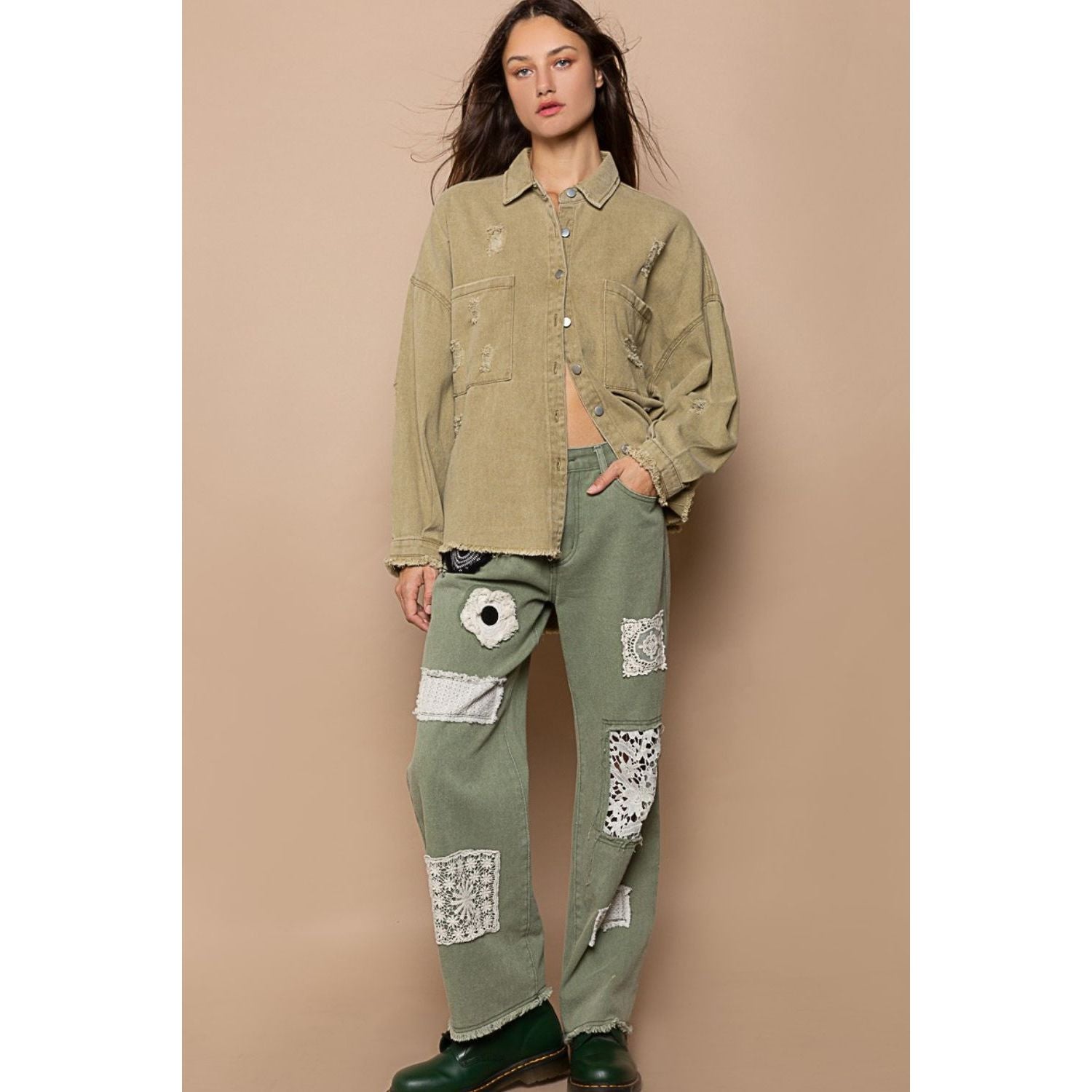 The Button Down Raw Hem Distressed Shacket is a versatile and edgy piece that combines the style of a shirt with the functionality of a jacket. The raw hem and distressed detailing give it a rugged and worn-in look for added character. With a button-down front, this shacket can be worn open as a lightweight layer or closed as a standalone top. The combination of a shirt and jacket makes it perfect for transitional weather and layering over your favorite outfits. Pair it with jeans and boots for a casual and on-trend ensemble. Elevate your streetwear style with this cool and fashion-forward distressed shacket.