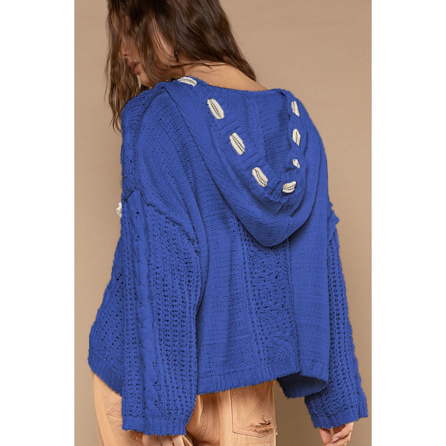 The Cable Knit Hooded Chenille Sweater is a cozy and stylish addition to your winter wardrobe. This sweater features a V-neck hoodie, long sleeves, and a roomy fit for ultimate comfort. The chenille fabric adds a soft and luxurious feel, perfect for keeping warm during colder days. The tie detail adds a touch of charm and uniqueness to the pullover sweater. Elevate your look with this chic and comfortable cable knit sweater that is perfect for casual outings or lounging at home. Stay cozy and on-trend with the Cable Knit Hooded Chenille Sweater, a versatile piece that will keep you looking stylish all season long.