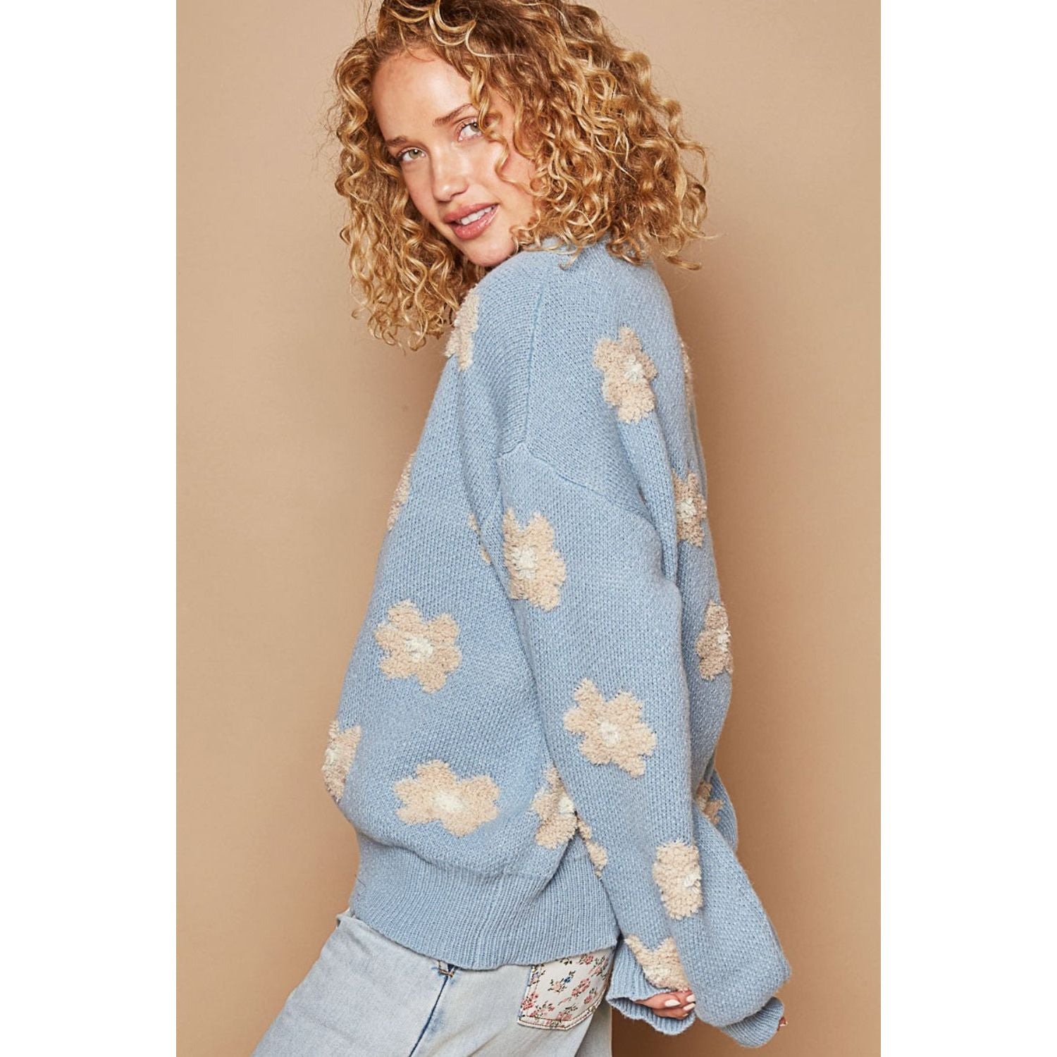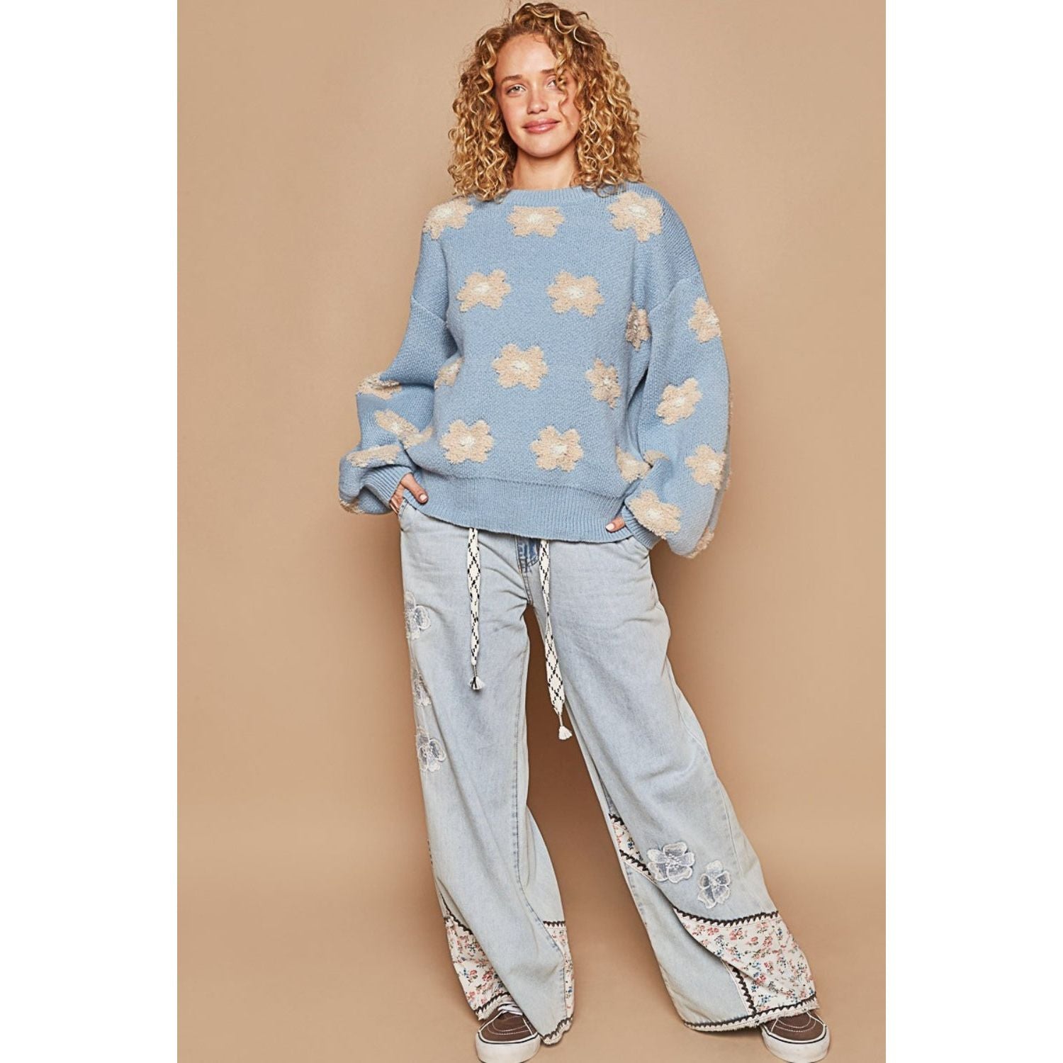 Great choice! A round neck, long sleeve, oversized fit sweater top in acrylic with a daisy pattern is a stylish and comfortable option for your wardrobe. The daisy pattern adds a fun and trendy touch to the design, making it perfect for both casual and dressier occasions. Enjoy wearing this cozy and chic sweater top!