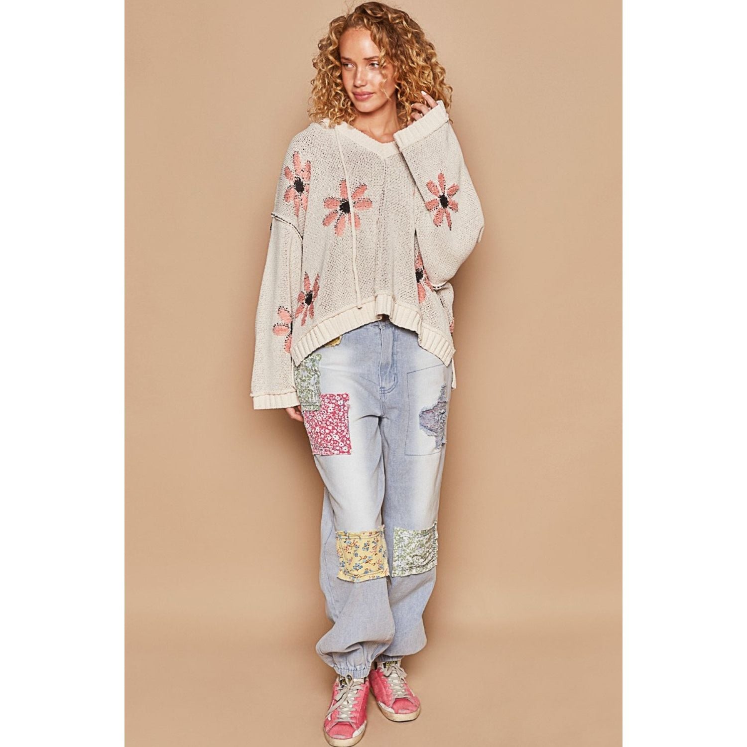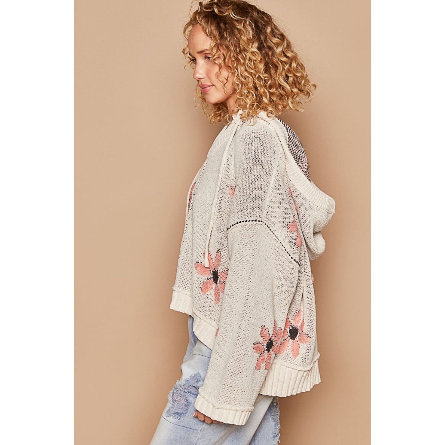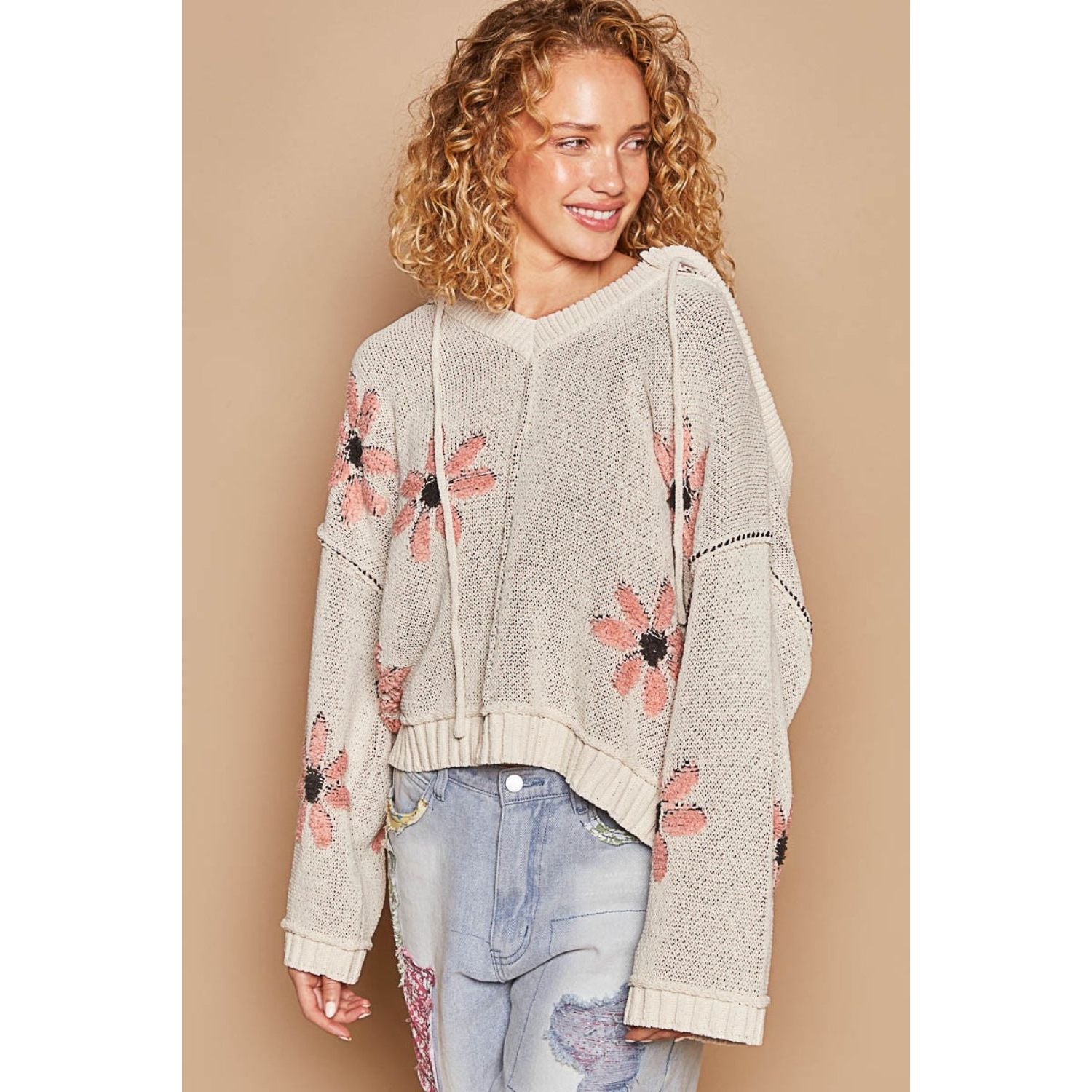 POL Floral Pattern Hooded High-Low Sweater