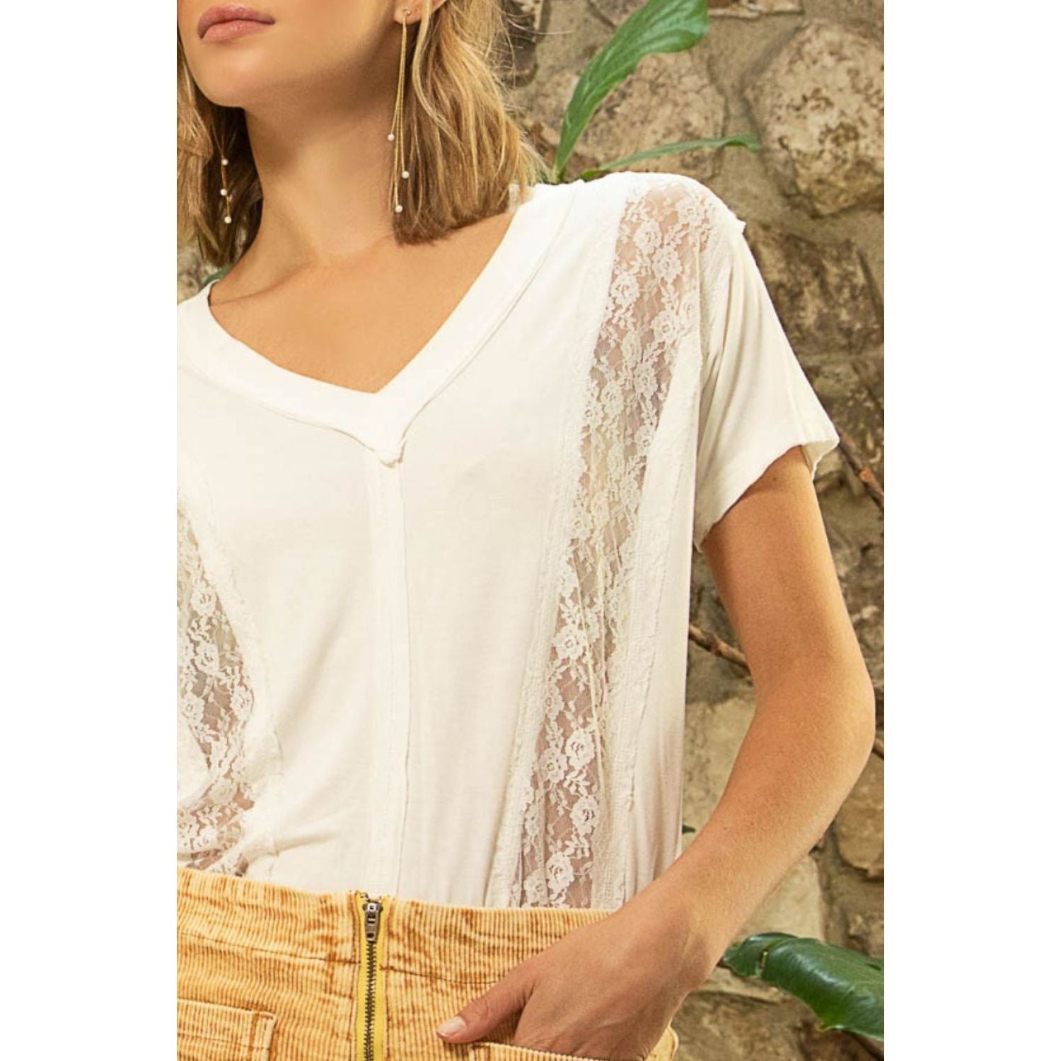 POL Inset Lace Outseam Detail Short Sleeve V-Neck T-Shirt
