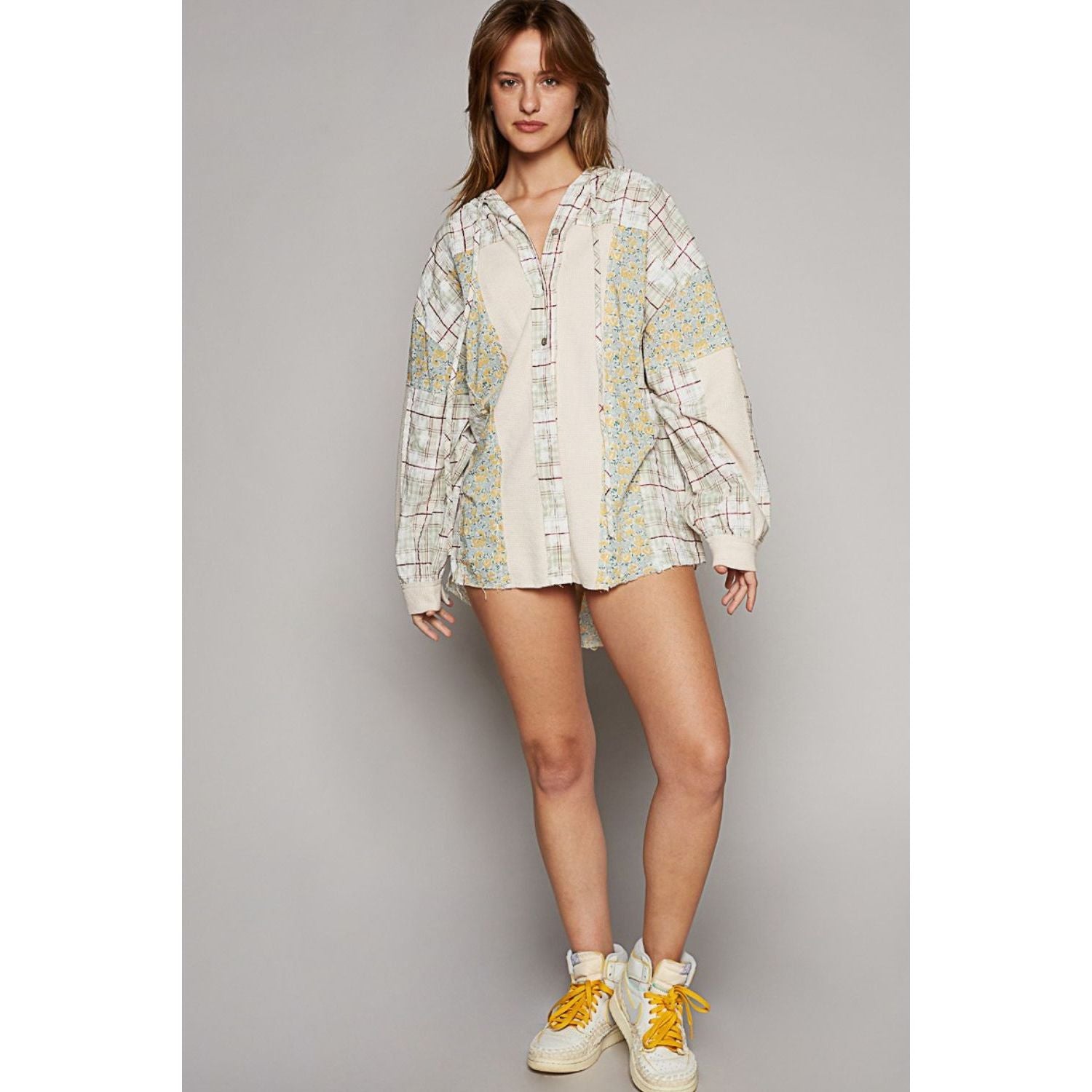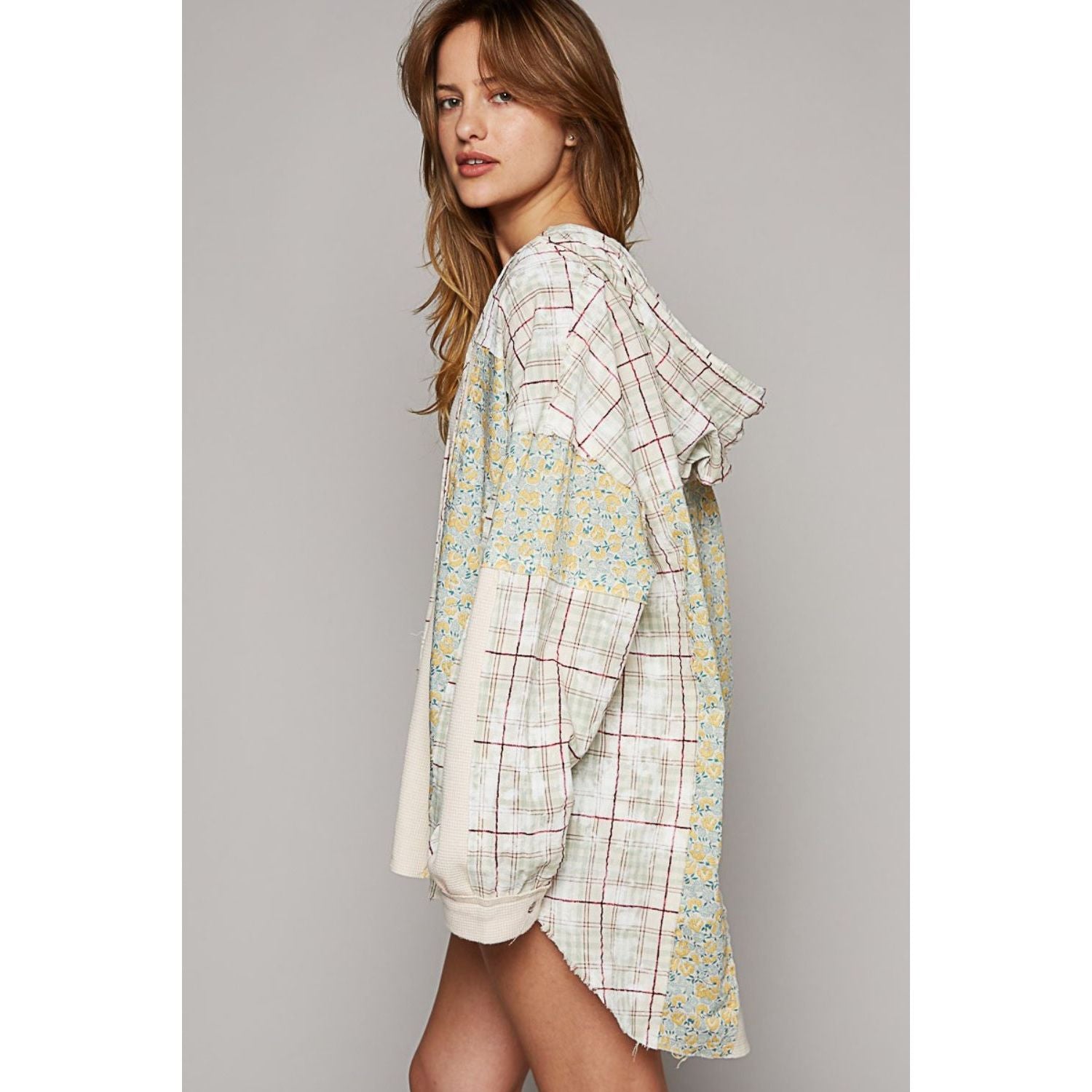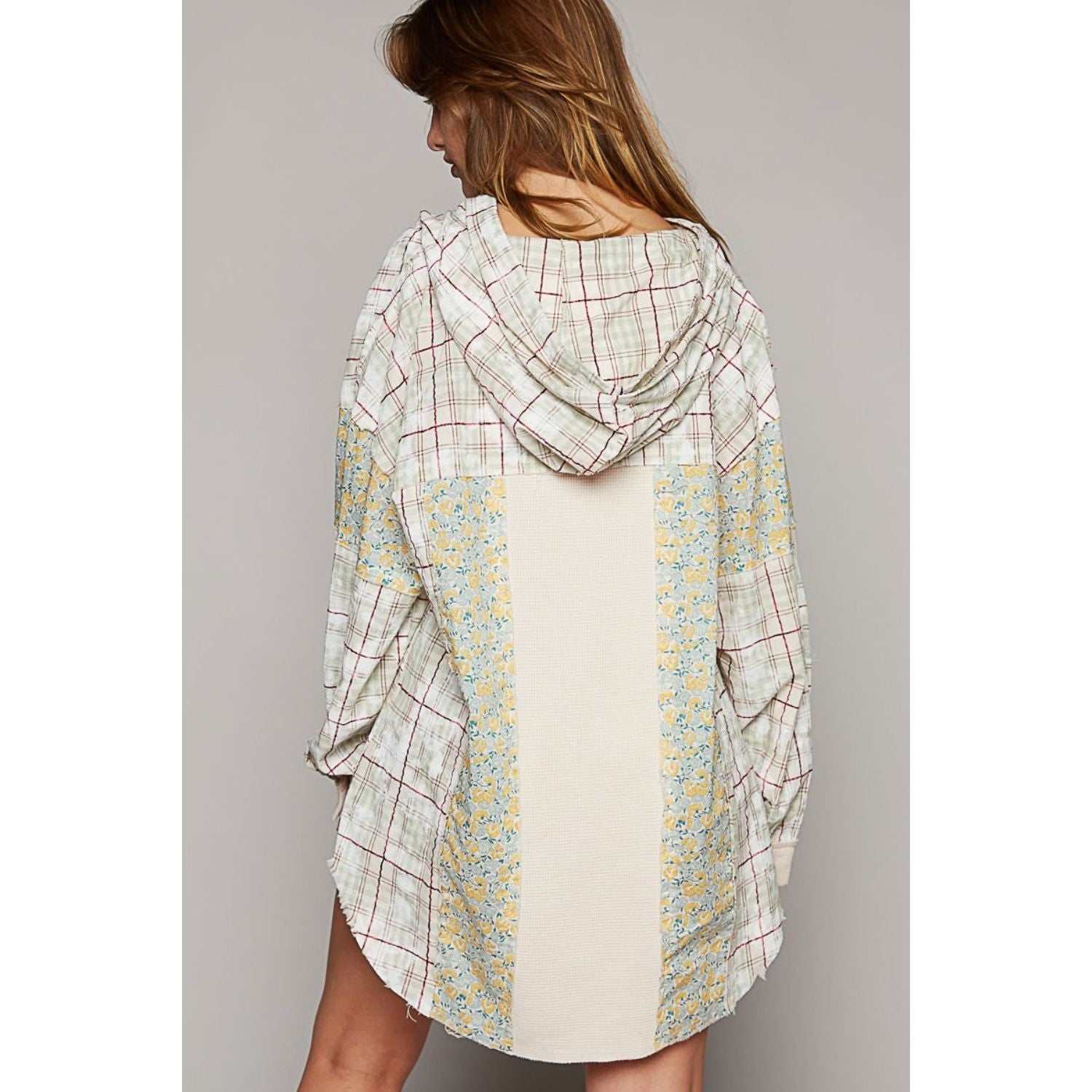 POL Long Sleeve Knit Mixed Hoodie Plaid Shirt