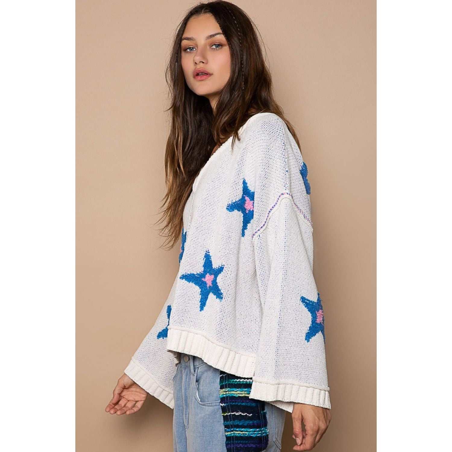 The V-neck Long Sleeve Sweater is a stylish top designed with unique details to make a statement. Featuring a regular fit and long sleeves, this sweater offers a comfortable and flattering silhouette. The standout elements include an out seam detail, color-blocked star berber patch, rib band point, and reverse out seam point, adding an edgy and modern twist to the classic sweater design. Made with high-quality materials, this top is both stylish and cozy, perfect for everyday wear. Elevate your look with this eye-catching sweater that combines trendsetting style with comfort for a fashionable ensemble. Stay on-trend and comfortable with the V-neck Long Sleeve Sweater that is sure to make you stand out in style.
