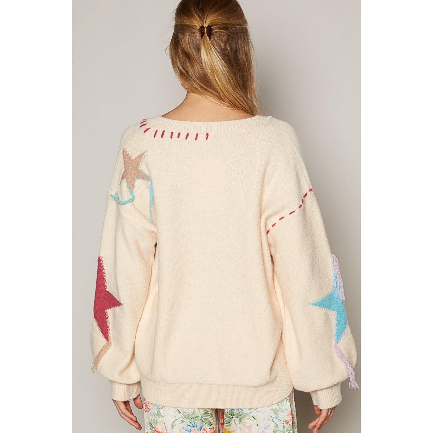 POL V-Neck Long Sleeve Star Fringe Sweater