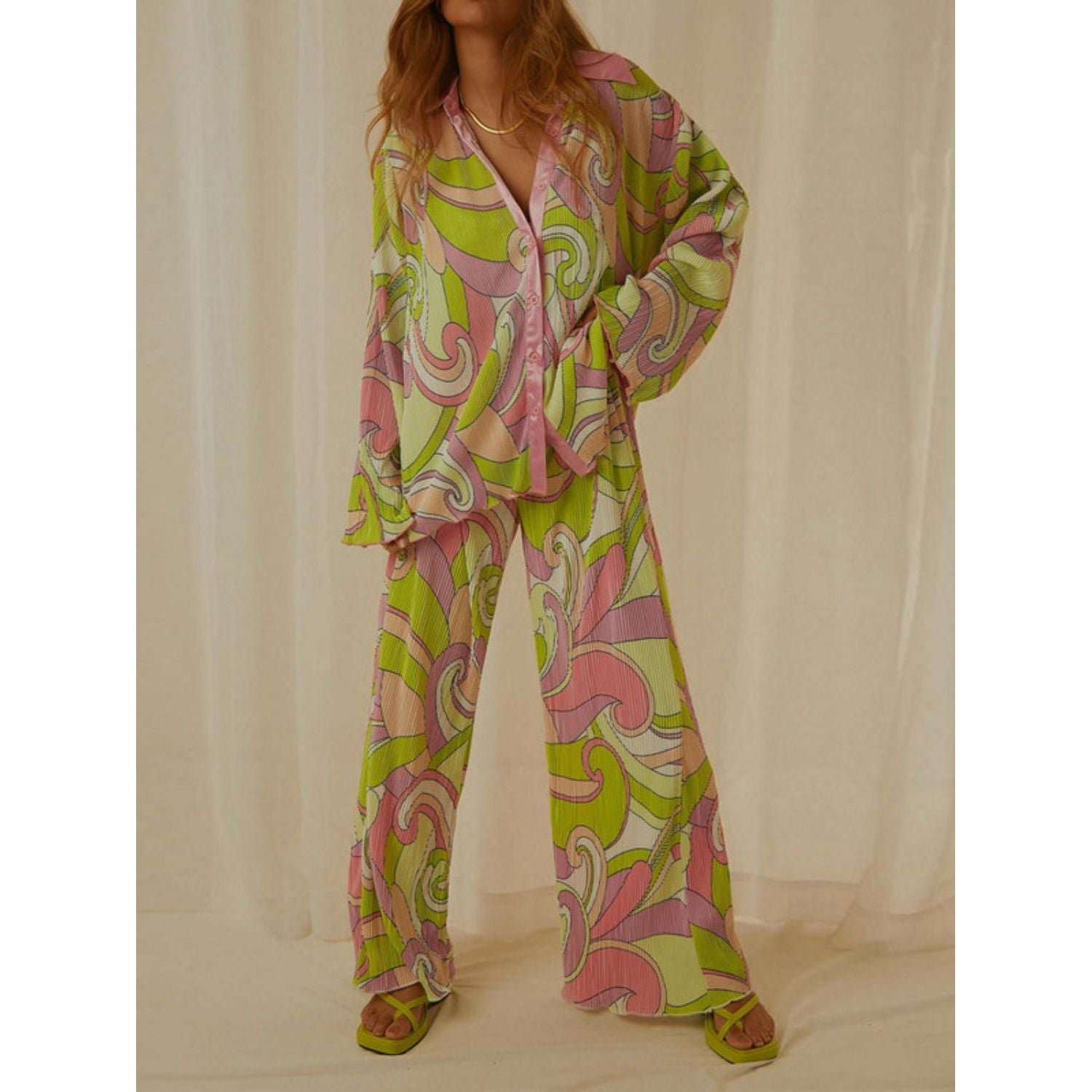 Printed Collared Neck Long Sleeve Top and Pants Lounge Set