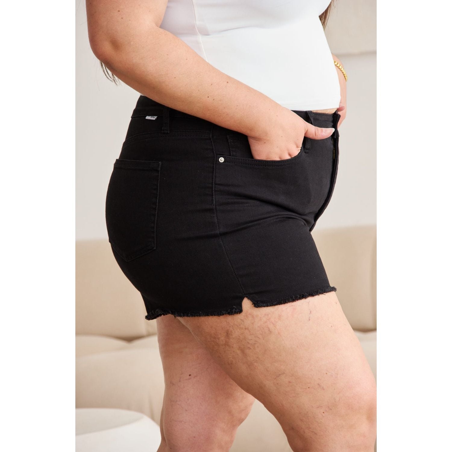 - Features: Raw Hem, Pocketed