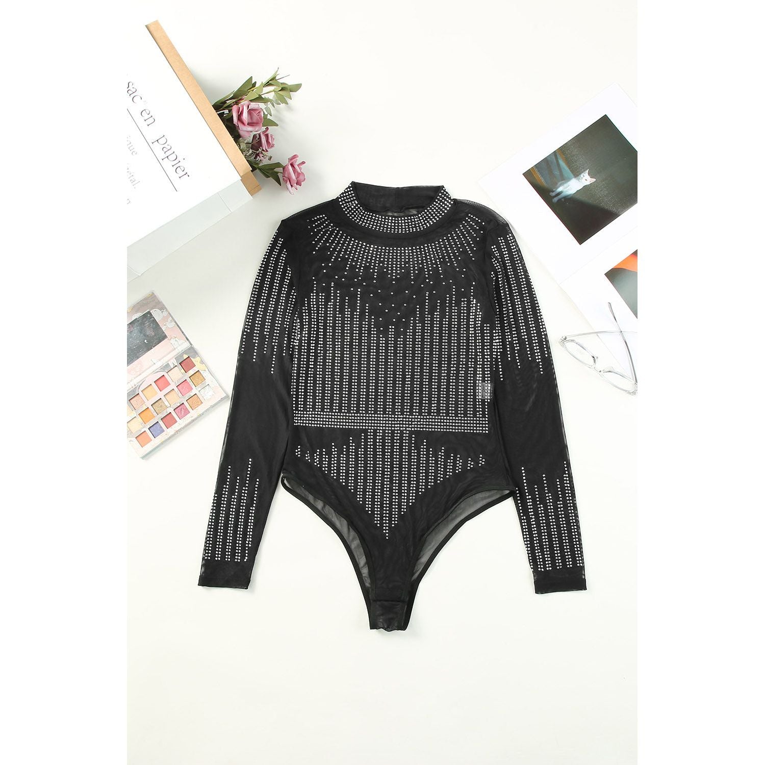 Rhinestone Round Neck Long Sleeve Bodysuit