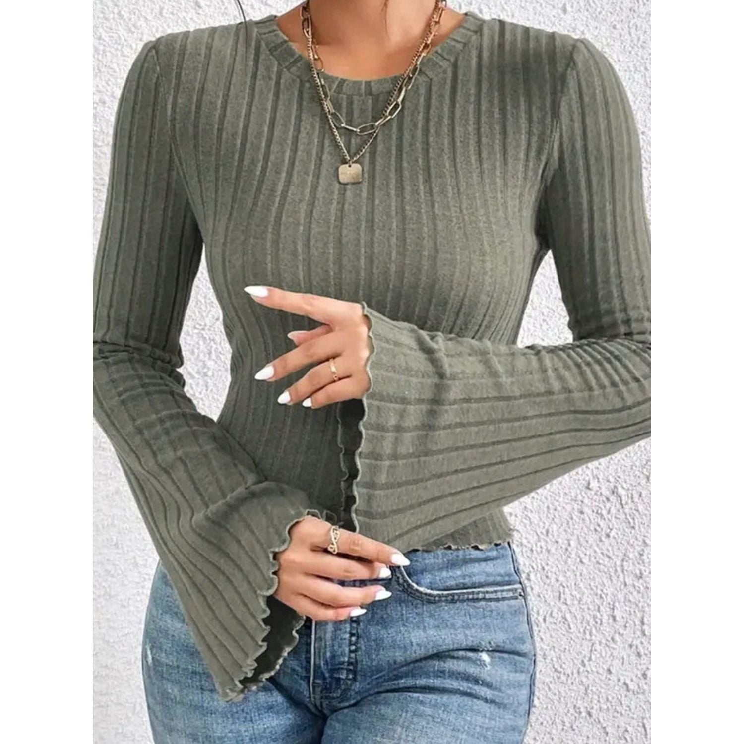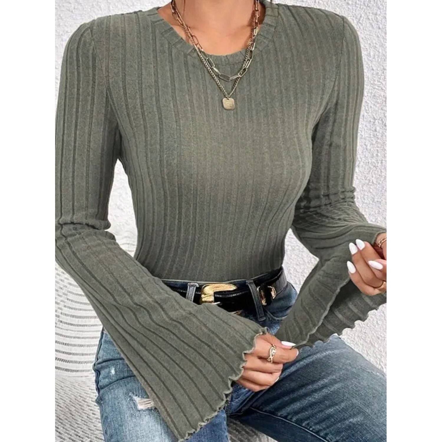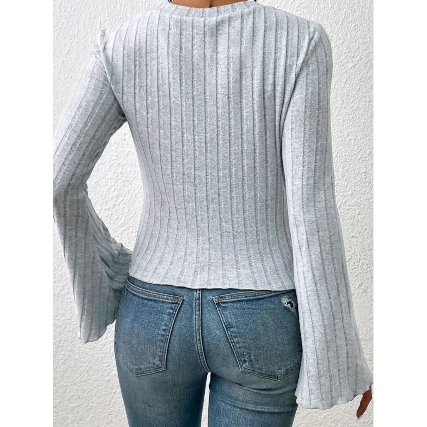Ribbed Round Neck Flare Sleeve T-Shirt