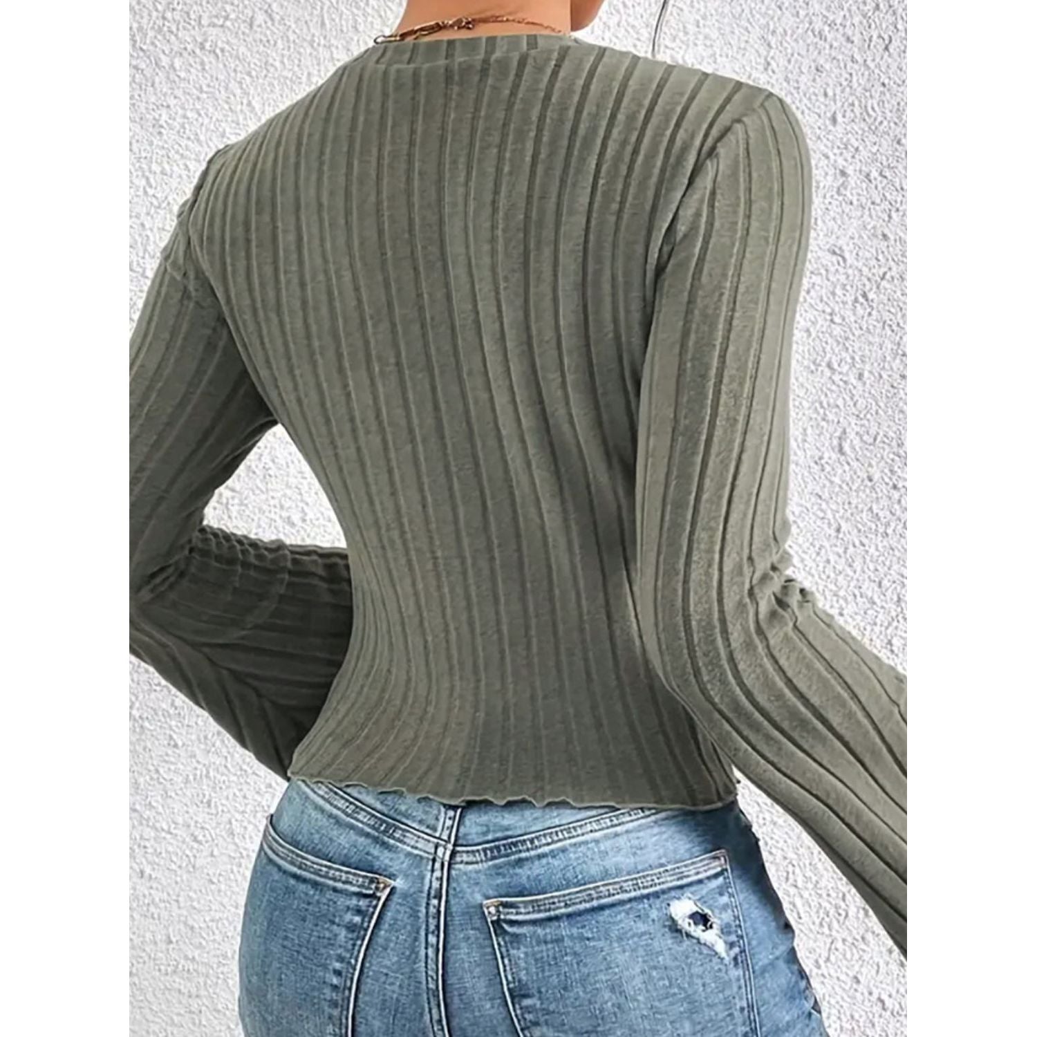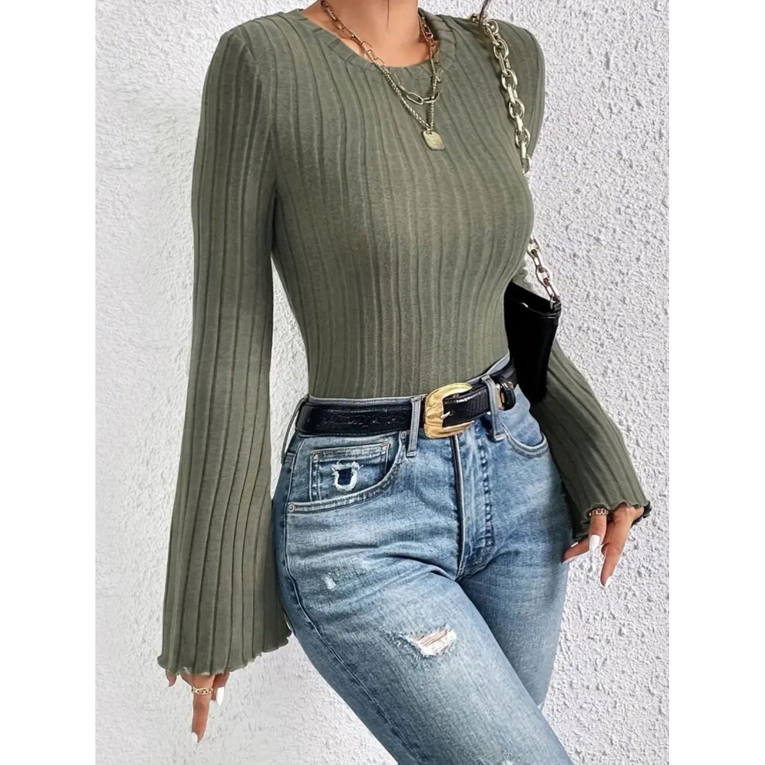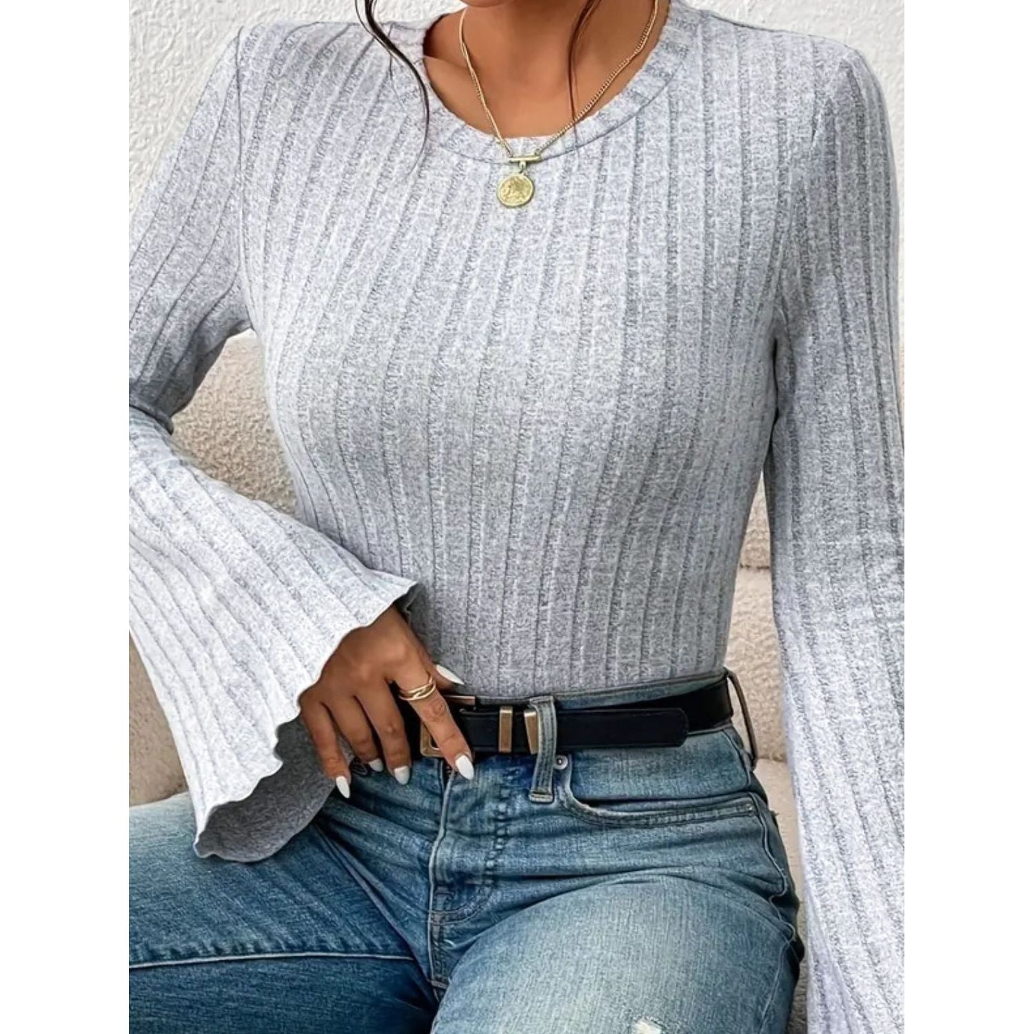Ribbed Round Neck Flare Sleeve T-Shirt
