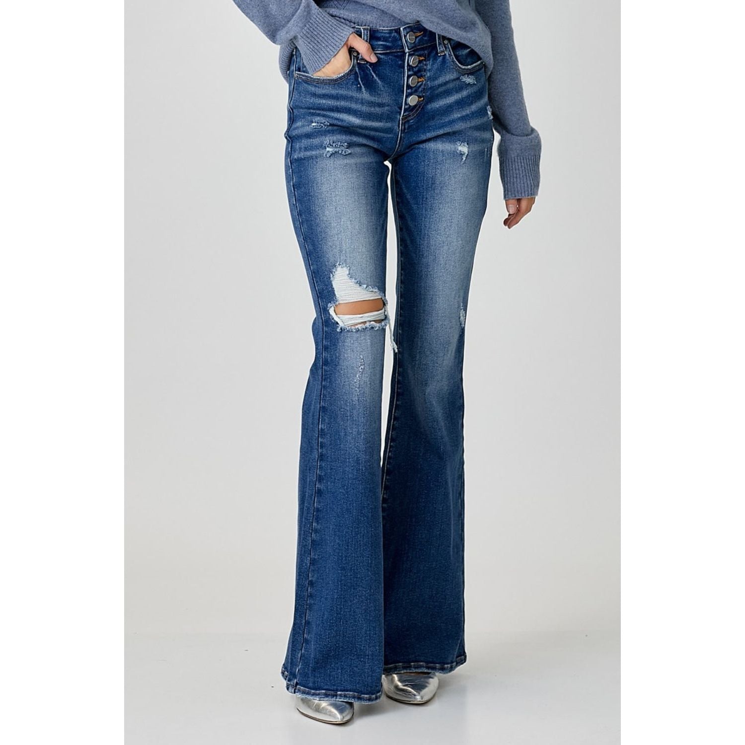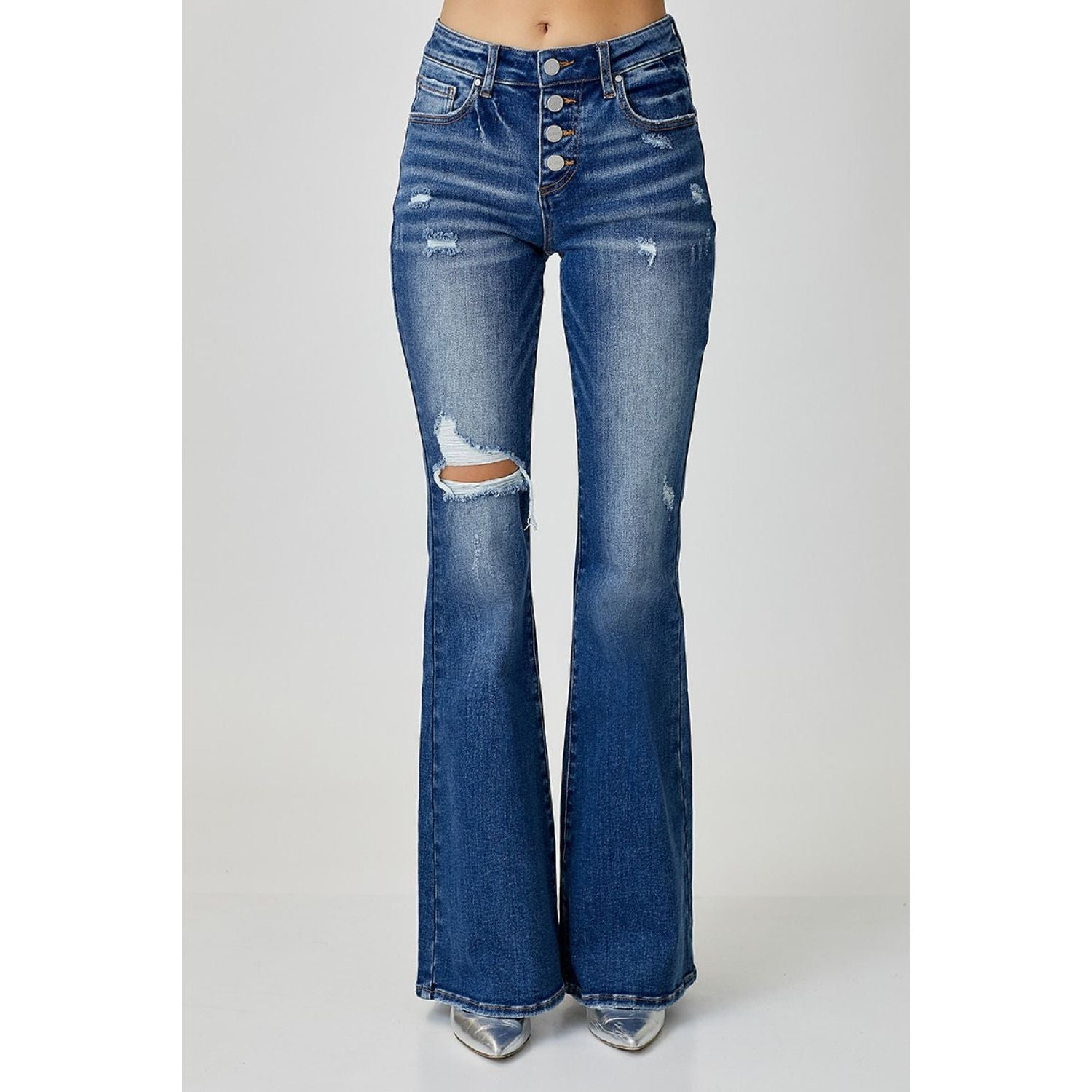 RISEN Distressed Button-Fly Flare Jeans