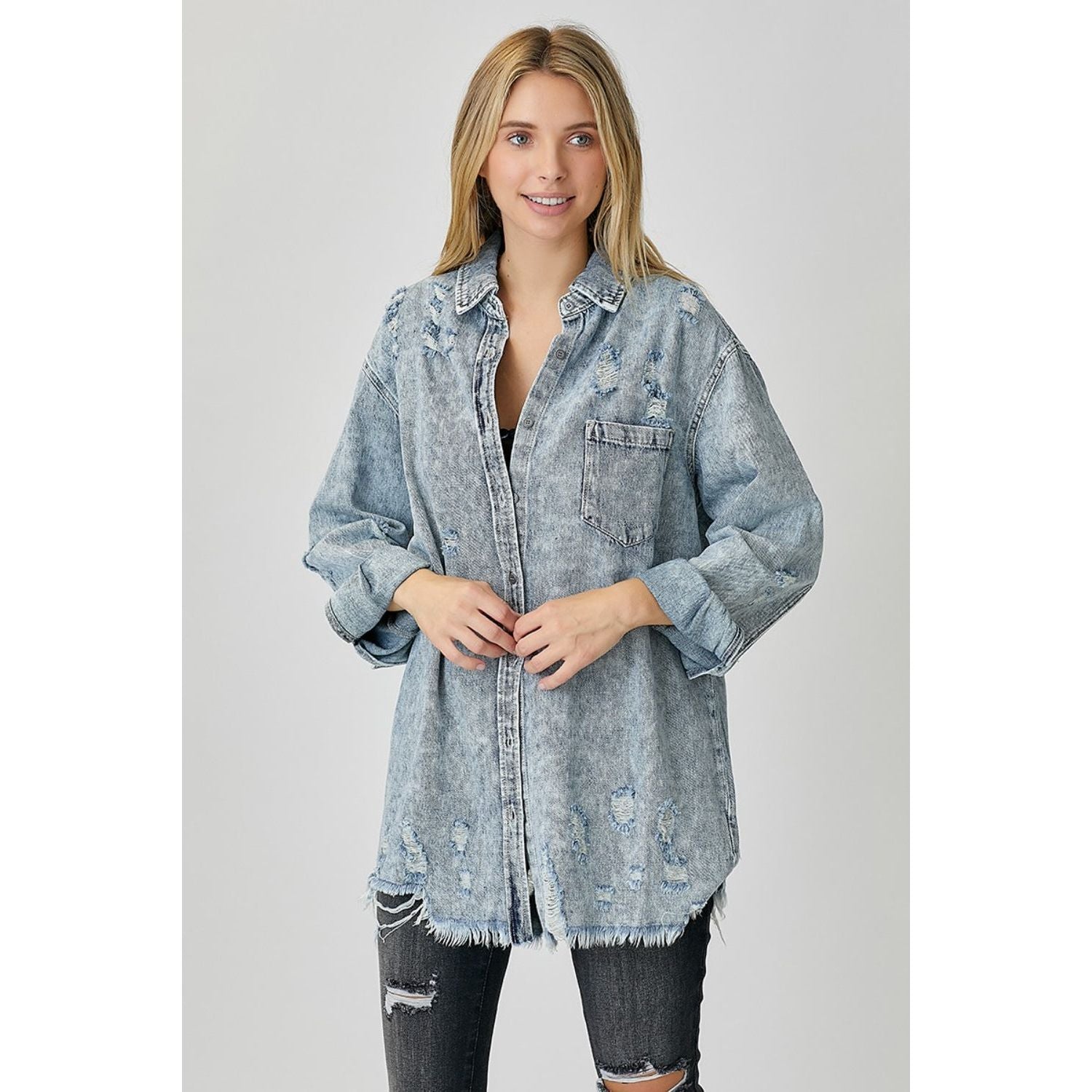 A distressed raw hem denim shirt is a casual and edgy wardrobe staple that exudes a laid-back vibe. This type of shirt typically features a classic denim fabric that has been distressed with frayed or raw edges for a rugged and worn-in look. The raw hem adds a touch of texture and character to the shirt, giving it a unique and stylish appeal. You can style this denim shirt in various ways, whether you wear it buttoned up as a standalone top or layer it over a tank top for a more relaxed feel. Pair it with jeans, shorts, or skirts for a cool and effortless outfit. The distressed raw hem denim shirt is a versatile piece that can easily elevate your casual looks with its trendy and vintage-inspired aesthetic.