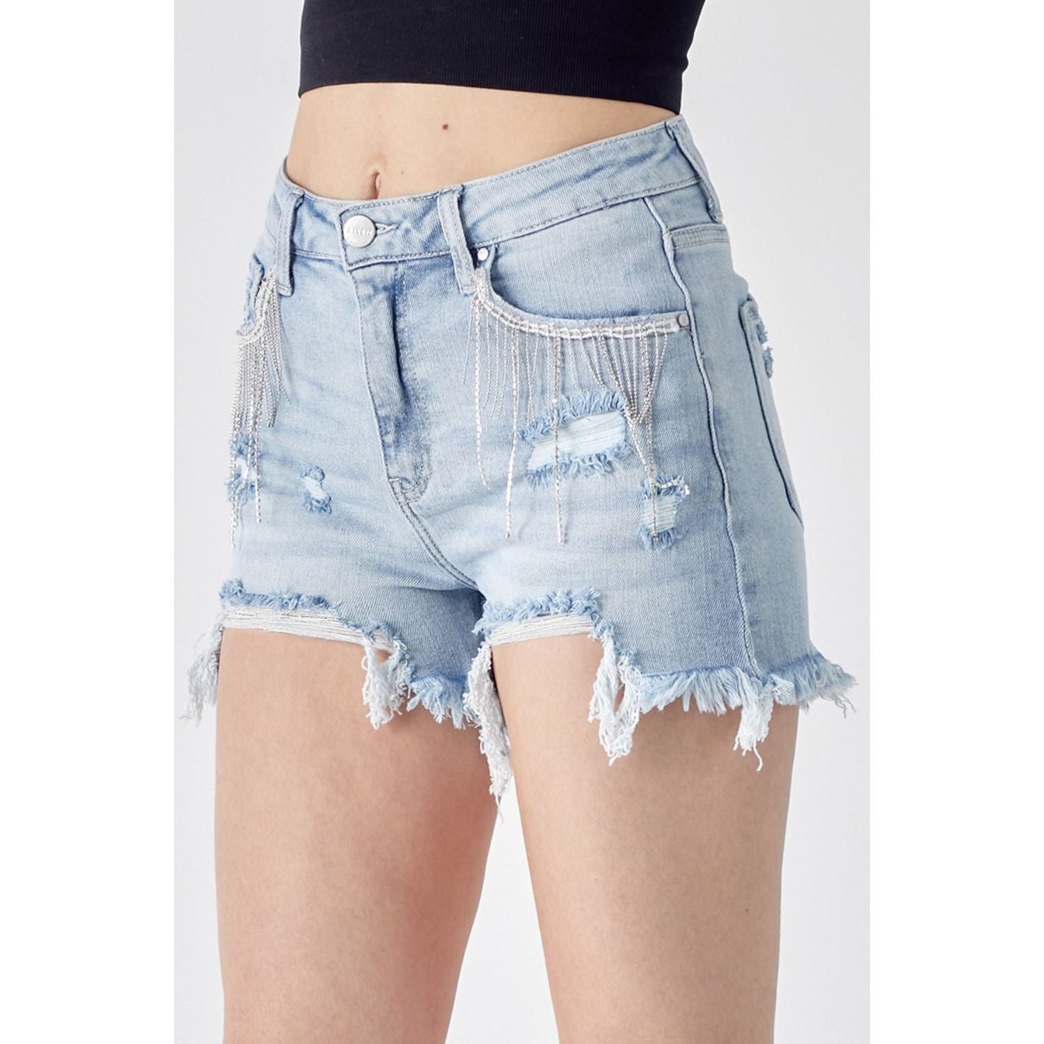 RISEN Frayed Hem Denim Shorts with Fringe Detail Pockets