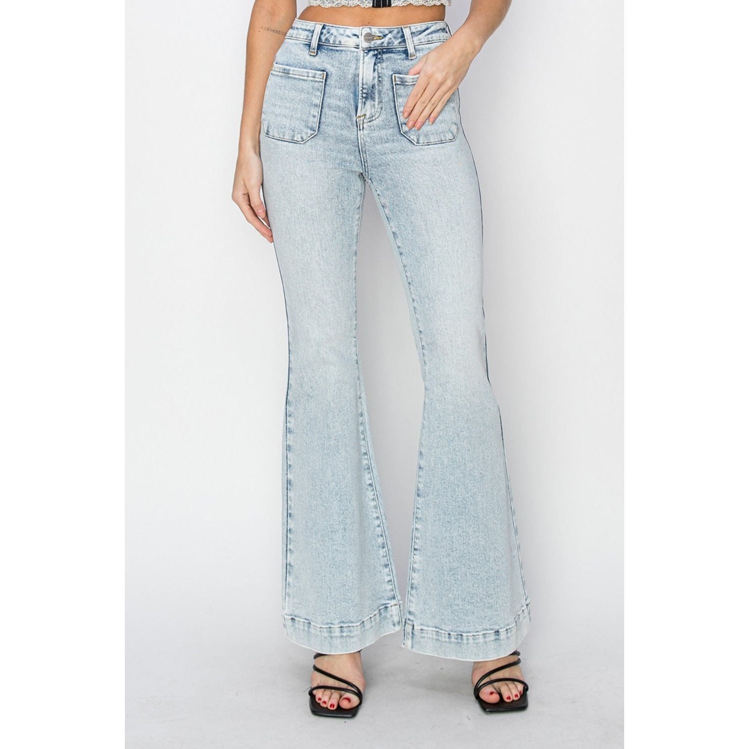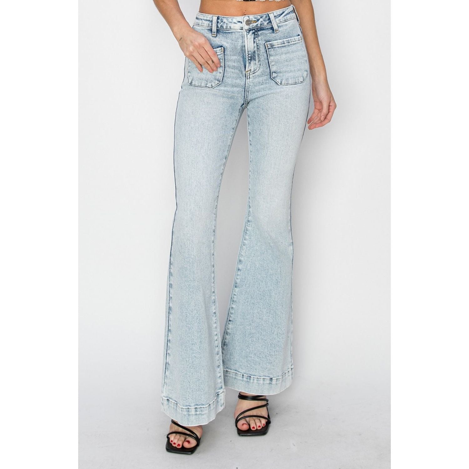 Risen Full Size High Rise Front Patch Pocket Flare Jeans