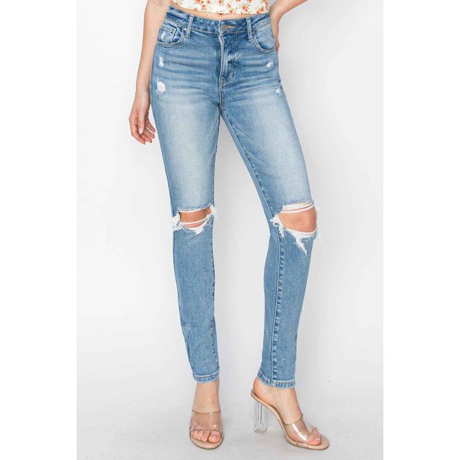 The High Rise Knee Distressed Skinny Jeans are a must-have for any fashion-forward wardrobe. Featuring a high-rise waist and skinny fit, these jeans offer a flattering silhouette that hugs your curves in all the right places. The distressed detailing at the knees adds a trendy and edgy touch to the classic design. Perfect for both casual and dressy outfits, these versatile jeans can be dressed up with heels or down with sneakers. Pair them with a flowy blouse or a fitted top for a chic and stylish look. Upgrade your denim collection with these stylish and versatile High Rise Knee Distressed Skinny Jeans today!