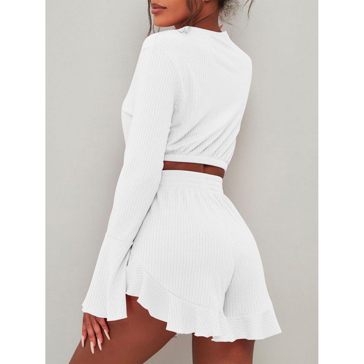 Round Neck Long Sleeve Top and Ruffled Shorts Set